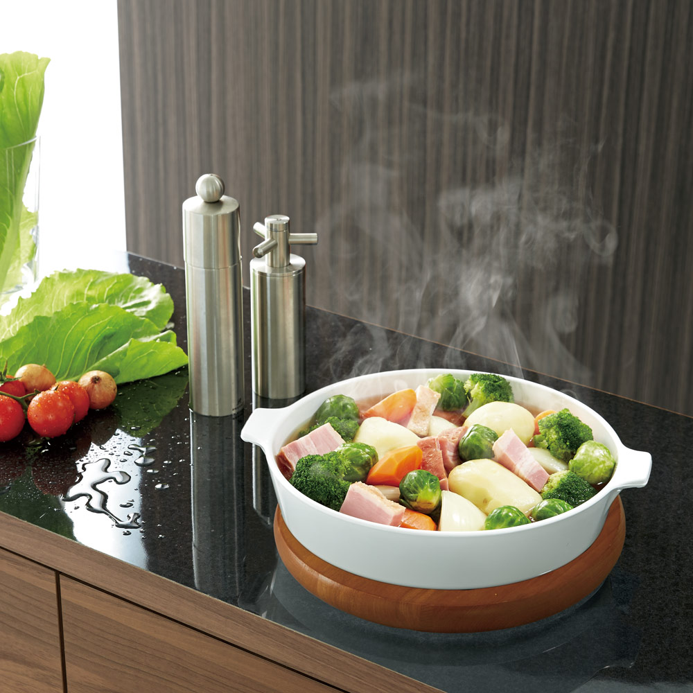黒御影石調メラミン天板 熱に強いので調理中の鍋の一時置きも安心。汚れやキズにも強くお手入れが簡単です。