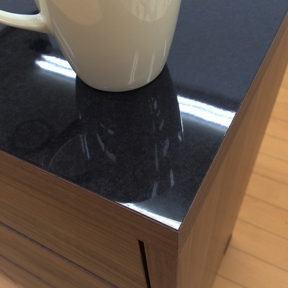 天板は光沢感とリアルに再現された御影石の質感が美しいメラミン素材。ブラックの天板にお気に入りの食器が移りこむのも素敵。