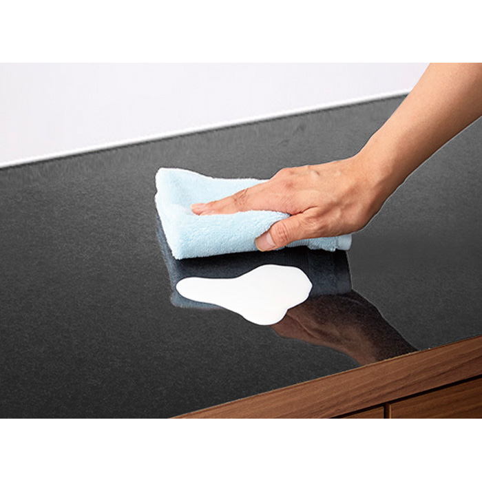 天板に使用したブラックのメラミン材は、昨今システムキッチンにも多く見られる黒御影石をリアルに再現した表面素材。熱・キズ・汚れに強く、ボールペンでひっかいてもほとんど傷がつかないほどの丈夫さです。
