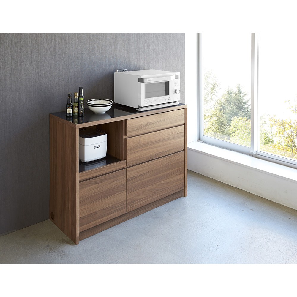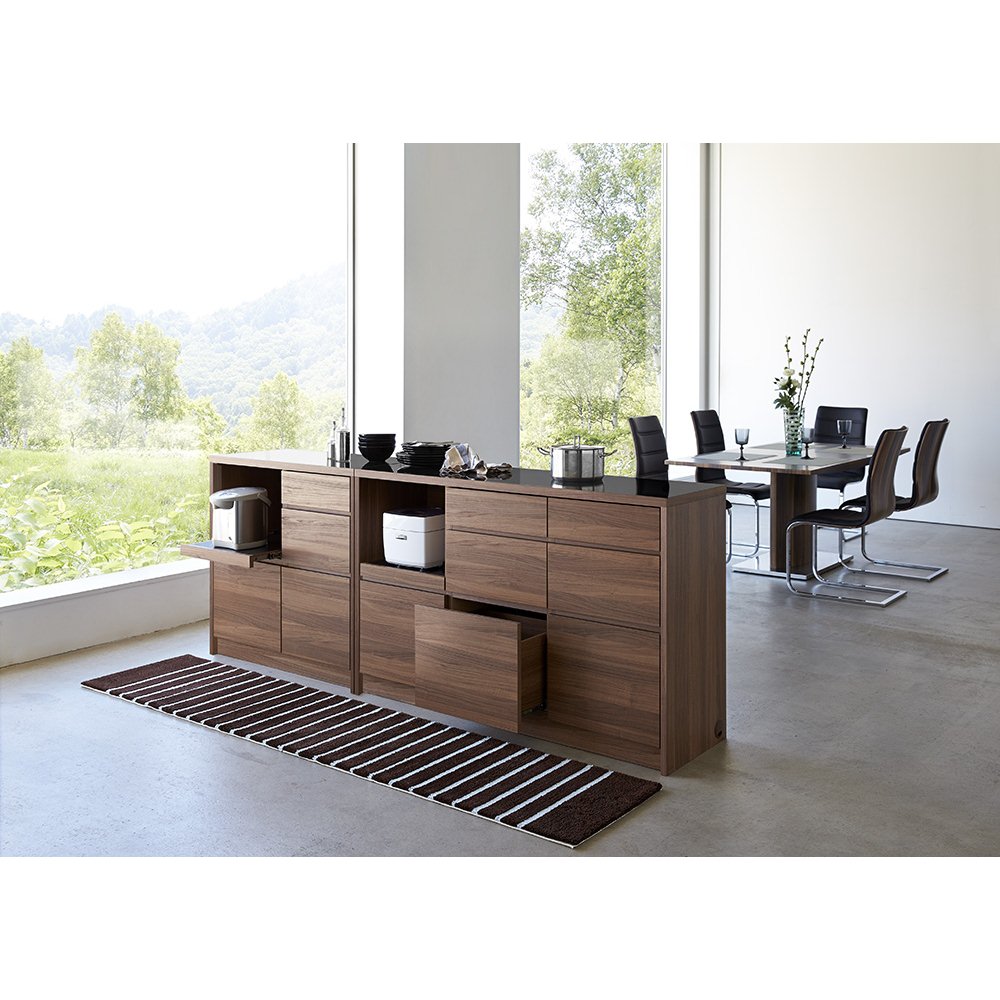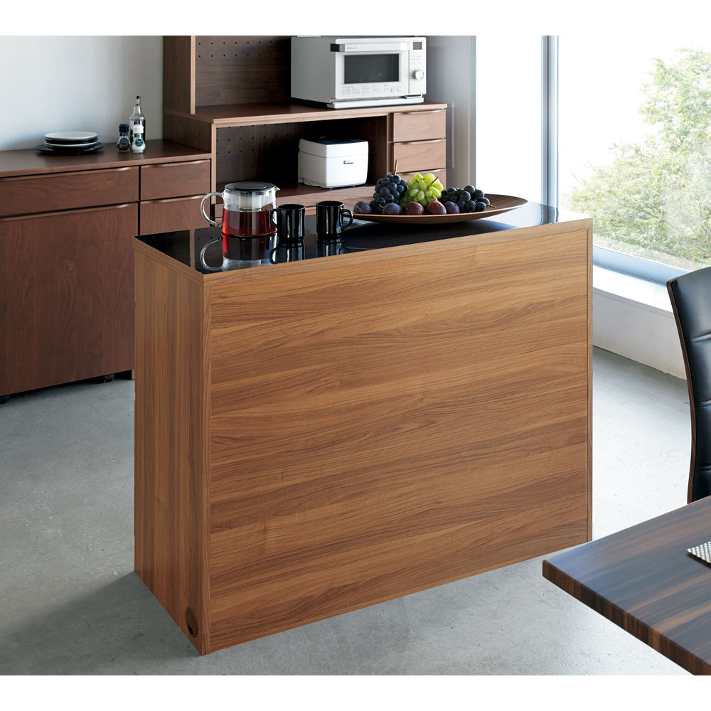 モダンでシャープなフォルムと、まるで造り付けのような美しさが魅力のおしゃれなデザインの間仕切りキッチンカウンター。輸入キッチンを思わせる洗練された黒御影石調のデザインが、キッチンとダイニングをホテルレストランのような高級感のある空間に演出します。モダンでスマートなキッチンを実現するGranite(グラニト)アイランドキッチンカウンターシステムキッチンがどんどんおしゃれなデザインになっていく昨今、それに合わせるキッチン収納も洗練されたものを選びたい…。そんな方のために、輸入キッチンをイメージさせるスマートな間仕切りカウンターをご用意しました。おしゃれなデザインだけでなく、機能性もハイクラスなシステムキッチンのそばにピッタリな設計。まるでヨーロッパのインテリア雑誌から抜け出したようなキッチンインテリアが叶います。まるで造り付けのような、間仕切り仕上のキッチンカウンター。◆背面を間仕切り仕上にしキッチンとダイニングの仕切りとしても使用できるように。◆部屋を圧迫感なく仕切ることができるので、一人暮らしの狭いキッチンや、I型キッチンのお部屋にピッタリ。◆そばにダイニングテーブルを設置すれば、配膳も楽々に。高級感漂う光る天板は、キズや熱に強い丈夫なメラミン素材。◆ダークブラウンの天板は昨今のキッチン周りにも多くみられる、黒御影石調のメラミン材を採用。◆ホワイトには大理石柄のグレー系のメラミン素材を使用◆メラミン天板は間近で見ても美しい、黒御影石を再現した高級素材です。◆熱、汚れ、キズに強いメラミン素材は、刃物や調理器具を扱うキッチン周りでも安心して使える丈夫な素材です。◆天板上で調理もできるので、サブの調理台としても活用できます。家電収納としての機能もしっかり、適材適所の素材選びにこだわった間仕切りキッチンカウンター。◆天板にはメラミンを使用し、調理台としてだけでなく、熱を持つ大型レンジなども安心して設置できレンジ台としても重宝します。◆家電ラックとして炊飯器など蒸気の出る家電を設置するためのスライドテーブルにも、天板と同じメラミン材を採用。◆メラミン材は乾いた輪染みなどもきれいにふき取ることができるので、家電台として調理家電周りでも活躍します。部屋の真ん中に置いてもおしゃれ魅せる、配線へのこだわり。◆家電を収納する以上、配線は重要な問題です。カウンター自体が美しくとも、コードがごちゃついているようでは台無し。◆配線コードを内部に通し、側面床付近に設置したコード穴から出すことで、コードを目立たせず床に這わせることが可能に。◆間仕切りとして使用せず、壁際に設置する際にも、壁面にぴったりくっつけることが出来るのも便利。◆レンジ、トースター、炊飯器、ホットプレートなどキッチン家電は全てこれ1台にまとめて収納できます。インテリアとしても美しい、シャープでスマートなフォルムのキッチン収納。◆どこから見ても美しく見えるよう、不要な凹凸を可能な限り排除し、すっきりとしたかたちに仕上げました。◆シャープなシルエットがウォルナット調の本体と光沢のあるブラックの天板をよりスマートに見せてくれます。◆無駄のない凛とした立ち姿は、ダイニングや台所を大人の上質な空間へと演出するのに一役買ってくれそうなレンジラックです。家事をサポートする機能面にも自信ありのアイデア収納。◆見た目の美しさだけでなく、日々のお料理の時間をサポートするための機能も満載。◆引き出しとスライドテーブルは全段ストッパー付きスライドレールを採用し、奥までしっかり見渡せる仕様に。◆たっぷり収納できるので、買い置きを保管するキッチンストッカー、食品ストッカーとしてもお勧めです。◆ダークブラウンは、引き出し内部も本体と同じウォルナット調で仕上げ、美しさと収納物に配慮しました。信頼と安心の国内工場での生産品のキッチンラック◆国内の職人がひとつずつ丁寧に仕上げた食器棚、キッチンボードです。◆細部の丁寧な仕上がりなど、国産品ならではの高品質なダイニングボード・カップボードをお楽しみください。◆素材はグレードの高い「F☆☆☆☆」材を使用しました。※「F☆☆☆☆」材とは…JISにより定められている安全性の高い規格。人、環境にもやさしい素材です。