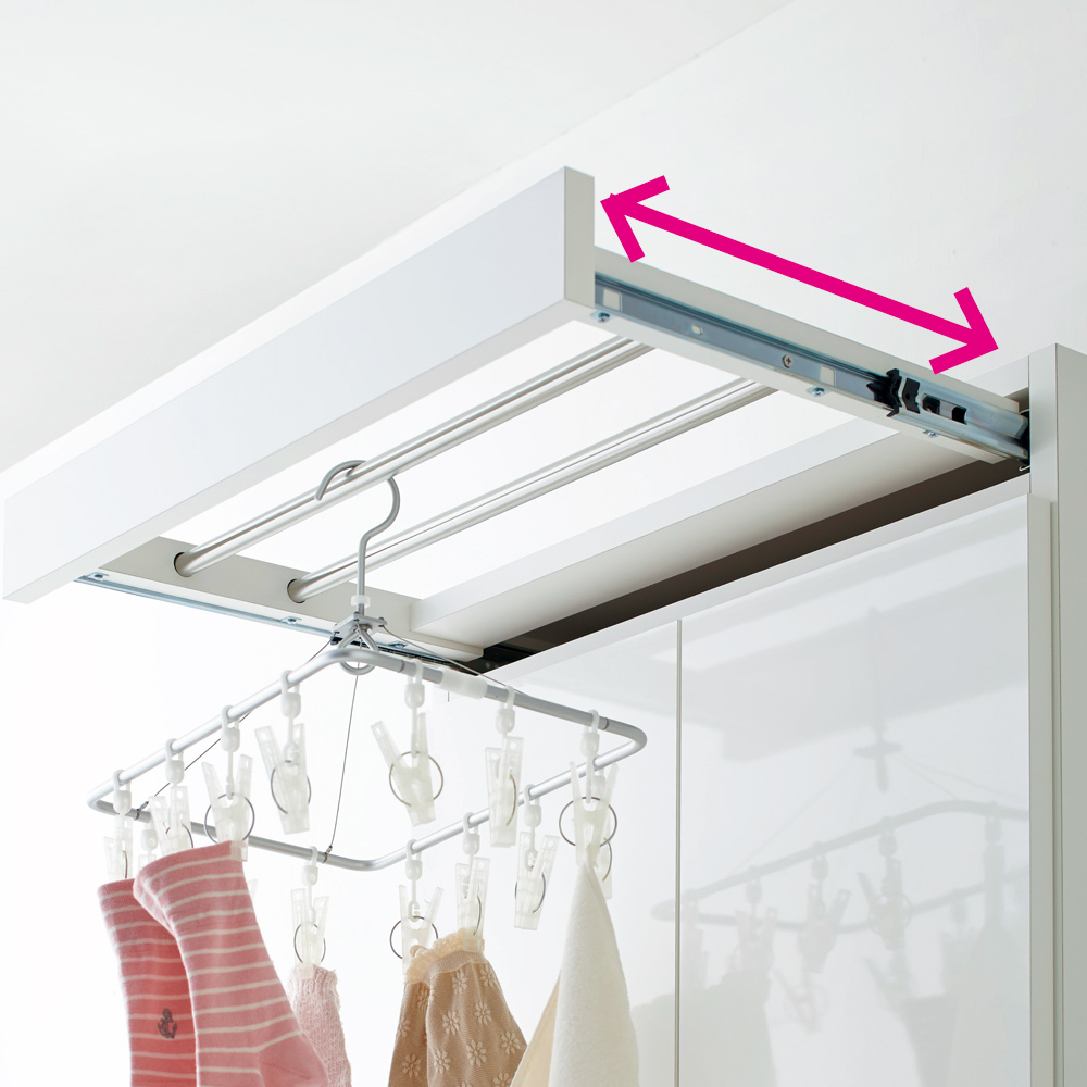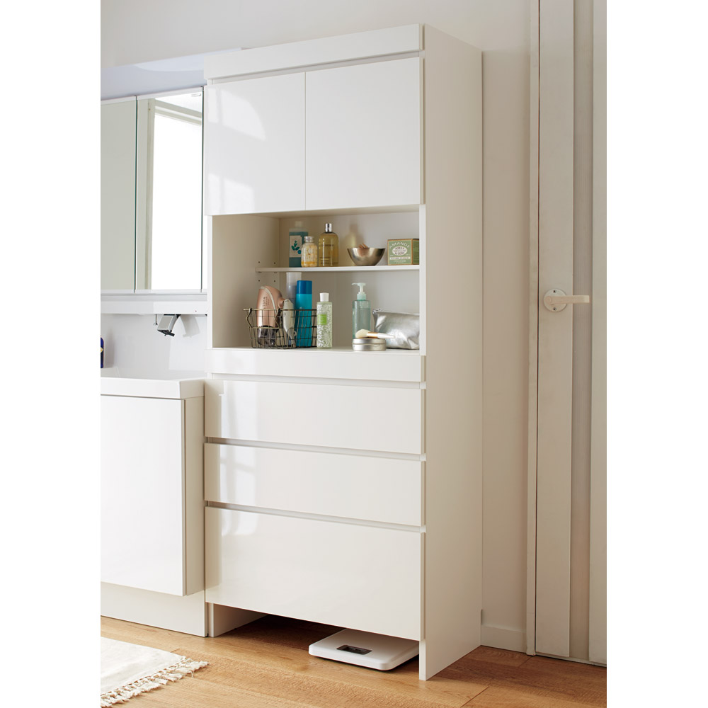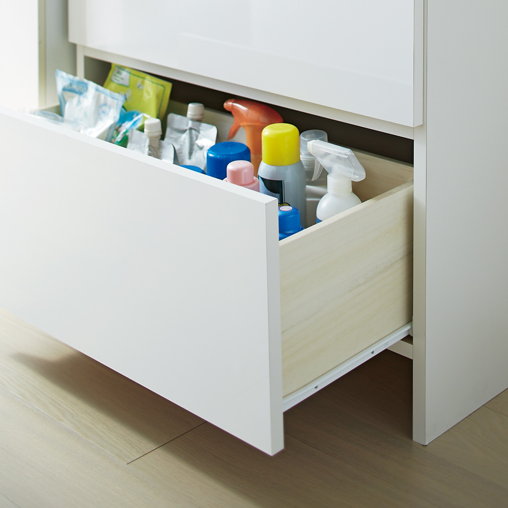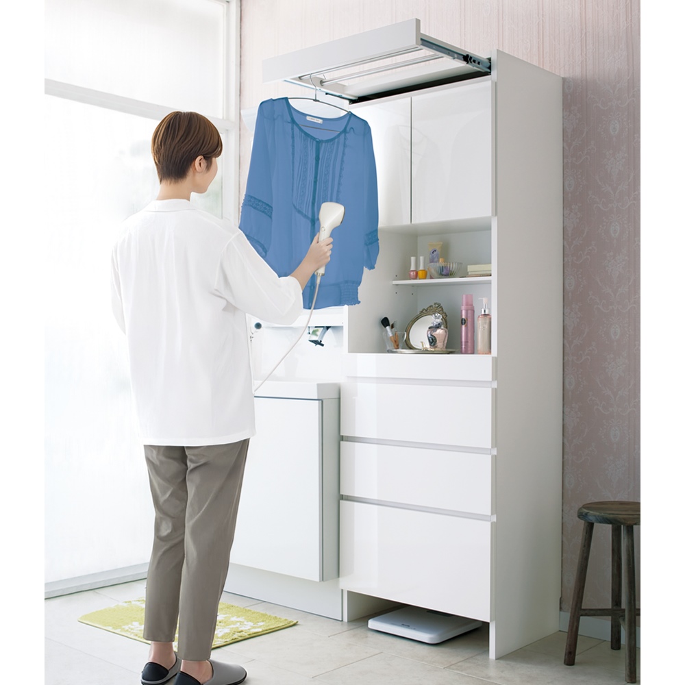 身支度の時も家事の時間も、いつだってストレスは軽減したいもの。洗濯物のシャツをちょっとかけておけるハンガーバーと、お化粧やヘアセットに便利なスライドテーブルを使いたい時に引き出せるおすすめのチェストです。奥行たっぷりの引出しがついているから、ボトルやタオル・衣類だって一気に収納できます。ワガママに応える頼もしいサニタリーチェストが、忙しいあなたの大切な「自分タイム」をサポートします。洗面所の不便を解消する便利なスライド機能●上部に格納された「ハンガーバー」は、洗濯時にシャツを干したり、着替え用のパジャマをかけたり、使っていないハンガーの一時置きにも便利です。●ゆっくりお化粧やスキンケアをしたい時は「スライドテーブル」をひきだして。洗面所が簡易ドレッサーに変身します。●必要な時だけさっと引き出して使えるので、スペースを有効活用できます。奥行40.5cm 収納力たっぷりの引出●全段スライドレール付きなので、物をたくさん入れて重たくなってもスムーズに引き出すことができます。●一番下の引き出しは深くなっているので、背の高い柔軟剤ボトルや掃除用具の収納にもぴったりです。湿気の多い場所でも安心の光沢仕上げ ●水ハネや汚れに強く、洗面台や洗濯機の横などの水周りでも安心してご使用いただけます。●光沢仕上げで清潔感のある明るいサニタリールームを演出します。国産品ならではの設置ストレス軽減アイデア●組立不要の完成品ですので、届いたらすぐにお使いいただけます。●幅木よけカットを施し、壁面にすき間なくぴったりつけて設置ができます。●脚部に11cmの高さがあるので通気性もよく、体重計を収納すれば省スペースにもなります。