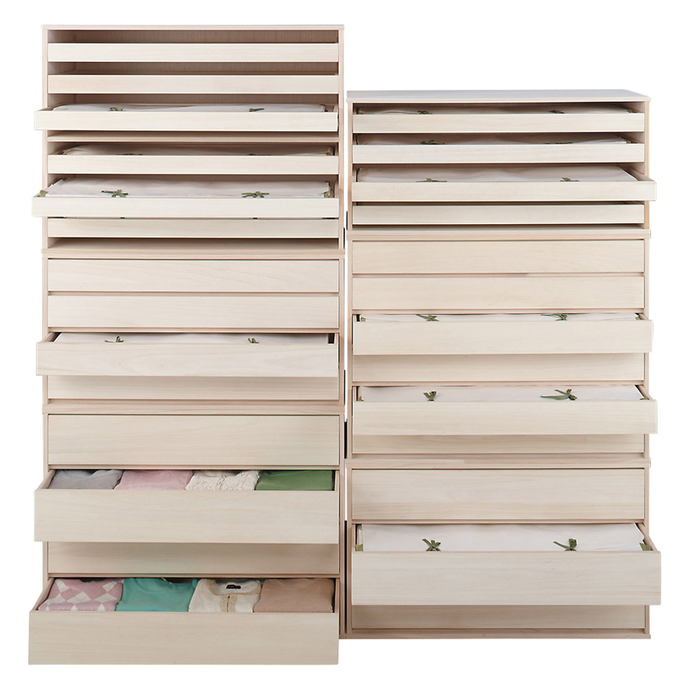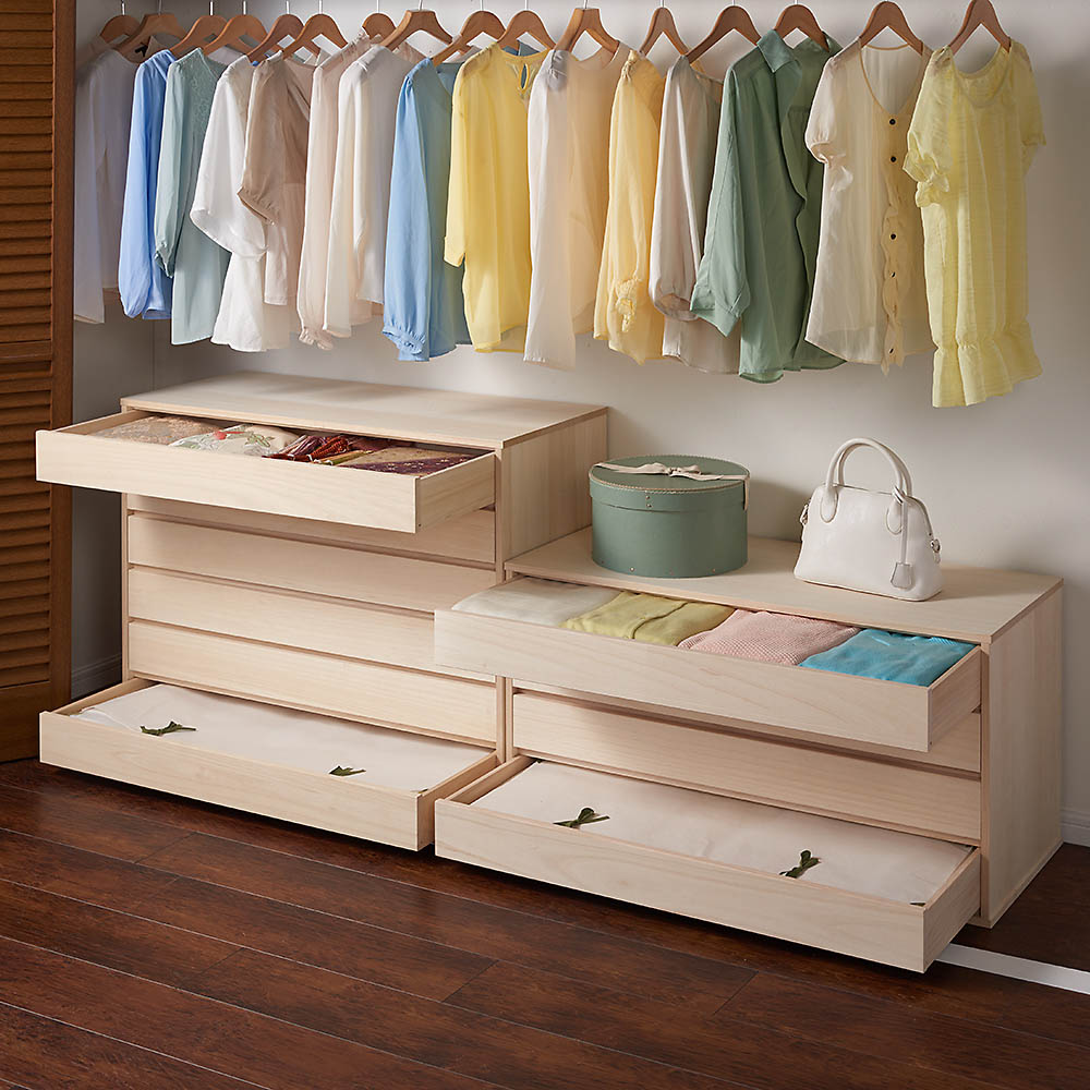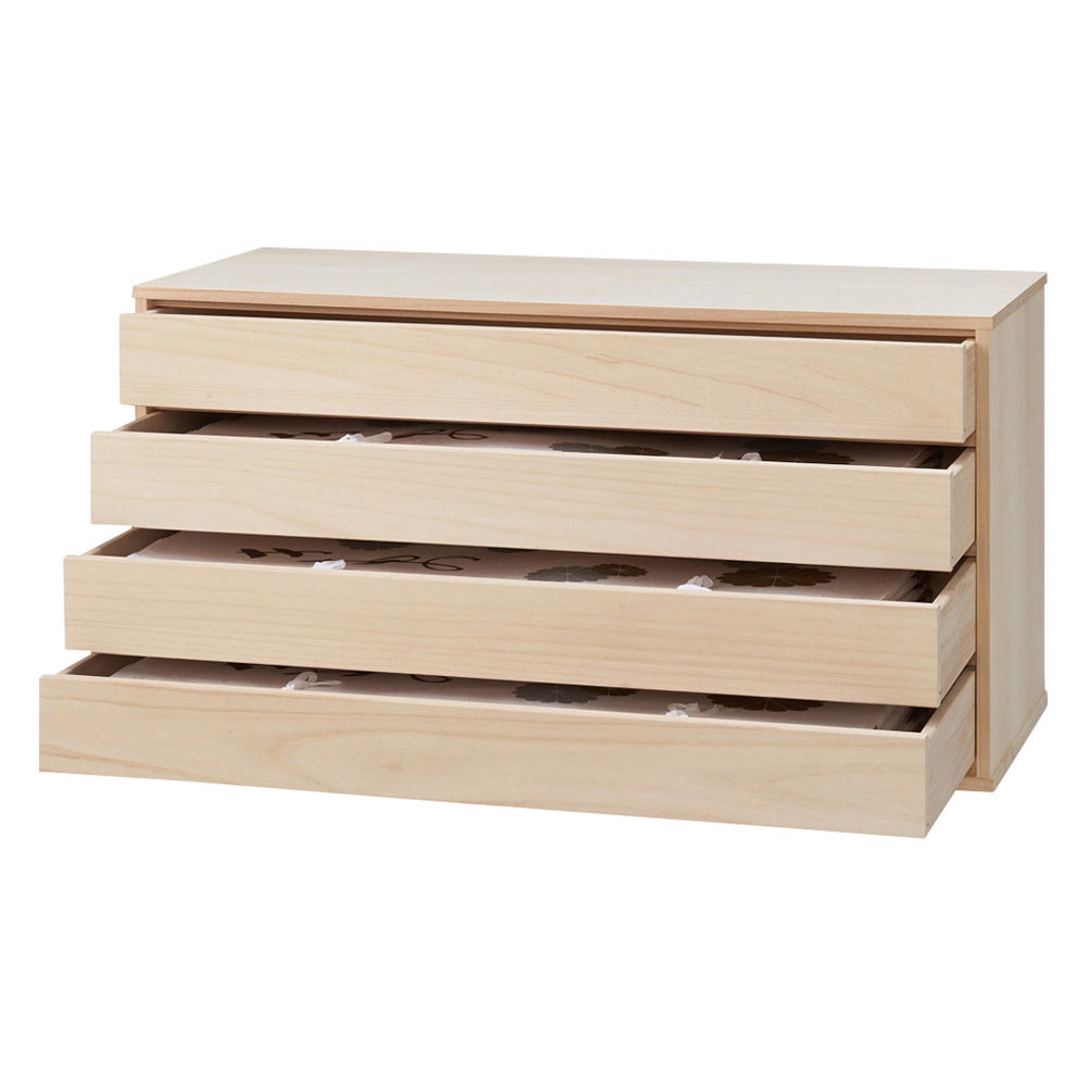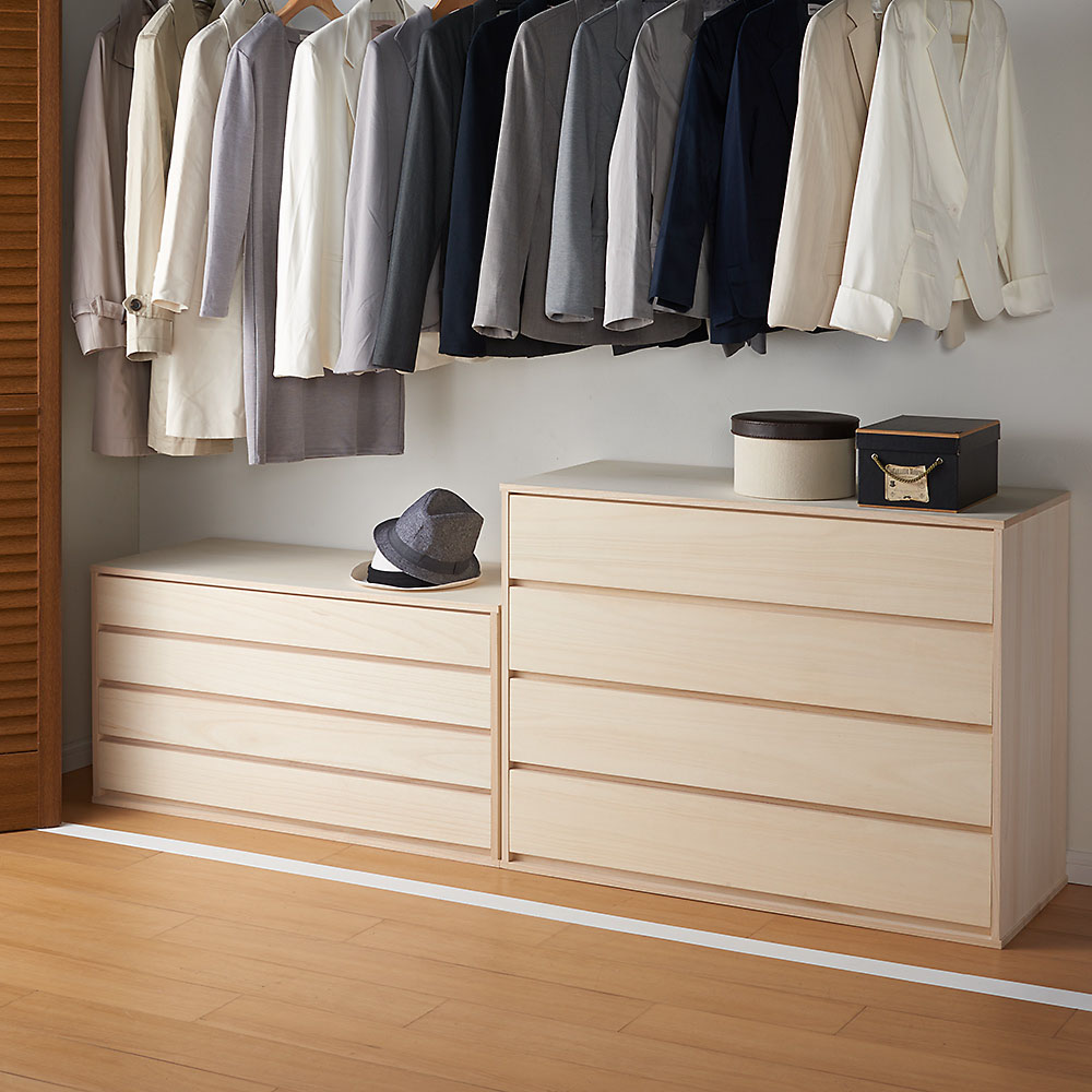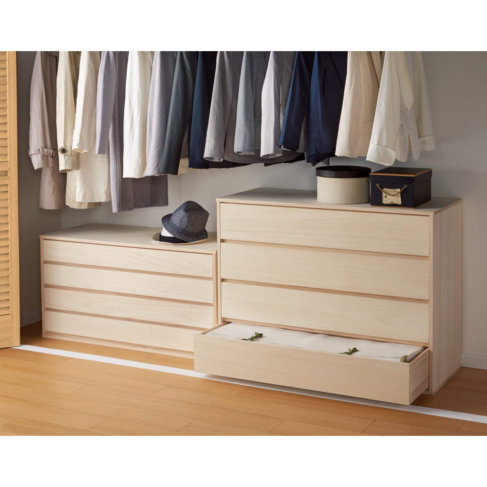 総桐で叶う、着物専用ブティック。クローゼットが着付け部屋に変身。奥行44cm・高さ75cmのクローゼットに収まる総桐の収納タンス。洋服はもちろん着物、バッグまで収まる収納バリエーション。クローゼットでも桐タンス使いたいと思っている方へ。奥行44cm・高さ75cmのクローゼットに収まる総桐の収納タンスがここにあります。衣類収納はもちろん着物まで収納できます。クローゼットが着付け部屋に変身。●タンスのサイズはシリーズ品共通の幅100奥行44高さ75cm。マンションなどの省スペースクローゼットでも収まる大きさです。収納物に合わせて選べる全4シリーズ●シリーズ品は・たとう紙収納に合わせた盆収納タイプ・オープン部にボックスで仕切りをつけたバッグ収納タイプ。・衣類収納向けベーシックな深型引き出し4段タイプ・インナーなどの薄物収納に便利な浅型引き出し6段タイプの4タイプがございます。設置場所の高さに合わせて重ねてご使用頂けます●お好みで3段まで重ねられます。☆盆収納・バッグ収納タイプの上に引き出しタイプは乗せれません。●転倒防止用にコの字金具が付属されています。前面からは見えないように裏側から固定する仕様です。こちらの商品は「引き出し・深4段」タイプです。●引き出しの内寸は幅93奥行37.5高さ14cmです。