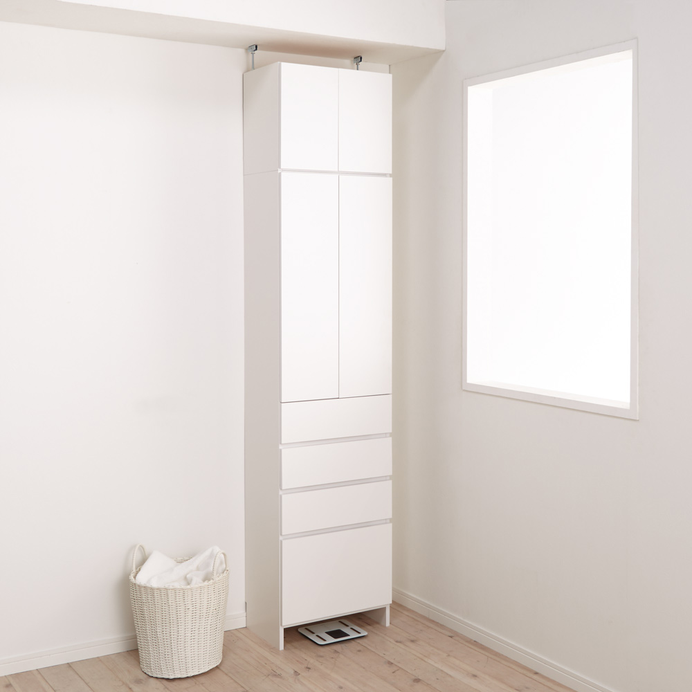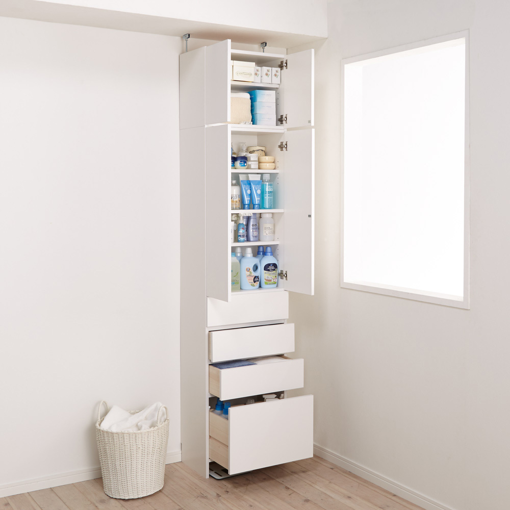 洗面所収納におすすめの組立不要の薄型収納チェスト。狭い洗面台まわりや洗濯機置き場で使える奥行31.5cmのスリムタイプです。別売の上置きを使えば天井まで収納できる日本製のサニタリーラックです。フラットなデザインでスッキリ見える奥行31.5cmの薄型収納家具●ホワイト色の清潔感が圧迫感を感じさせません、使いやすい洗面所収納です。●「薄型」の「すき間収納」を収納力をアップさせるためハイタイプにしました。●この商品は天井高184cm〜204cmまで対応する突っ張りタイプです。●フラット扉のシンプルデザイン。狭いサニタリールームにも圧迫感なく設置できます。ポイント(1)オールホワイト=清潔感と明るさを洗面所に演出します●清潔感を大切にしたい洗面所だから、キレイな白にこだわりました。●前面はポリエステル化粧合板を使用。汚れてもお手入れが簡単な素材です。ポイント(2)洗面所チェストとサニタリーラックの収納力が1つに●下部は収納場所に困るタオル収納や衣類収納に便利な引き出しチェスト。●上部は洗剤などの洗濯用品や化粧品のストックに便利な棚です。●洗面所にあると便利なハウスキーピングストック収納にもおすすめです。●柔軟剤、掃除用品、歯ブラシ、歯磨き粉、化粧乳液など洗面所に棚があると便利です。ポイント(3)完成品だからお届け後、設置すればすぐに使用できます●組み立てが不要。届いたらすぐにお使いいただけます。●脱衣所や洗濯機回り、洗面化粧台の後ろなど色々な場所にお使いいただけます。●ホルムアルデヒドの発生を最小限に抑えたF☆☆☆☆素材を使用しています。●国内で丁寧に生産された安心の国産商品です。■本体のみは天井高184〜204cmに対応。■別売りの上置き小(高さ20cm)使用時は天井高204〜224cmに対応。■別売りの上置き大(高さ40cm)使用時は天井高224〜244cmに対応。