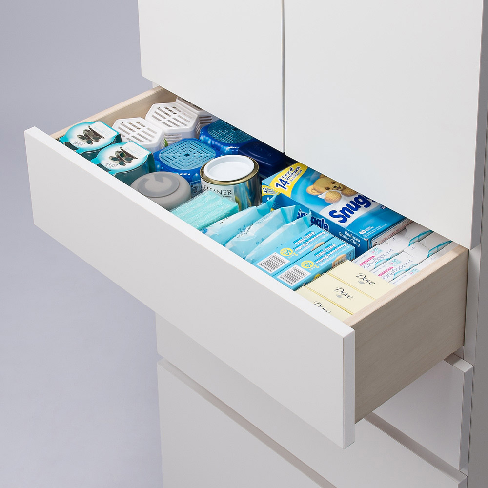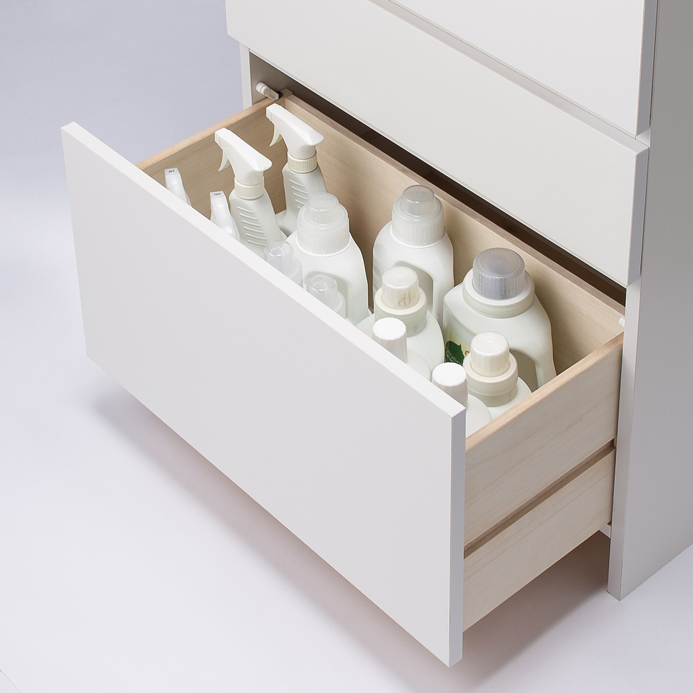 引き出し最下段は洗濯用の背の高いボトル洗剤も収納できます。