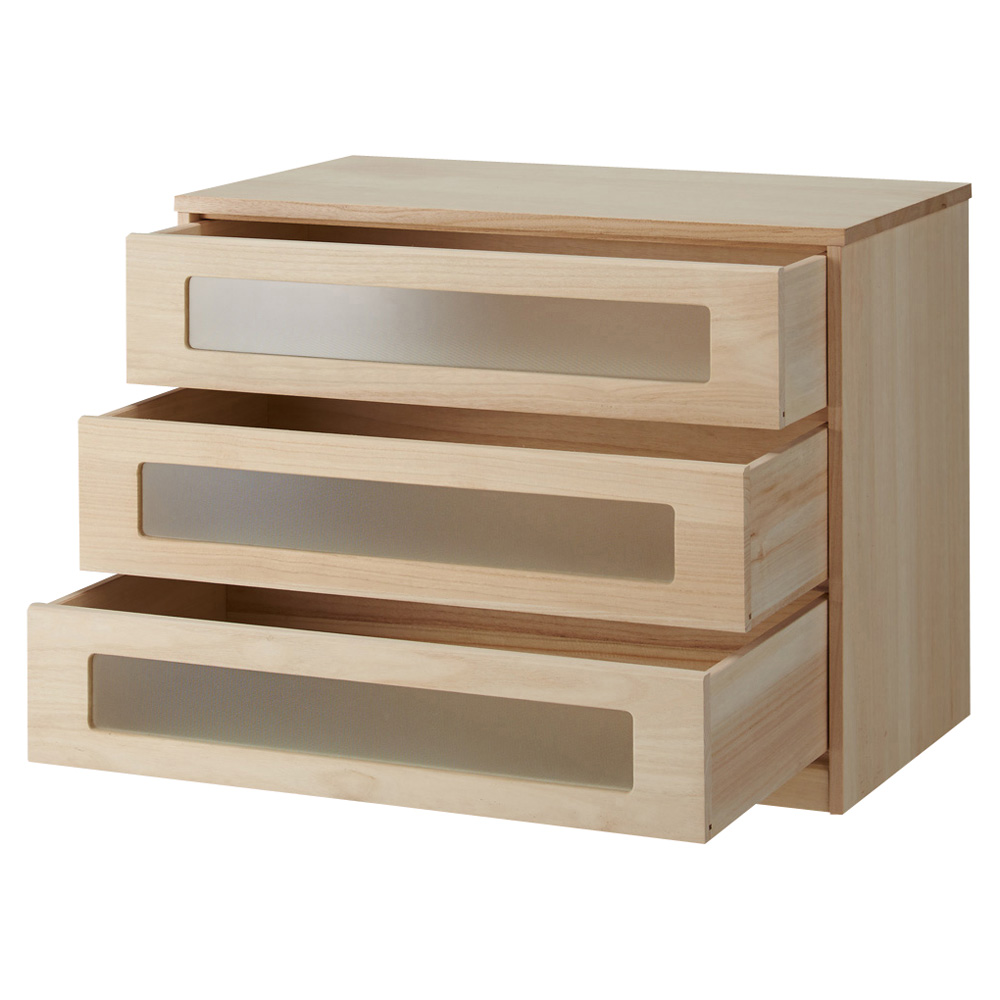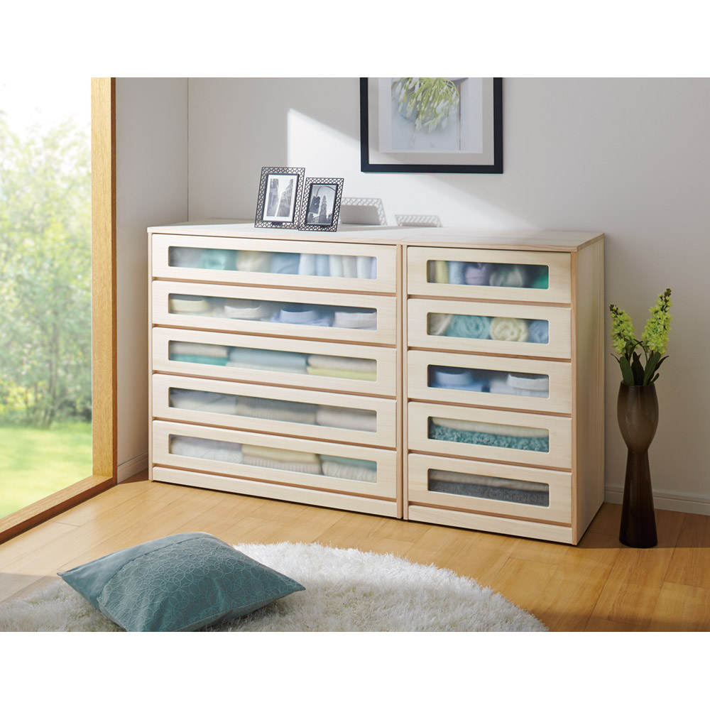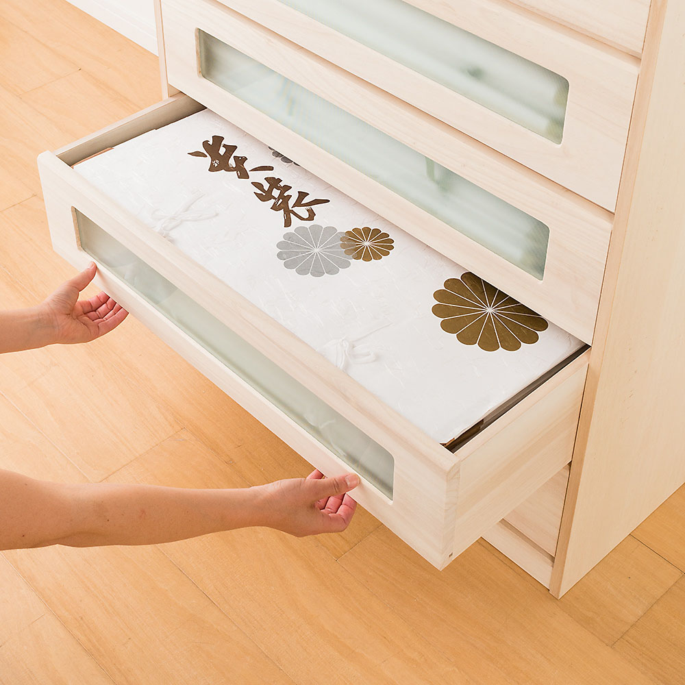 日本伝統の「桐」と、モダンな「ミストガラス」の融合で、まるで海外のファッションブティックのような洗練されたクローゼットが実現。収納物が見やすく、キャスター付で移動やお掃除もラクラク。実用性も兼ね備えた、桐の新スタイルです。あなたのセンスが光る、スタイルのあるクローゼットが実現。■開けるために幸せな気分の膨らむ、上質で華やかなクローゼットを手に入れませんか?■暗いクローゼット空間では、お気に入りの衣類も探しにくく大変。前板がミストガラスなので、外の光を取り込み全体が明るくなります。■毎日に快適な彩りを添え、空間のアクセントになります。■大切な衣類を美しくディスプレイしながら収納できる、新たな収納のかたちです。■色のトーン別に収納すると、美しいグラデーションがガラス窓に映りおすすめ。■毎朝のファッションコーディネートが特別で、贅沢な時間に。ほのかに透けるミストガラス窓■商品の前板には、3mm厚のミストガラスの窓付き。■中身ははっきり見えず、収納物の存在は感じられる適度な透け感です。■クローゼットだけでなく、部屋置きしても、圧迫感なくすっきり設置できます。大切な衣類は、桐に仕舞う習慣を。■桐は古くから、湿気や虫に強く、着物などの収納に永く使われてきました。■着物だけではなく、大切な衣類やショールなどは、桐に収納するのがおすすめです。■大切な衣類は保管して守り、長く使っていきませんか。幅と高さを選んで「ぴったり」が実現。■幅は58、75、100cmの3タイプ。■高さは、3段(59.5cm)、4段(76.5cm)、5段(94cm)の3タイプ。■豊富なサイズ展開からぴったりなサイズをお求めください。■隠しキャスター付き。移動やお掃除もラクラク、衣類の整理や収納にも便利です。■収納部内寸:奥行37.5高さ13.5cm(全サイズ共通)安心の日本製、国産家具■日本の桐職人が桐材を厳選し、丹精込めて造り上げました。■長く使うものだから、拘り抜かれた高品質の商品をお楽しみください。■完成商品なので、届いたらすぐに使えるのもおすすめポイントです。※キャスターはお客様にて取り付けをお願いしております。簡単な作業ですが、有料で取り付けサービスもご利用いただけます。ご希望の場合は注文時にご指定ください。