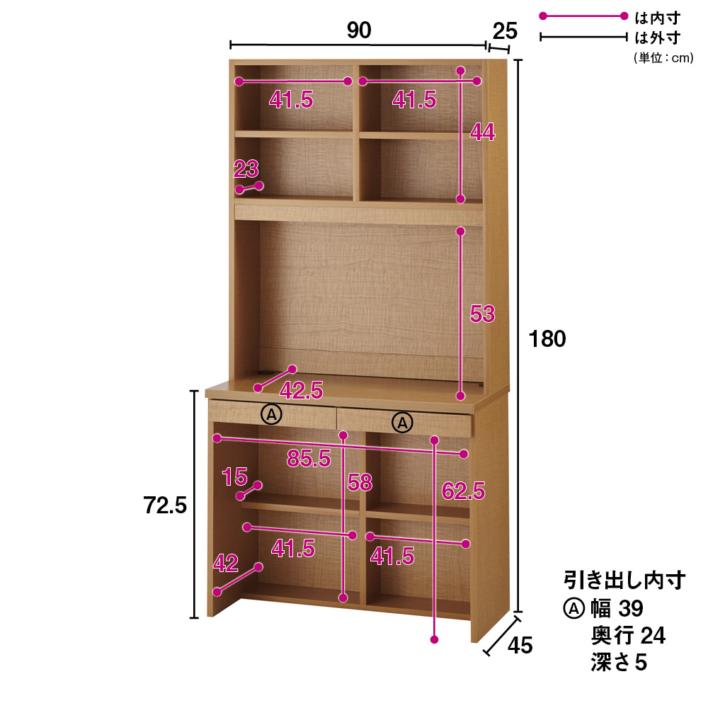 デスク引き出しは小物の整理や書類収納に便利。※デスク幅90cm引き出し内寸:幅39奥行24高さ4.5cm(2杯)