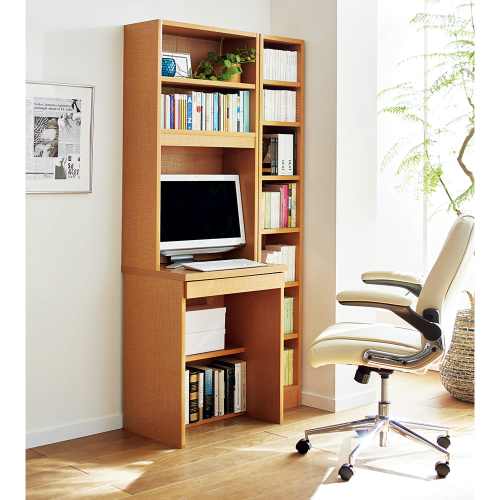 収納力抜群なのでホームオフィスにおすすめのデスク!棚板は1.5cmピッチで調整できるので様々な本をインテリアのように収納できます。フルオープン設計で、検索性も抜群の壁面収納が完成します。抜群の収納力!読書家の為のプライベートライブラリー◆机と本棚(書棚)が一つになりました。まるで図書館のような空間を実現。◆フルオープンなので飾り棚のように使っても◎◆棚板一枚当たりの耐荷重も20kgと安心の頑丈設計で、収納力にとことんこだわりました。◆1.5cmピッチの可動棚は棚の位置をすべて決められるのであらゆる大きさの本に対応します。◆デスク周りは、いつの間にか書類や雑誌、本が山積みになってしまいます。 書類に囲まれた作業効率の下がる空間が、分別収納が可能となり業務効率も上がる空間に!◆デスクとシェルフと組み合わせて設置すれば、設計事務所のようなスペースが生まれます。◆上置きも組み合わせて壁面収納に。本に囲まれる夢のような空間が完成します。◆広々としたデスク天板なので、パソコン周辺機器もひとまとめにできるPCデスクとしても活躍。◆配線穴(デスクのみ)や電源タップ収納(デスクのみ)など、読書以外の使いやすさにも配慮した システムデスクをお求めやすい価格でお届けいたします。【ラインナップ】[色の種類]◆清潔感があり、部屋を明るい印象にするホワイト。◆人気の北欧風のオシャレなお部屋にもぴったりのナチュラル。[サイズ・バリエーション]◆パソコンデスク:幅60cm、90cm、120cm。1.A4サイズも入る引出付。小物の整理整頓に活躍。2.デスク天板は水や傷、汚れに強いポリエステル化粧合板を採用、高級感があります。3.配線穴、電源タップ収納がついており、配線も簡単。4.デスク上、足元にも本棚があり、デスクのみの使用でも収納がたっぷり。◆シェルフ:幅30cm、45cm、60cm、75cm 1.シンプルなオープンタイプでコレクションを飾って、飾り棚のようにも使えます。 棚板は1.5cm間隔で動くのでコミック(漫画)やCD・DVD、文庫本など様々な大きさに対応。 2.デスクと横連結をしてご使用いただけます。◆上置き:幅30cm、45cm、60cm、75cm、90cm、120cm1.上置きタイプは、天井高さに制限されること無く設置できるのが特徴。2.天井つっぱり式は、天井高さ239cm〜252cmの天井にジャストフィット。魅惑の収納力と安定感があります。国内の職人が海外製品には負けないよう品質管理にも配慮して丁寧に仕上げております。安心して使っていただける国産家具です。組立家具ならではの価格も魅力の本好きのためのデスクシリーズ、ぜひお買い求めください。