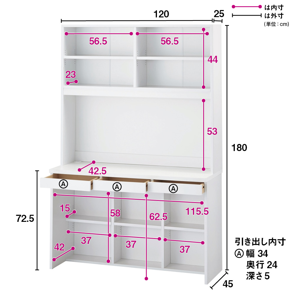 【幅120cm】(ア)ホワイト ※赤文字は内寸 (単位:cm)