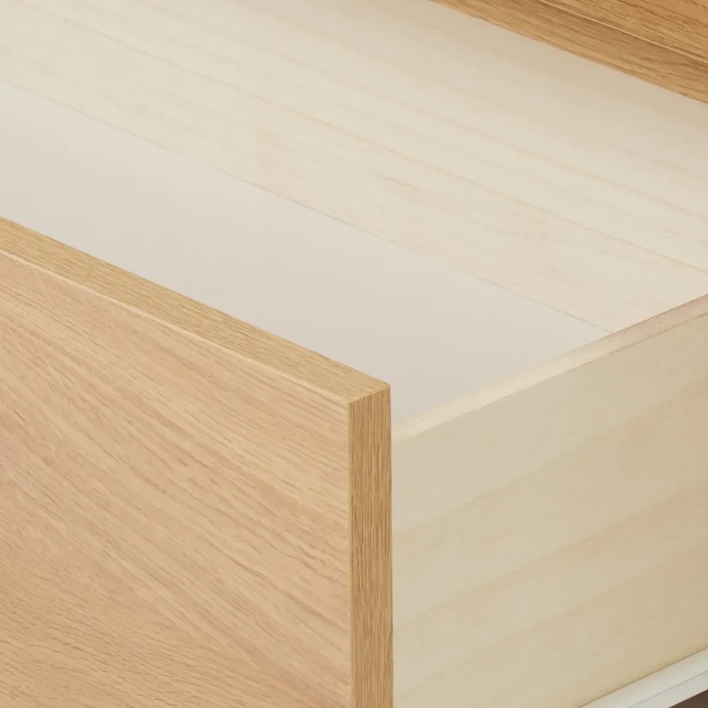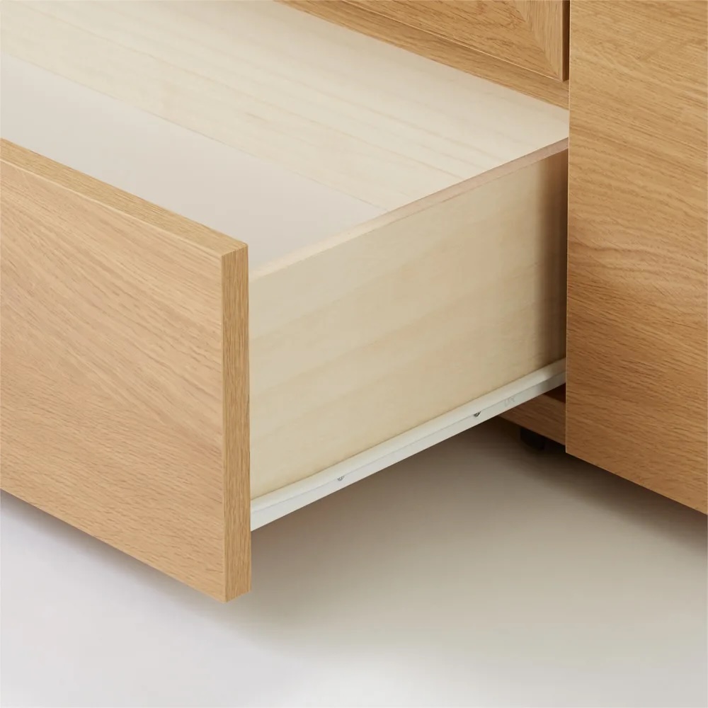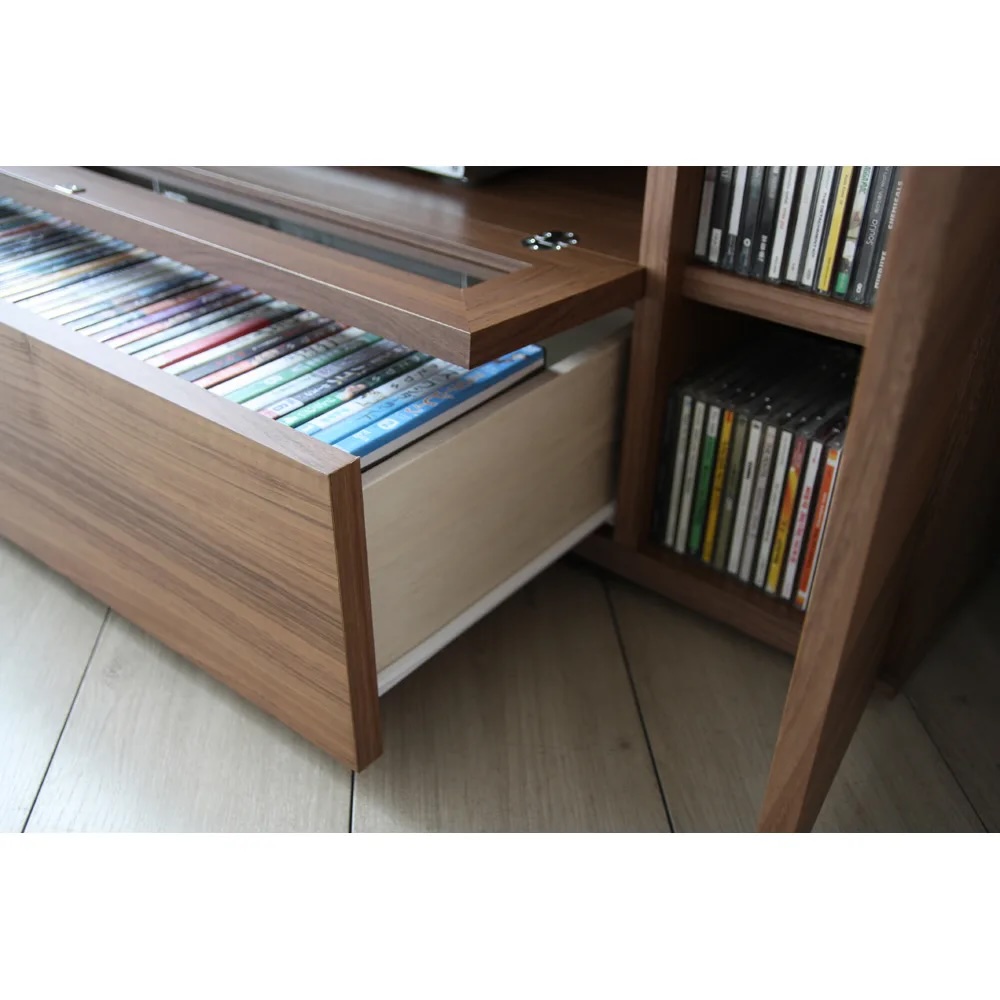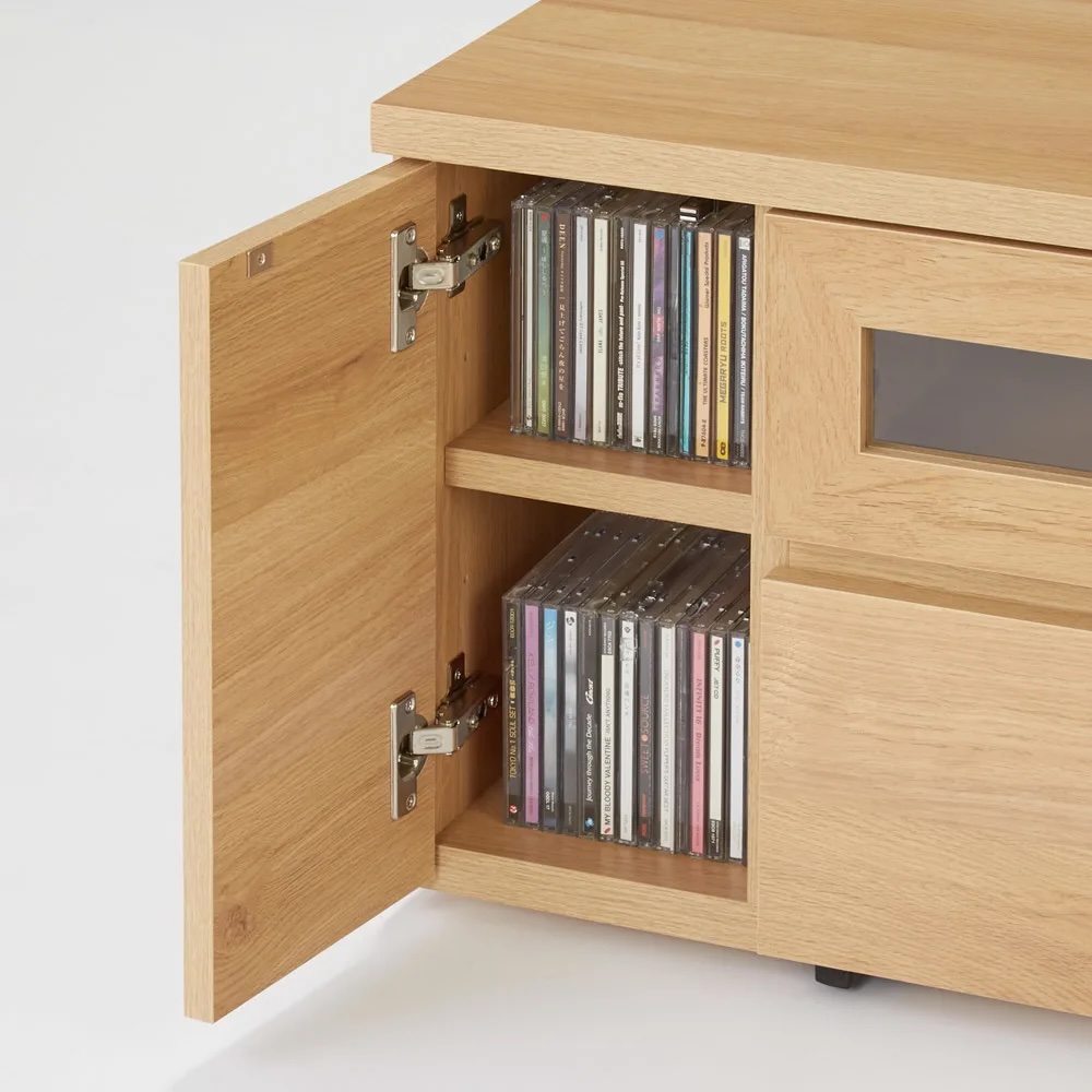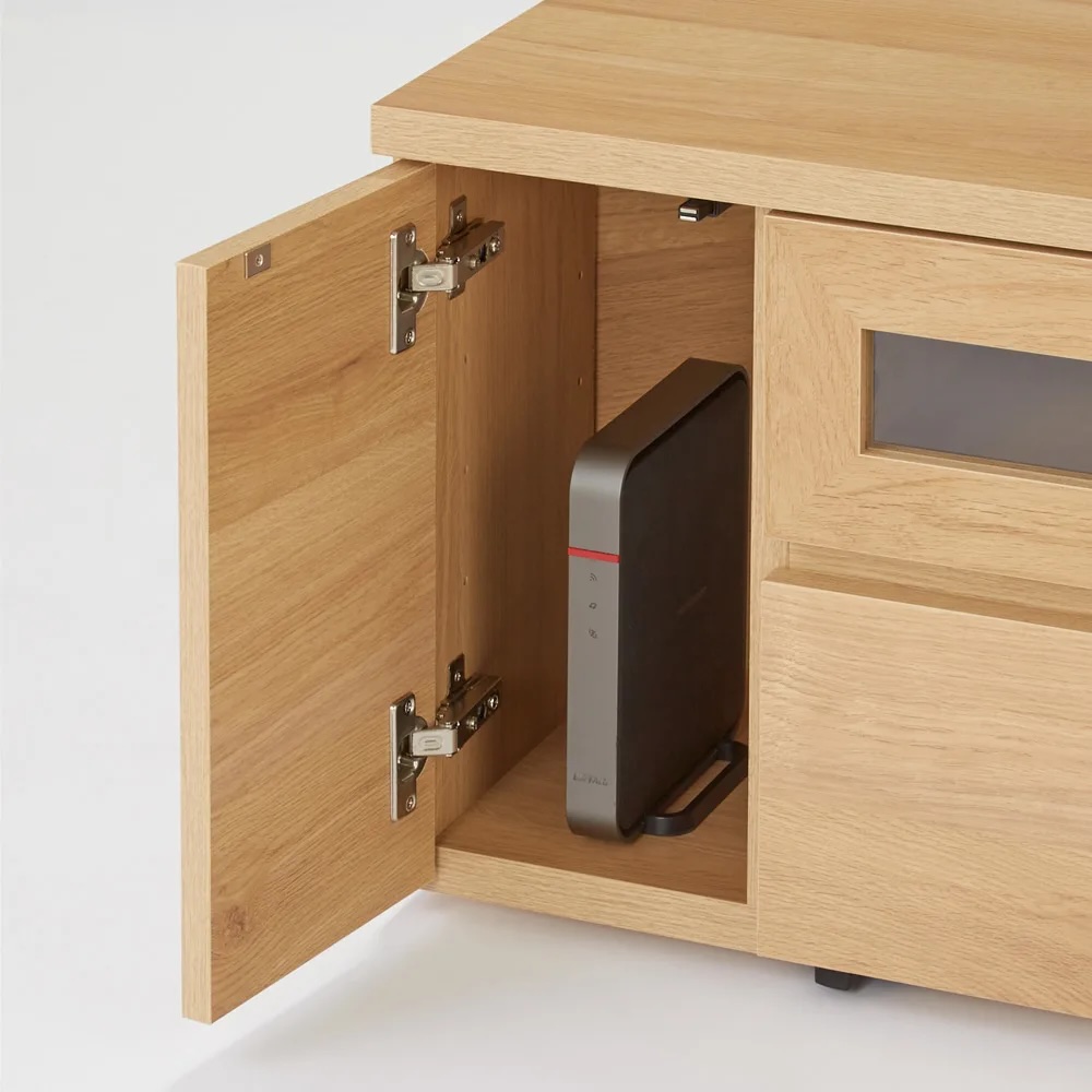 (イ)ナチュラル スライドレール付きの引き出しにCD、DVDなどを収納可能。左右収納部にはゲーム機やモデムも置けます。※写真は幅90cmタイプ。