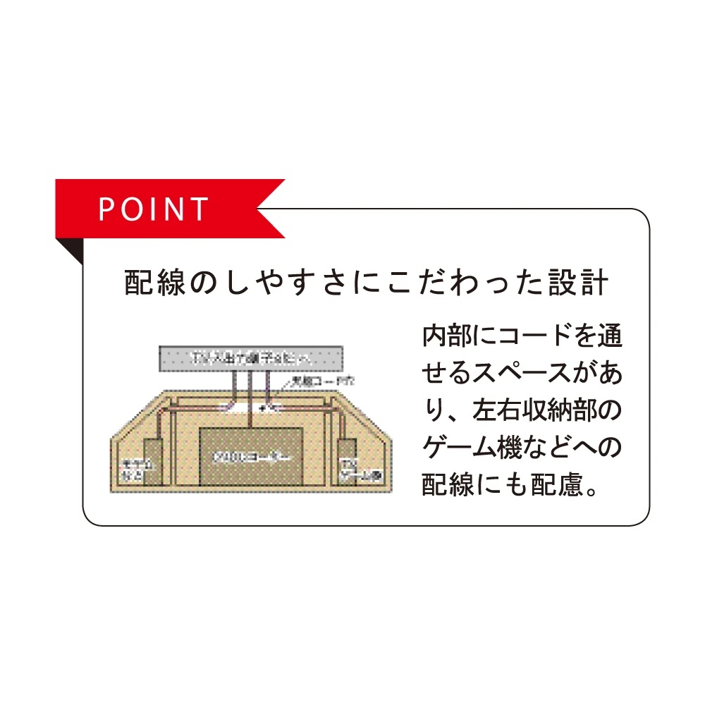 POINT 配線のしやすさにこだわった設計 内部にコードを通せるスペースがあり、左右収納部のゲーム機などへの配線にも配慮。
