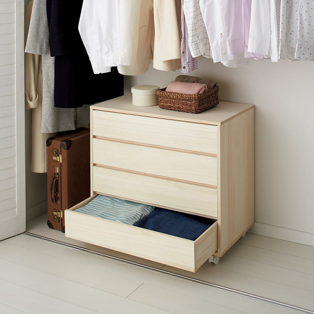 引き出しは深型なので、衣類を立てて収納することができます。※写真は奥行75cmタイプです