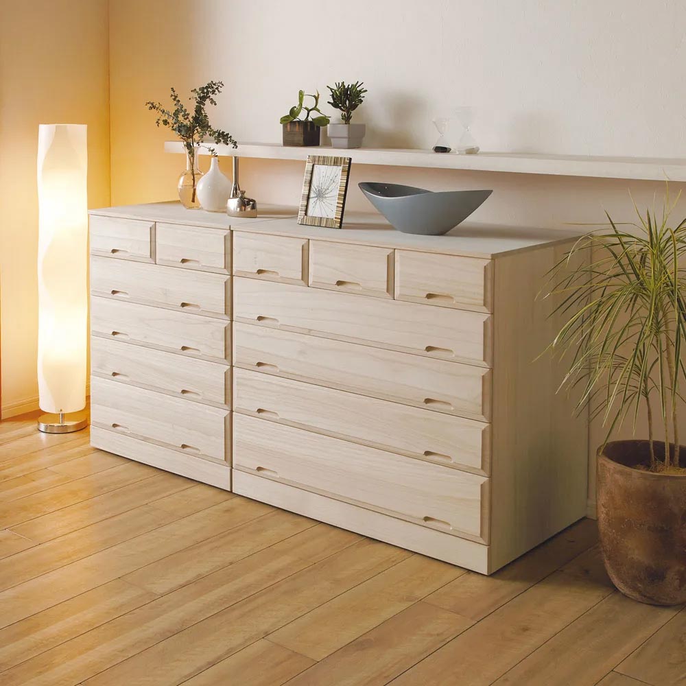 使用イメージ 小引出には下着類など細々したものを、長引出には衣類や着物を収納できます。 ※写真左から別売りの幅75cm・5段(高さ91cm)タイプ、幅100cm・5段(高さ91cm)タイプです。