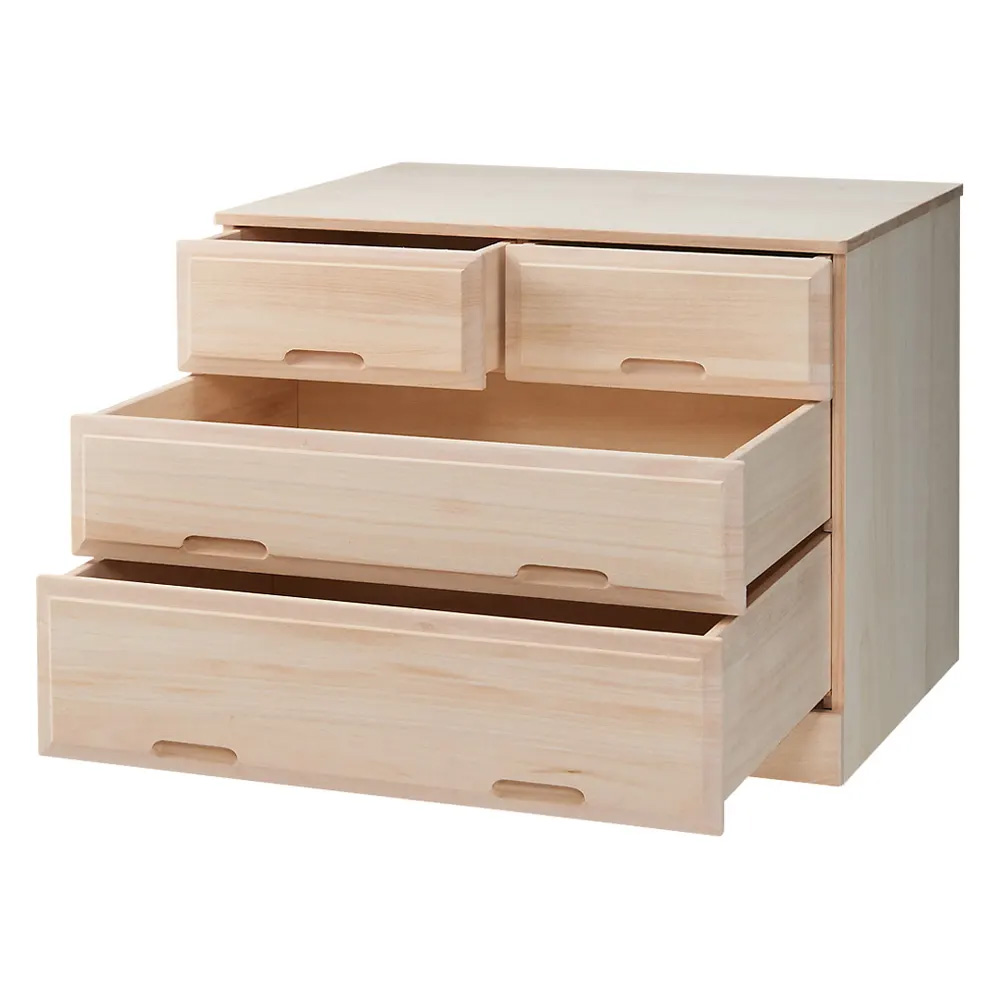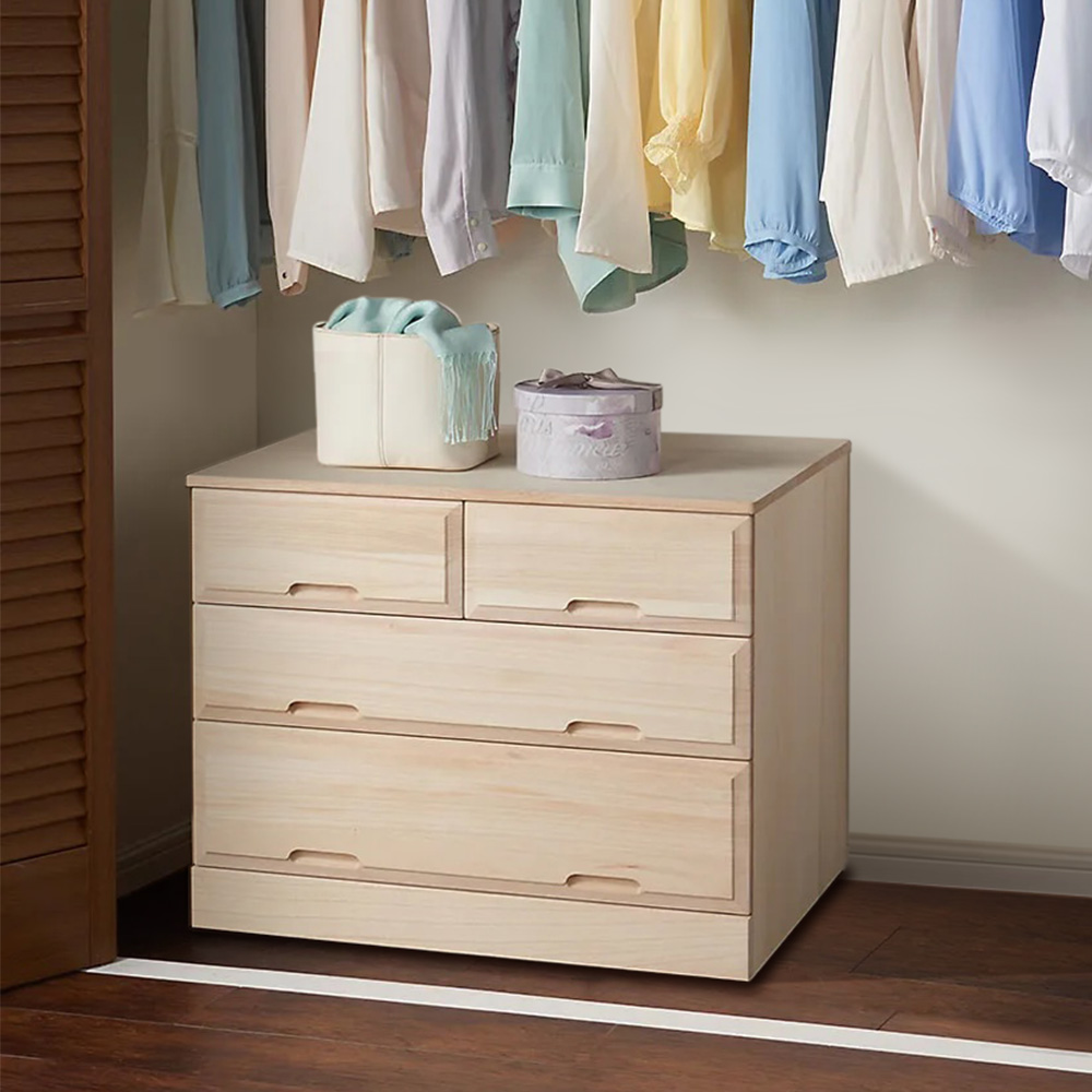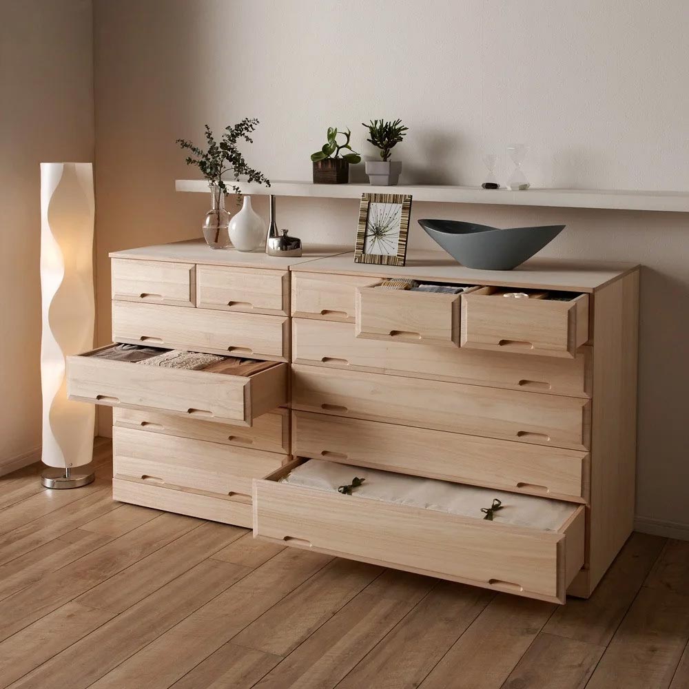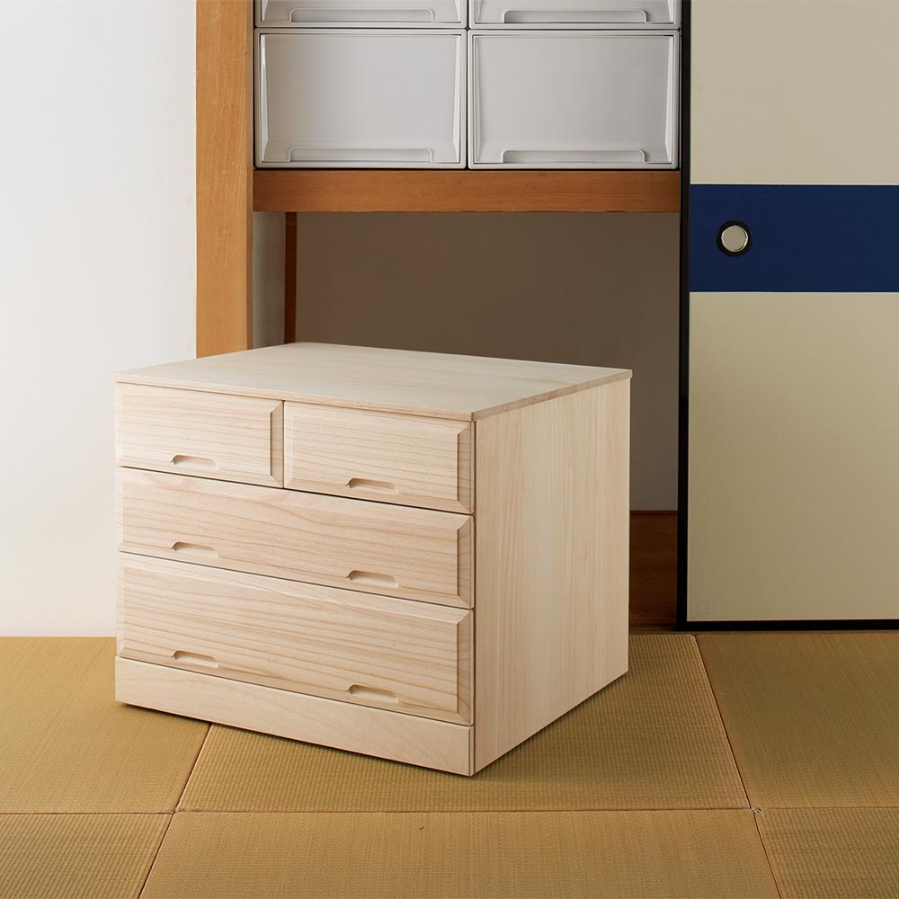使用イメージ 小引出には下着類など細々したものを、長引出には衣類や着物を収納できます。 ※写真左から別売りの幅75cm・4段(高さ75.5cm)タイプ、幅100cm・4段(高さ75.5cm)タイプです。