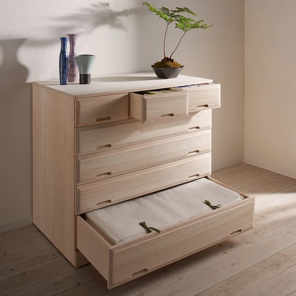 コーディネート例 小引出には下着類など細々したものを、長引出には衣類や着物を収納できます。 ※お届けは写真向かって右 幅100cm・5段(高さ91cm)です。