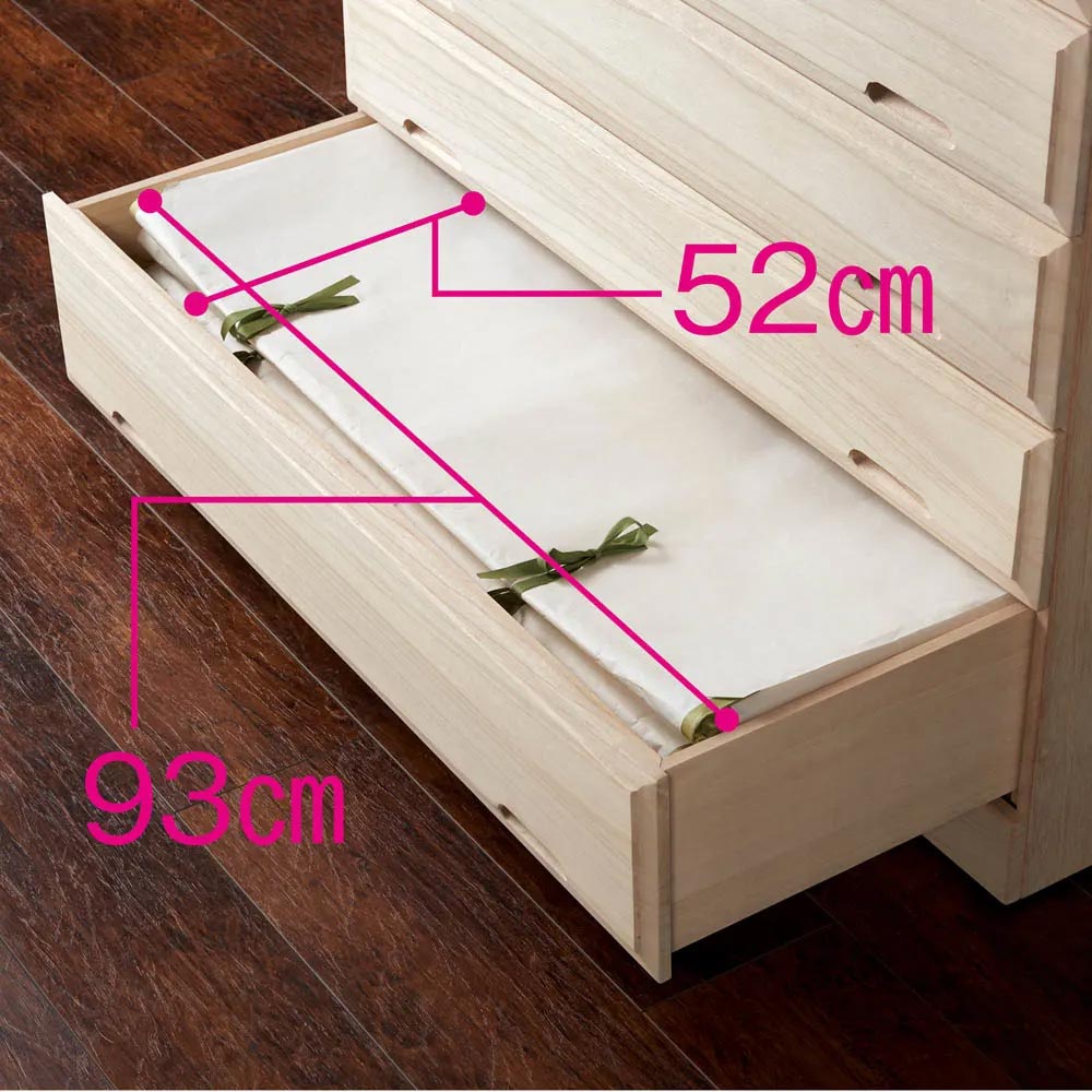 収納力がぐーんとアップ!!押し入れ(押入)やクローゼットの奥隅まで、スキなく大量収納できる奥行60cmの桐収納(桐チェスト)。キャスター付で移動スムーズ、部屋置きもできる便利な日本製・国産家具です。クローゼットの奥行を有効活用で、収納力ぐーんとアップ!クローゼットの奥隅まで、スキのない収納力がついに実現。「収納力」に特化しました。本体奥行60cm(有効奥行52cm)と、通常の衣類チェストよりも15cm程度奥行を深くしました。有効奥行内寸52cmは、衣類が前後2列に収まる大収納力。普段使うものから、オフシーズンの衣類まで、無駄なくすっきり収まります。毎日使うものだから嬉しい、便利機能が満載!調湿性のある桐なので大切な衣類も安心して収納いただけます。キャスター付なので掃除の時の移動や衣替えもスムーズです。お部屋に置いても整理たんす感覚でご使用いただけるインテリア性です。選べる豊富なサイズ展開!幅は58.5cm、75cm、100cmの3サイズ、引出は3段、4段、5段と豊富な展開。(幅58.5cmは5段はありません。)ご自宅にぴったりのサイズをお選びください、引出は、小引出(引出有効高さ12cm)、長浅引出(引出有効高さ12cm)長深引出(引出有効高さ14cm)の3タイプの引出付き。こまごました下着類や着物小物・帯などは小引出に収納、厚手のニットなどは長深引出に収納。衣類に合わせて効率良く収納することができ、探しやすく便利です。幅100cmには、着物もたとう紙を折らずに収納できます(引出有効幅93cm、有効奥行52cm)商品に使われる素材、塗料、接着材はすべて、ホルムアルデヒドの発散量が最も少ないランクを示す等級F☆☆☆☆の素材を使用し、安全面に配慮しました。桐材の特長◇桐材は湿度が高くなると湿気を吸い、逆に外気が乾燥すると湿気を吐き出す調湿機能をもっています。◇収縮率が少なく反りやゆがみが起きにくいので、長い愛用にも応えてくれます。◇桐にはタンニン等が多く含まれているため、害虫を寄せ付けにくいとされています。◇空気を多く含んで熱を伝えにくい性質のため、燃えにくい素材です。◇木材の中でも軽い素材なので、模様替えや引っ越し等の移動の容易さも魅力のひとつです。職人技が光る、安心の日本製(国産家具)熟練の家具職人が、一点一点心をこめて丁寧に仕上げております。佐賀・長崎地方のかつての総称「肥前」にちなんで、「肥前桐民芸」の商標を取得した、桐材の趣深い家具です。長く使うものだから、造りのしっかりした収納家具をお求めください。完成品でお届けするので、届いたらすぐにご使用いただけるのが嬉しいポイントです。キャスターのみお客様で取り付けをお願いします。※大型チェストのため設置場所への搬入経路をご確認の上、ご注文くださいますようお願い致します。梱包サイズが大きいため、エレベーターやお部屋に入らない場合がございます。
