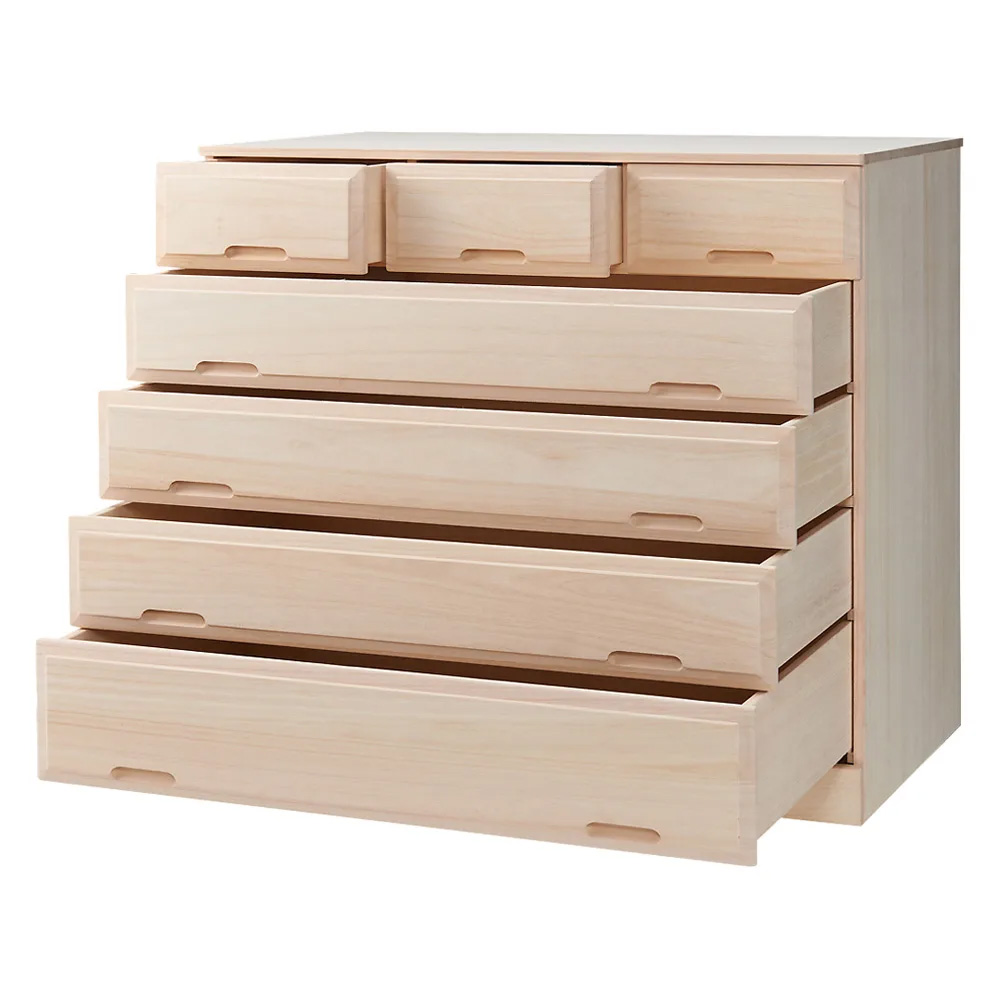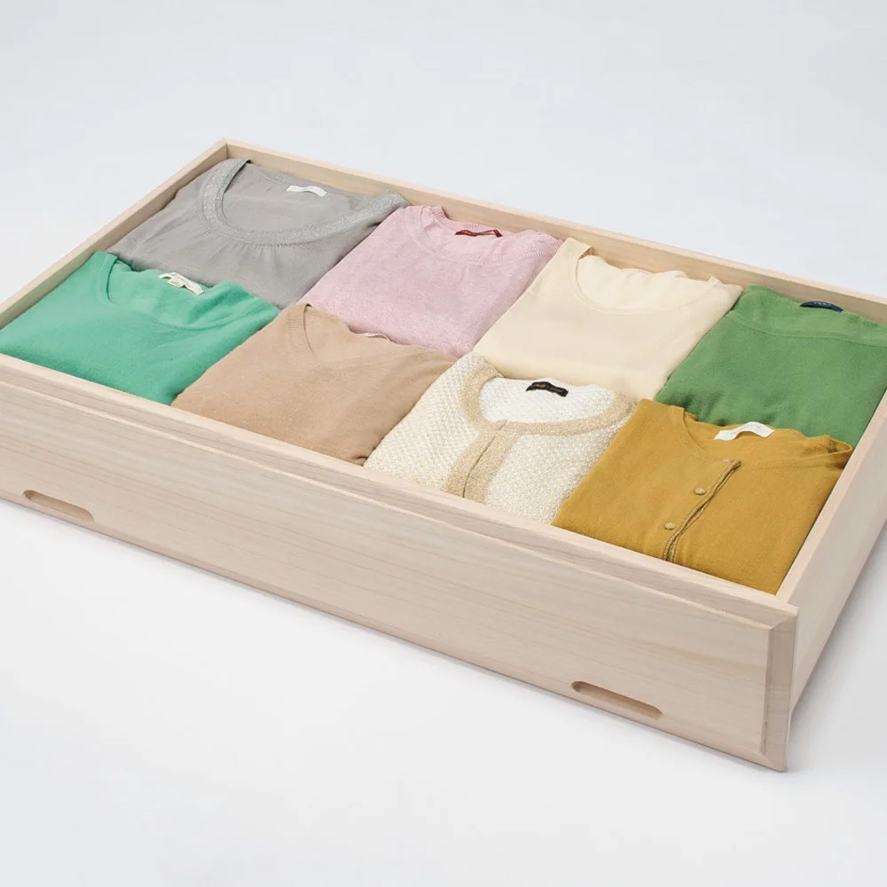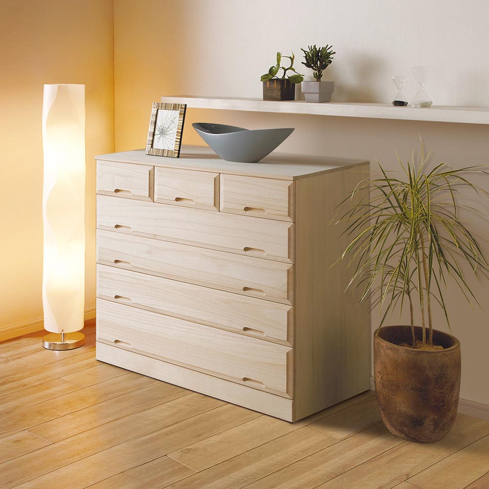 やわらかな木肌を生かした生地仕上げの桐天然木を使用。桐天然木には調湿作用があり、着物や大切な衣類の収納に適した素材です。