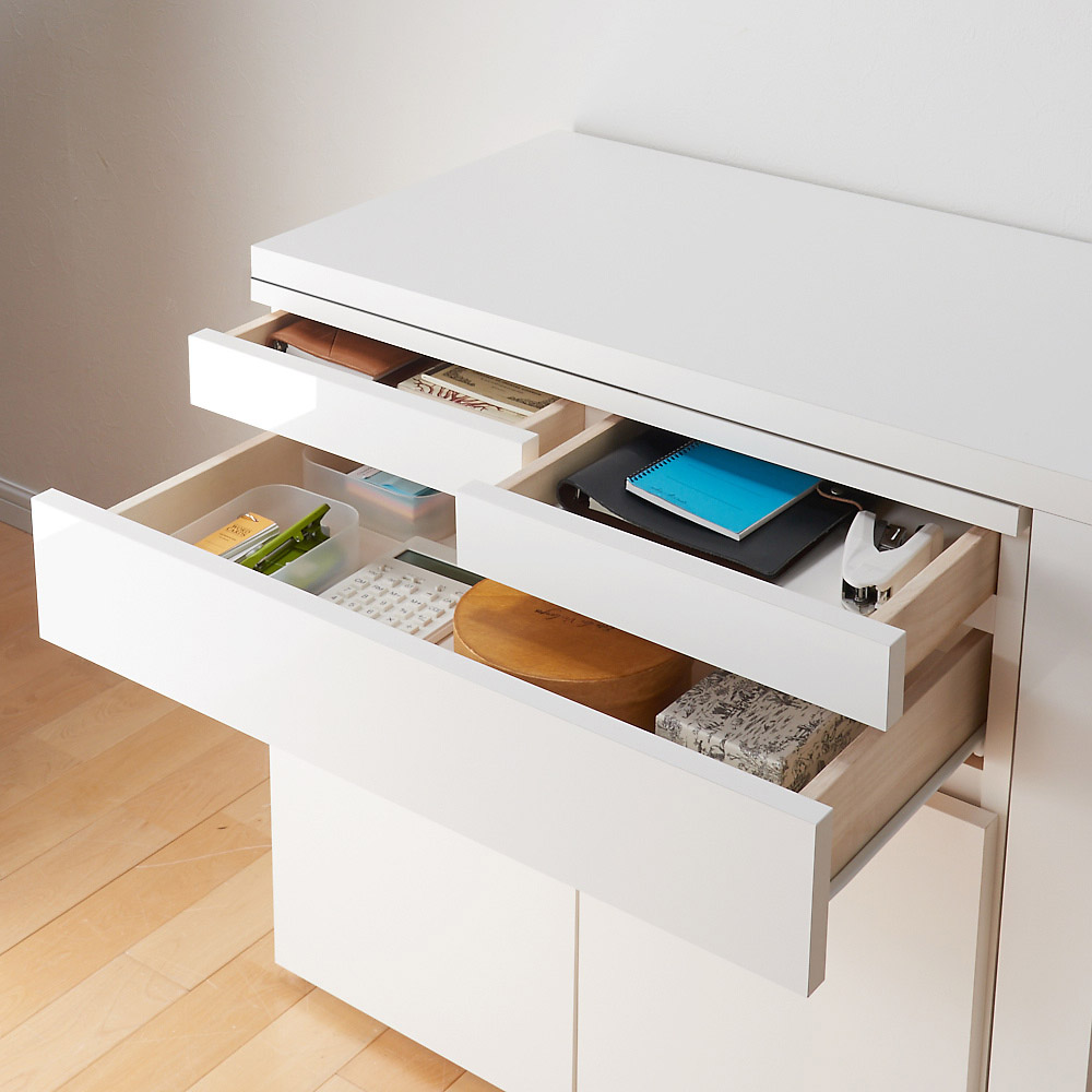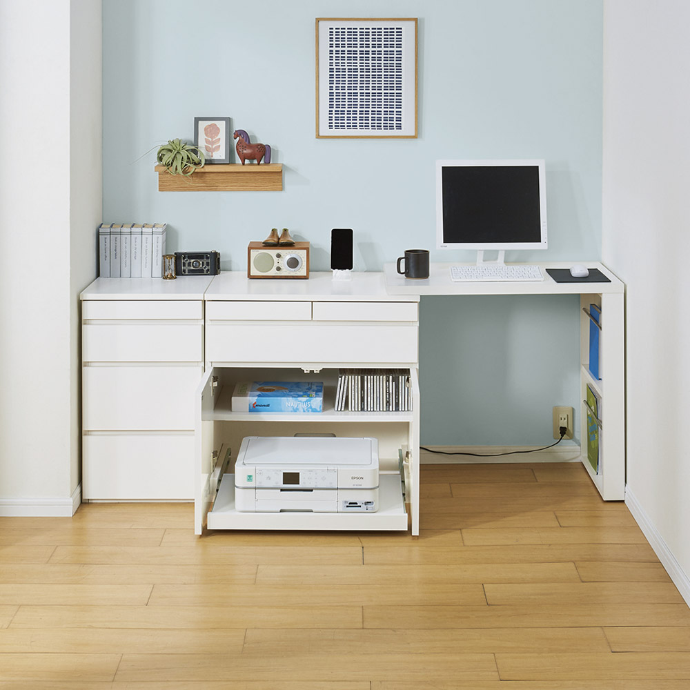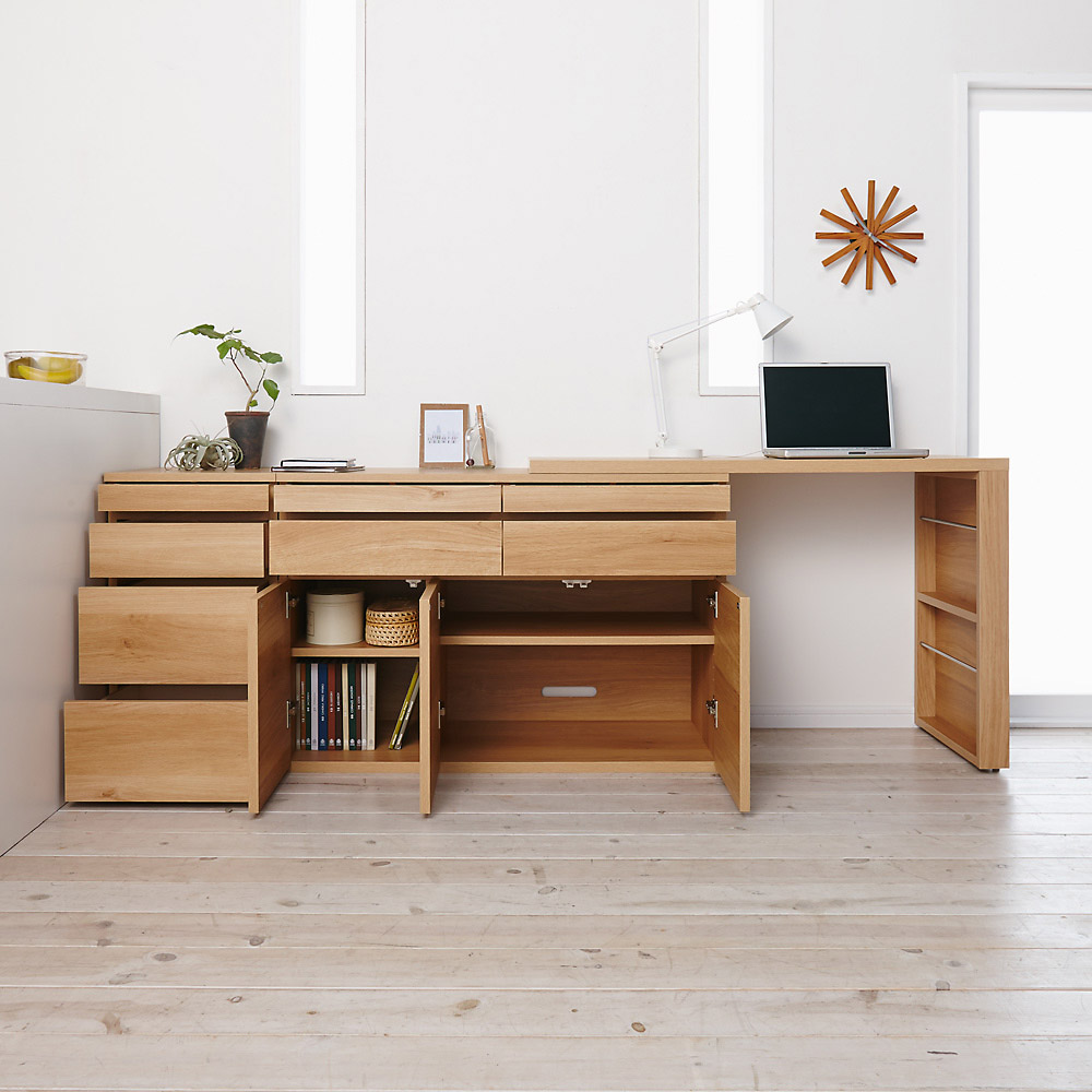 天板可動式のデスクがついたリビングボード。天板の形を変えて限られたスペースでも置くことができます。在宅勤務、テレワークにも最適。リビングボードに伸縮可動式の天板をプラス。天板の形を変えれば限られたスペースでも置くことができます。スペースに合わせて「ぴったり」の伸長機能●幅が77.5cm〜137cmに伸縮するので、お部屋に合わせてぴったりサイズに調節できます。●デスクの天板は設置スペースに合わせて左右どちらにも付け替え可能です。●デスクの脚にはマガジンラックになる収納スペースもあります。●キャビネットには深さの違う引き出しと扉収納もあり収納機能も充実。●奥行44.5cmの省スペース設計だから、リビング学習をしているお子様の近くで在宅ワークもできます。●別売の専用スライドテーブルはプリンターの収納に便利。必要なときだけ手前に引き出して、その場で印刷ができます。●色は前面に光沢のあるホワイトと木目のあるナチュラル色を用意。●丈夫で丁寧なつくりの日本製です。●ホルムアルデヒドの発生を最小限に抑えたグレードの素材(F☆☆☆☆合板・塗料・接着剤)を主材にした商品です。●完成品でお届けします。シリーズ品の型・サイズ展開●キャビネットのサイズバリエーションは最小幅77.5cmと112cm 更に収納機能を充実できるチェストとプリンター用スライドテーブルがあります。●こちらの商品は最小幅77.5cmタイプです。デスク天板は59.5cm伸縮します。(本体のサイズは77.5cm〜137cm)内寸サイズ●扉内収納部…幅65.5cm奥行40cm高さ42.5cm●引き出し…(上段)幅28.5cm奥行40cm高さ4.5cm×2 (中段)幅60.5cm奥行33.5cm高さ8cm●デスクの脚と本体の間は最大60cm●デスク脚のマガジンラック…幅40cm奥行3cm高さ31.5cm×2*プリンター用のスライドテーブルは別売りです。