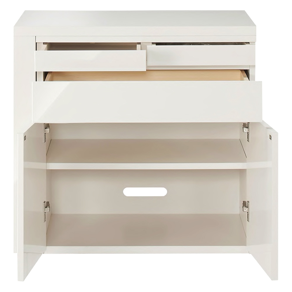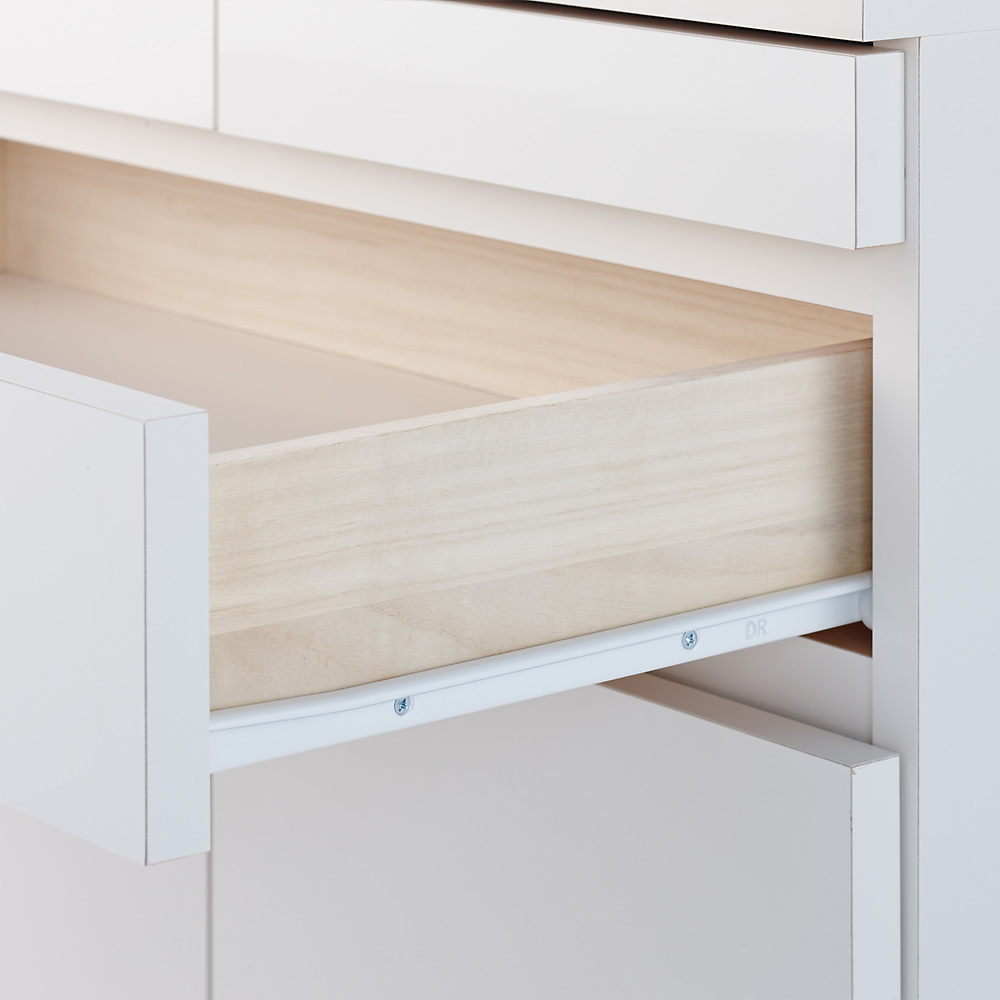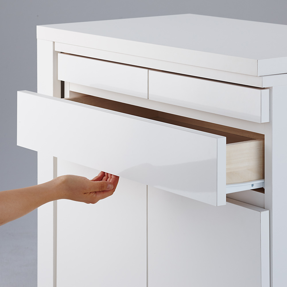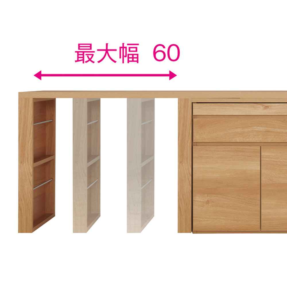 天板可動式のデスクがついたリビングボード。天板の形を変えて限られたスペースでも置くことができます。在宅勤務、テレワークにも最適。リビングボードに伸縮可動式の天板をプラス。天板の形を変えれば限られたスペースでも置くことができます。スペースに合わせて「ぴったり」の伸長機能●幅が77.5cm〜137cmに伸縮するので、お部屋に合わせてぴったりサイズに調節できます。●デスクの天板は設置スペースに合わせて左右どちらにも付け替え可能です。●デスクの脚にはマガジンラックになる収納スペースもあります。●キャビネットには深さの違う引き出しと扉収納もあり収納機能も充実。●奥行44.5cmの省スペース設計だから、リビング学習をしているお子様の近くで在宅ワークもできます。●別売の専用スライドテーブルはプリンターの収納に便利。必要なときだけ手前に引き出して、その場で印刷ができます。●色は前面に光沢のあるホワイトと木目のあるナチュラル色を用意。●丈夫で丁寧なつくりの日本製です。●ホルムアルデヒドの発生を最小限に抑えたグレードの素材(F☆☆☆☆合板・塗料・接着剤)を主材にした商品です。●完成品でお届けします。シリーズ品の型・サイズ展開●キャビネットのサイズバリエーションは最小幅77.5cmと112cm 更に収納機能を充実できるチェストとプリンター用スライドテーブルがあります。●こちらの商品は最小幅77.5cmタイプです。デスク天板は59.5cm伸縮します。(本体のサイズは77.5cm〜137cm)内寸サイズ●扉内収納部…幅65.5cm奥行40cm高さ42.5cm●引き出し…(上段)幅28.5cm奥行40cm高さ4.5cm×2 (中段)幅60.5cm奥行33.5cm高さ8cm●デスクの脚と本体の間は最大60cm●デスク脚のマガジンラック…幅40cm奥行3cm高さ31.5cm×2*プリンター用のスライドテーブルは別売りです。