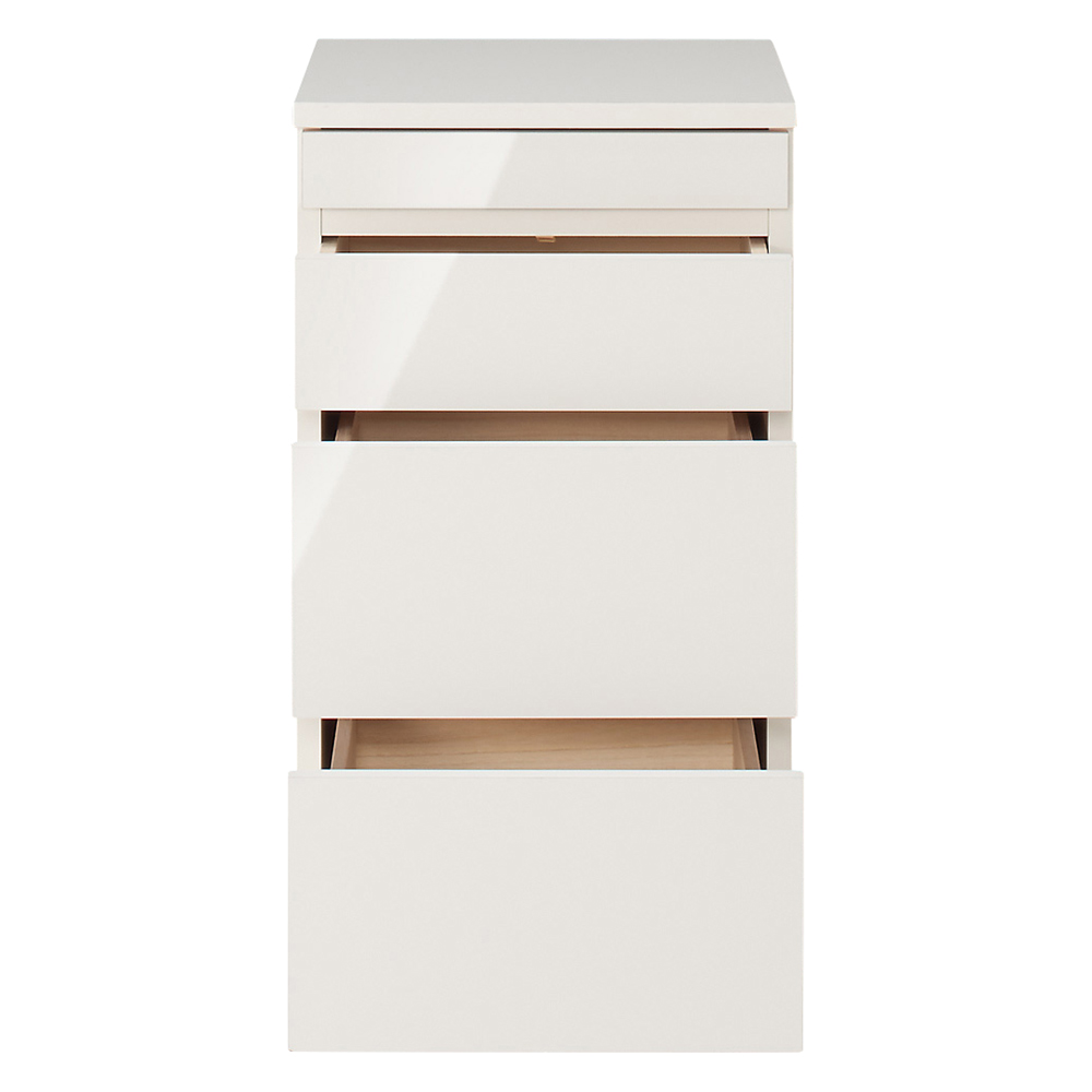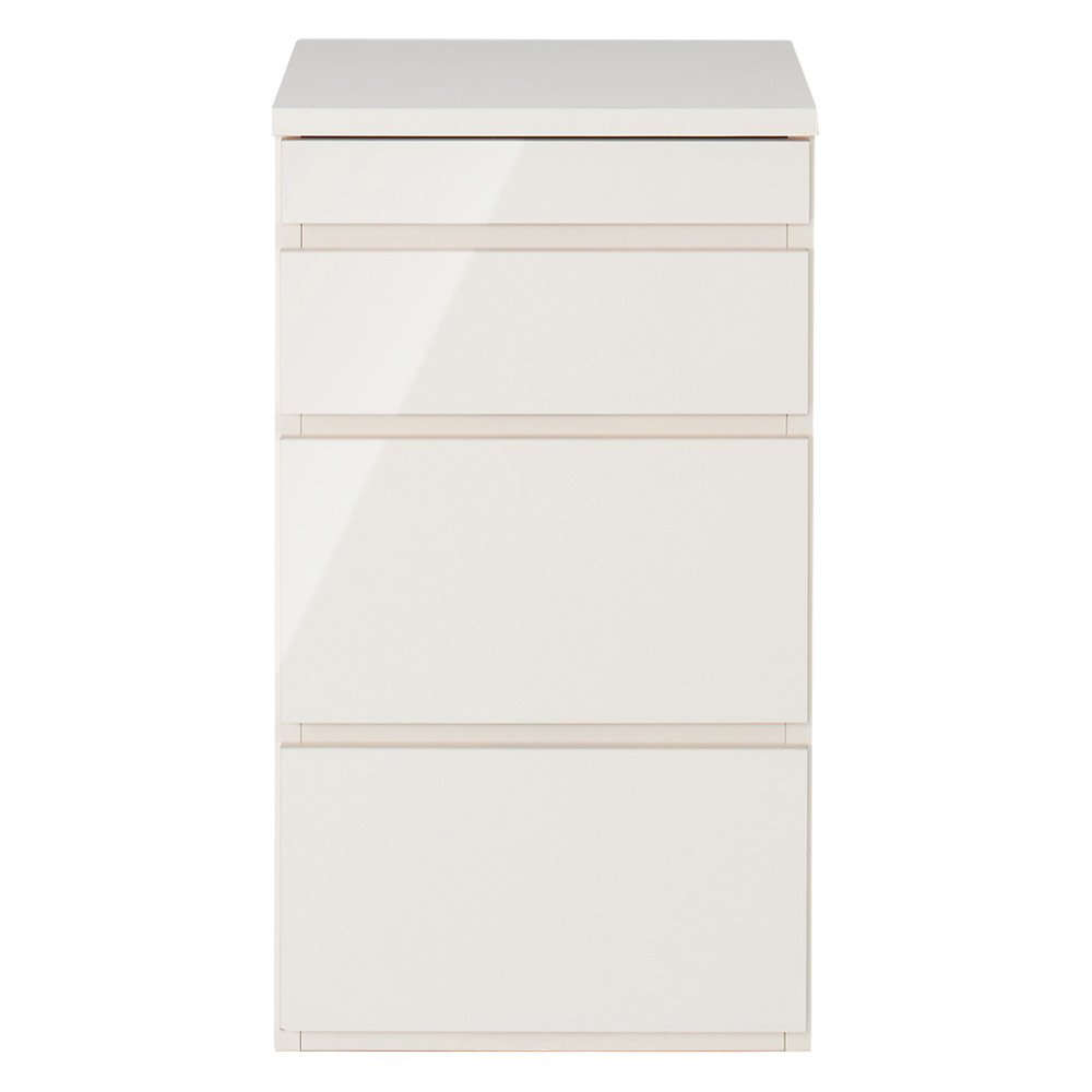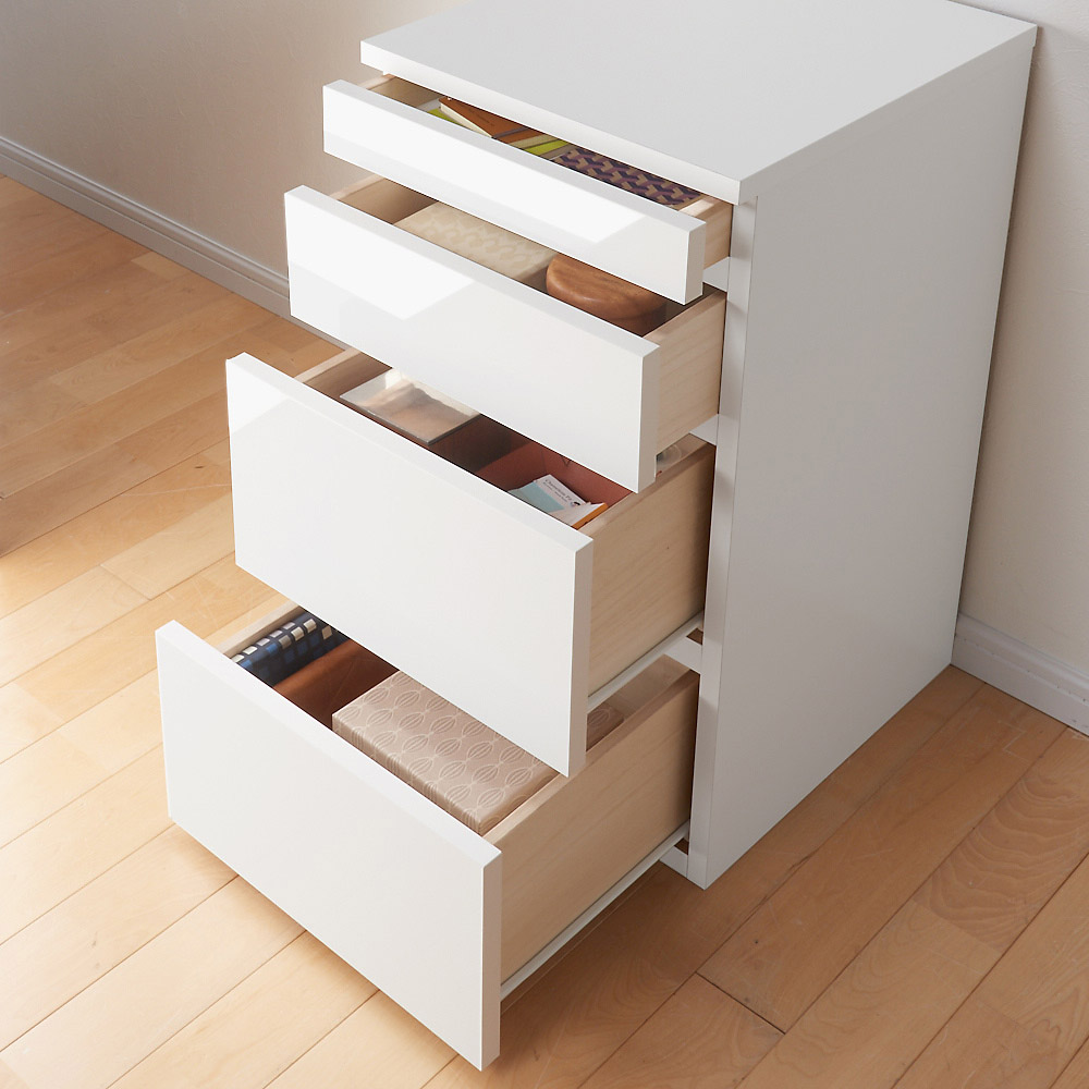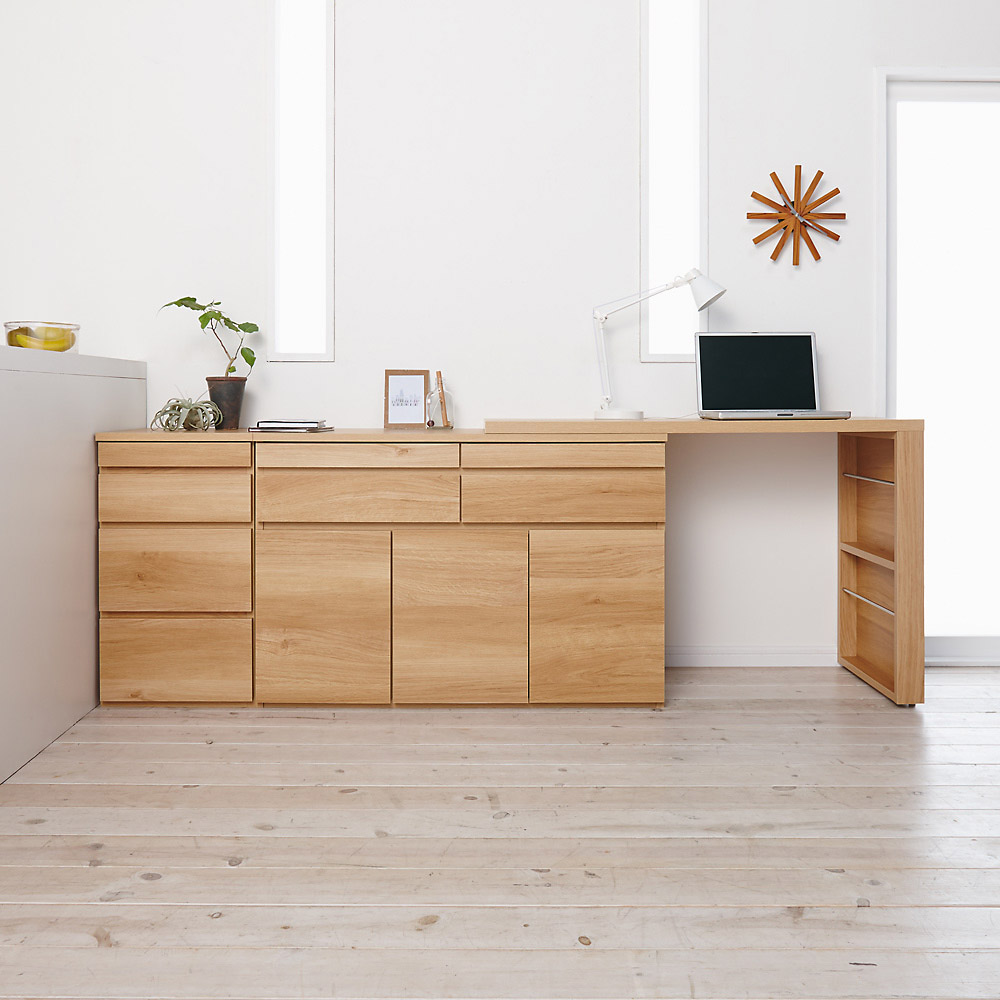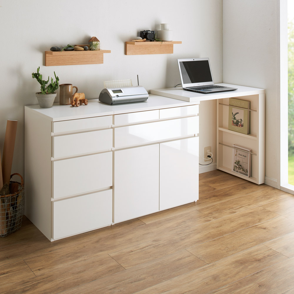 天板可動式のデスクがついたリビングボードシリーズのキャビネット。在宅勤務、テレワークにも最適。リビングボードに伸縮可動式の天板をプラス。天板の形を変えれば限られたスペースでも置くことができます。●デスク天板は回転も伸縮もOK。限られたスペースに設置ができます。●デスクの脚にはマガジンラックになる収納スペースもあります。●デスクの天板は設置スペースに合わせて左右どちらにも付け替え可能です。●キャビネットには深さの違う引き出しと扉収納もあり収納機能も充実。●色は前面に光沢のあるホワイトと木目のあるナチュラル色を用意。●丈夫で丁寧なつくりの日本製です。●ホルムアルデヒドの発生を最小限に抑えたグレードの素材(F☆☆☆☆合板・塗料・接着剤)を主材にした商品です。●完成品でお届けします。シリーズ品の型・サイズ展開●キャビネットのサイズバリエーションは最小幅77.5cmと112cm。●更に収納機能を充実できるプリンター用スライドテーブルがあります。●こちらの商品はチェスト幅40cmです。引き出し内寸サイズ上段…幅33cm奥行33.5cm高さ4.5cm上から2段目…幅33cm奥行33.5cm高さ9.5cm上から3・4段目…幅33cm奥行33.5cm高さ17cm