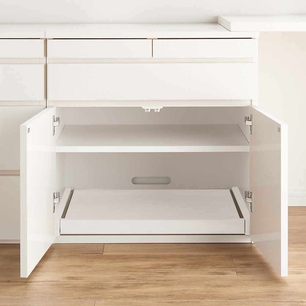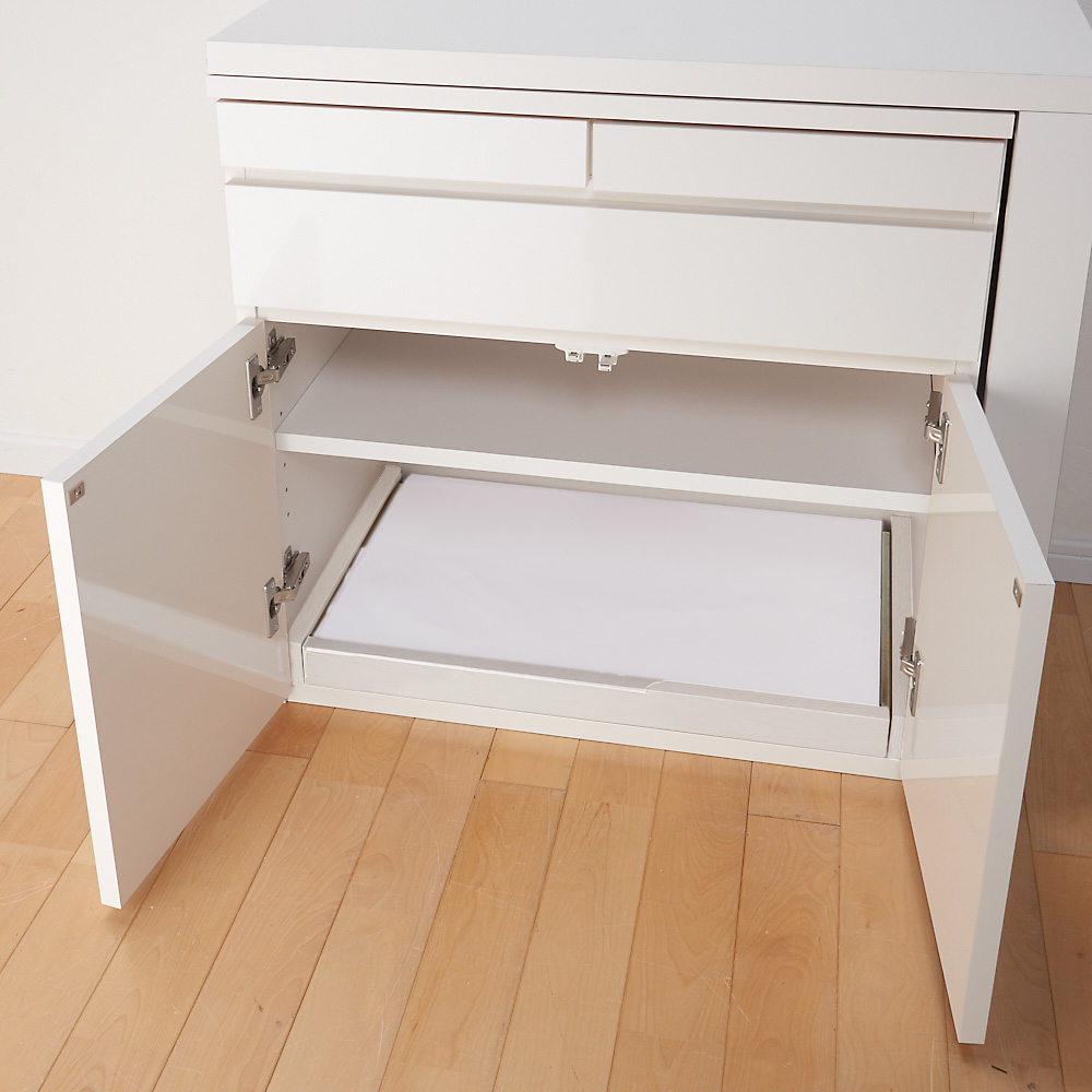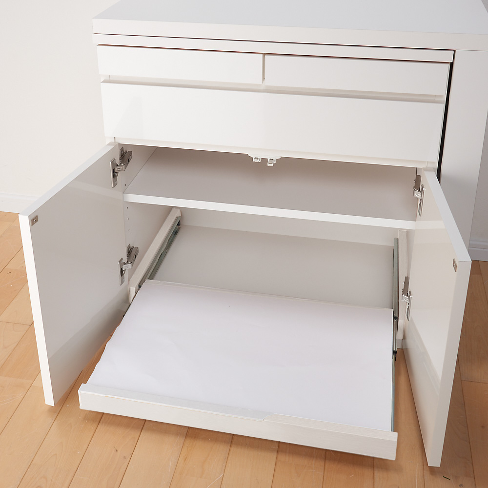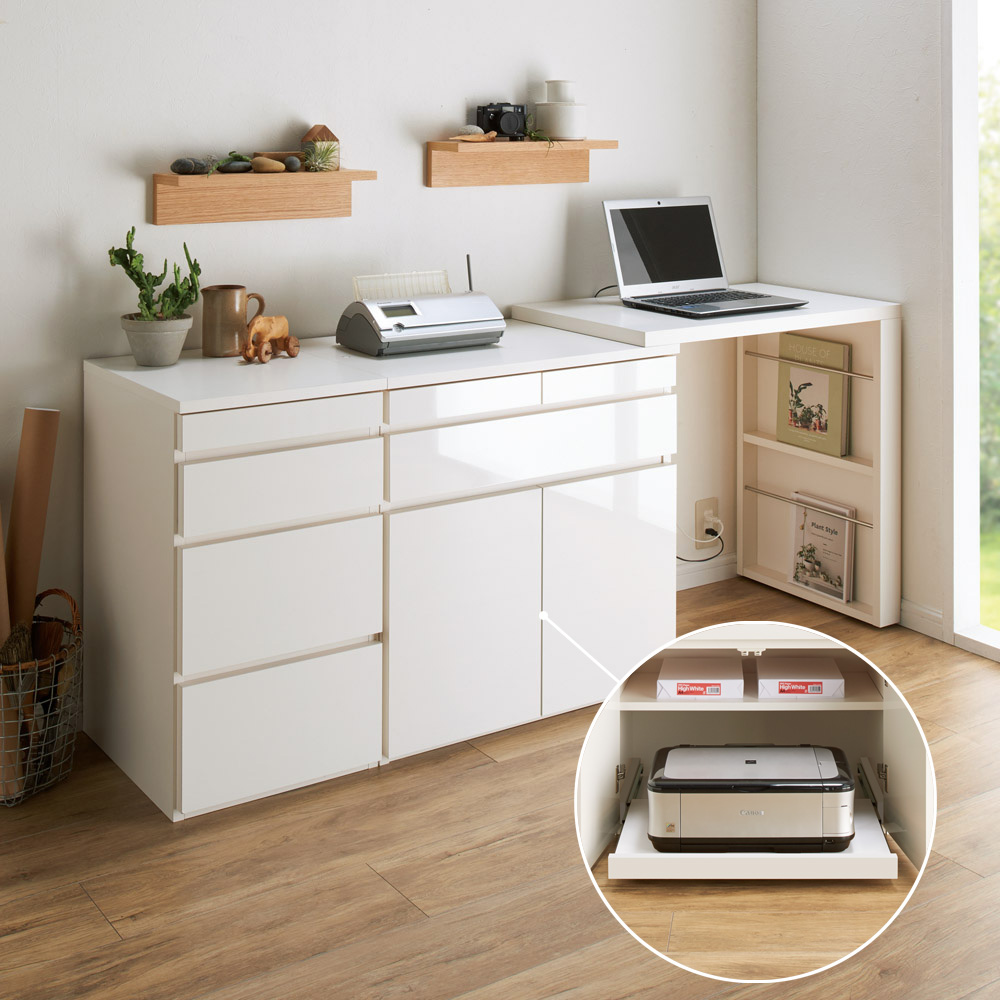 天板可動式のデスクがついたリビングボードシリーズの専用スライドプリンターテーブル。在宅勤務、テレワークにも最適。伸長式デスク&キャビネットの扉内に設置!重さのあるプリンターも楽に引き出せます。●後付け出来るスライドテーブルです。●色は前面に光沢のあるホワイトと木目のあるナチュラル色を用意。本体色に合わせて選べます。●丈夫で丁寧なつくりの日本製です。●ホルムアルデヒドの発生を最小限に抑えたグレードの素材(F☆☆☆☆合板・塗料・接着剤)を主材にした商品です。シリーズ品の型・サイズ展開●本体のデスク&キャビネットのサイズバリエーションは最小幅77.5cmと112cm。●更に収納機能を充実できるチェストがあります。●こちらの商品は専用のプリンタースライドテーブルです。