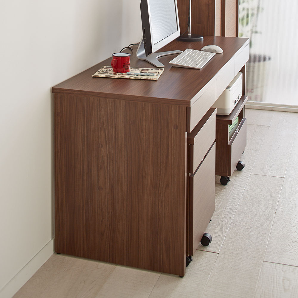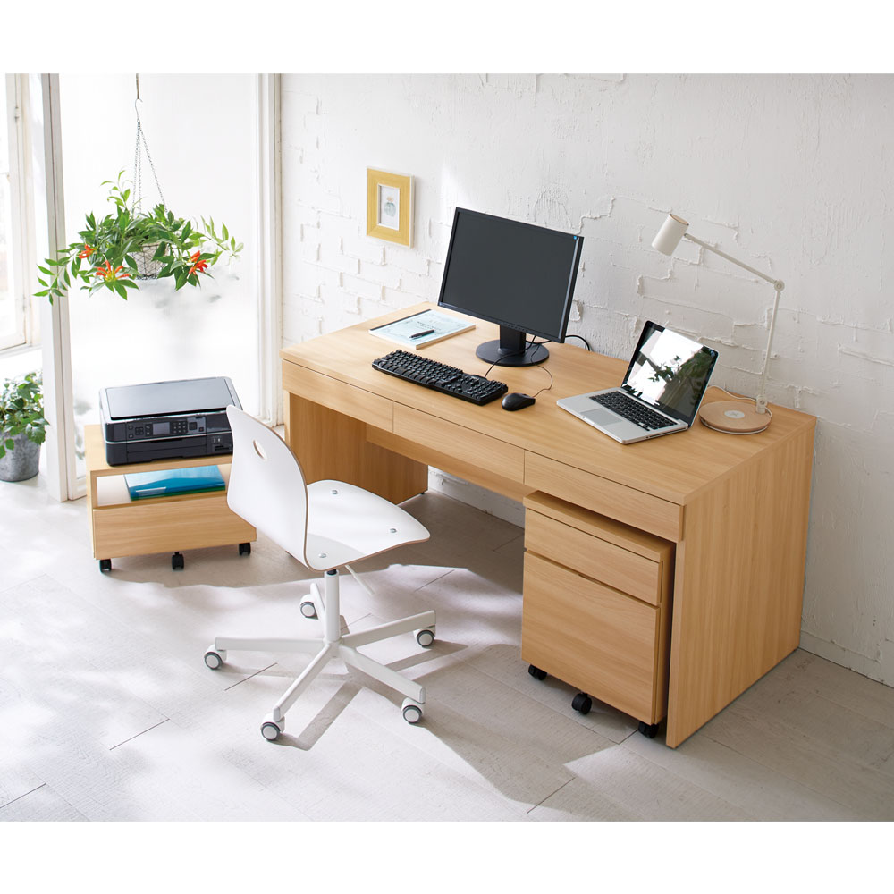 デスク下にはワゴンとチェストが収まる設計です。(イ)ナチュラル ※コーディネート例 お届けは幅120奥行60cmのデスクです。