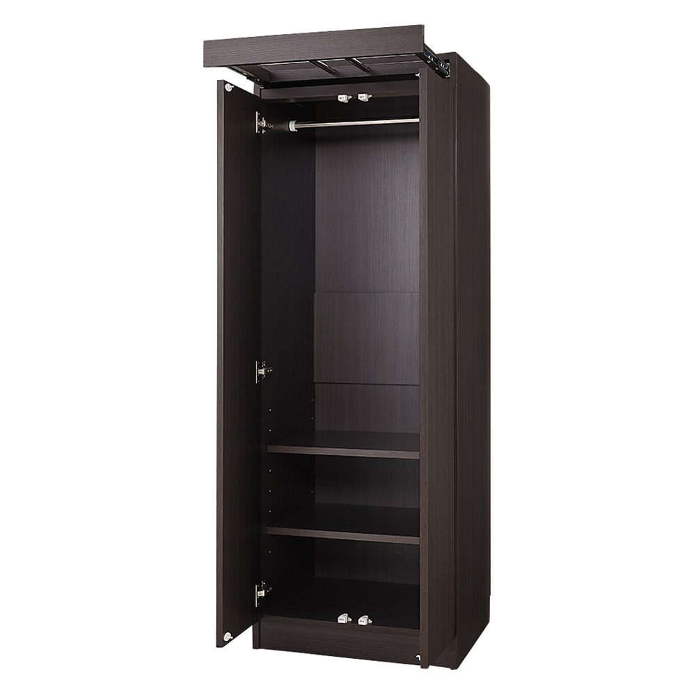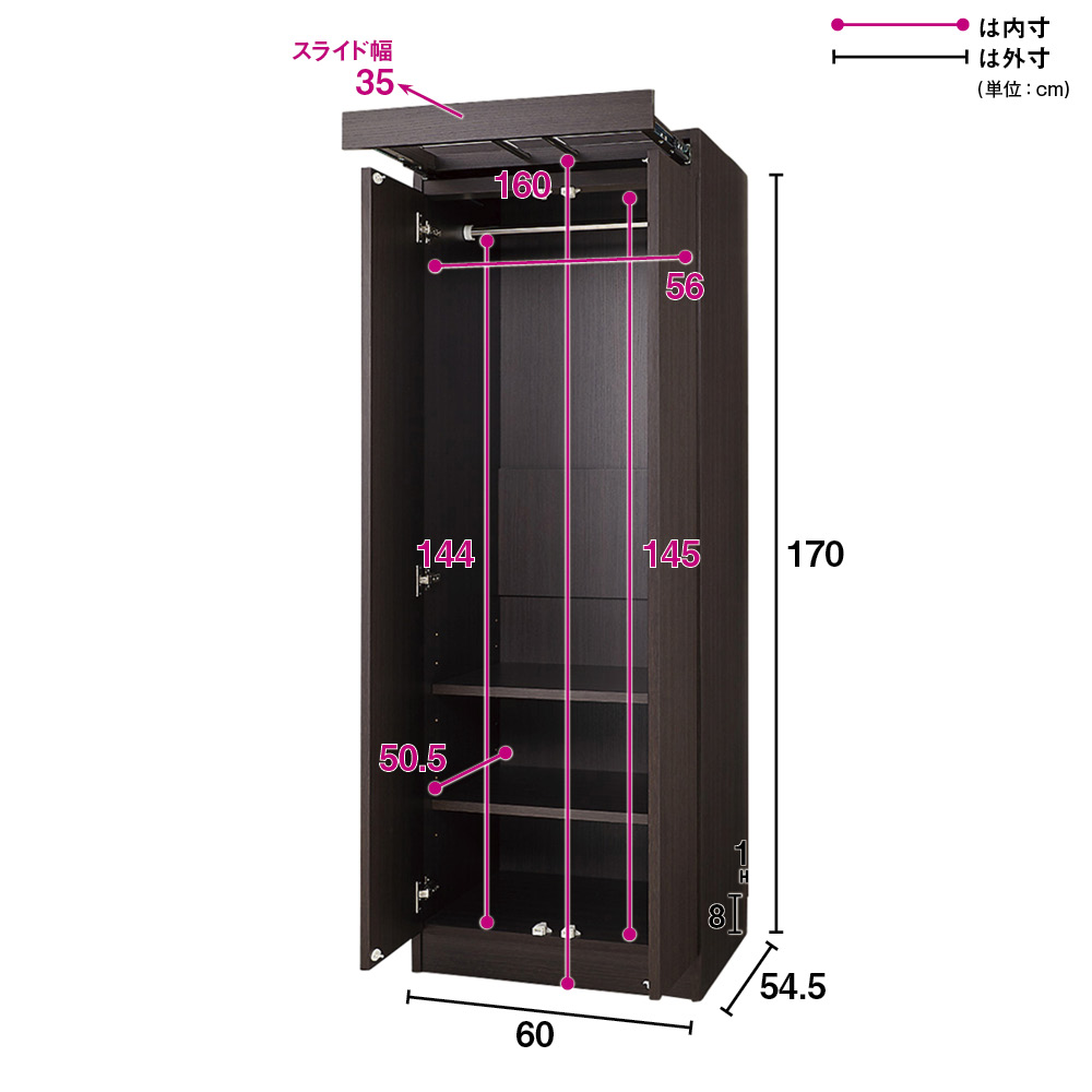 希少なスライド式ハンガーバーを内蔵した大型クローゼットです!収納に加え、日々の洋服メンテナンスや翌日のコーディネートの準備場所のことまで考えられた実用性・機能性をとことん追及したクローゼットが完成しました!女性が使いやすい本体高さ170cmで、別売りの上置きと組み合わせていただければ自分だけのクローゼット収納空間が実現します!希少性の高いスライド式ハンガーバー内蔵がなんといってもこの商品の魅力!●ハンガーバーはお気に入りのコートやシャツの休息スペースとしてご活用いただけます。●帰宅した後の洋服の湿気をとばす際や、翌日のコーディネートの準備場所としてもご活用できます。●洋服をかけた状態のまま、衣類スプレーや、スチームアイロンをかけたりできます。●ハンガーバーは最大35cmまで引き出せます。●クローゼット本体の幅より洋服の幅が内側に入るよう工夫されており、掛けた際に斜めになりにくくなっております。●安心の国産製品です。もちろん洋服・靴・バッグ・小物やアクセサリー等などすべて収納できます!●組み合わせによってお客様がお持ちのアパレルアイテムを全てまとめて収納できる壁面収納クローゼットシリーズです。●収納タイプは【ハンガー1段、可動棚2枚】、【ハンガー1段・引き出し2杯】、【引き出し7杯】の3タイプでそれぞれ幅は60cmと80cmの2タイプからお選びいただけます。(奥行は54.5cmで共通です。)●ハンガーにはシャツやコートなどを掛け、可動棚にはバックや帽子や小物のボックス、靴などを置けます。引き出しにはセーターやニットなどのたたみ物や厚手のもの収納にも最適です。●お客様の収納状況に応じて、機能的に収納できるアイテムを組み合わせれば、自分だけのクローゼットが完成します。●本体天板は、目線が届いた時にがっかりしない化粧仕上げで、埃などの掃除の際、埃がだまにならず済みます。●本体を一般的な家具のH180cm→H170cmに設定しており、女性目線の使いやすい高さに致しました。上置きを組み合わせれば、タンス上を突っ張れて見た目も美しく造りつけのような壮大なクローゼットに!●同シリーズの扉の高さサイズオーダー対応突っ張り上置き(別売)を組み合わせれば、天井まで収納空間にできしっかり安全に突っ張る事が可能です。●収納力をUPさせながら、壁一面に設置すれば、造りつけのシステム収納家具のような整然として美しい空間に。●上置き(別売り)は1cm単位でオーダーできます。●上置きとの組合せ次第(高さの低いタイプと、高いタイプがあります)で天井高222〜262cmに対応できます。
