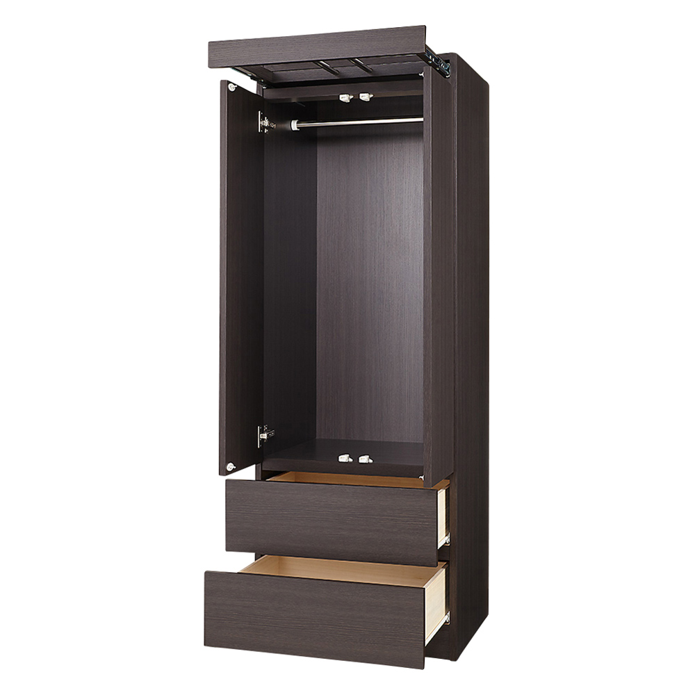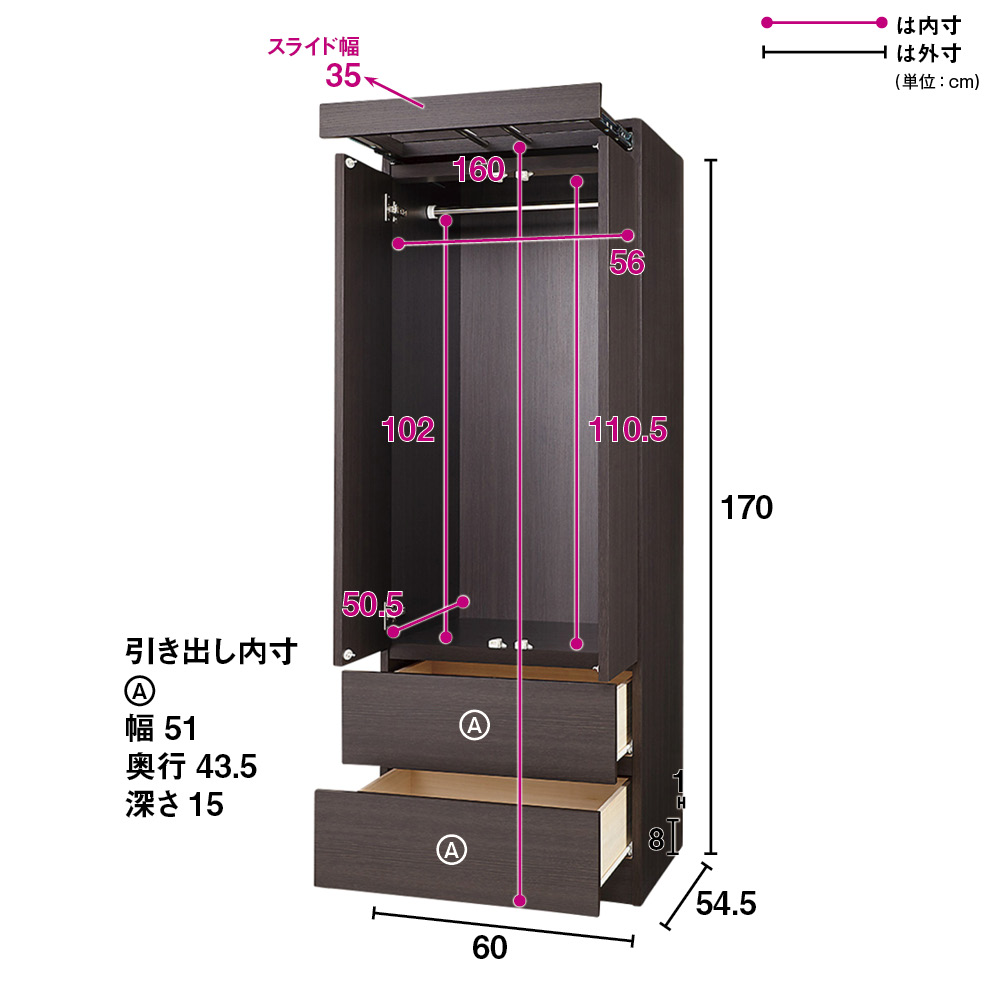 希少なスライド式ハンガーバーを内蔵した大型クローゼットです!収納に加え、日々の洋服メンテナンスや翌日のコーディネートの準備場所のことまで考えられた実用性・機能性をとことん追及したクローゼットが完成しました!女性が使いやすい本体高さ170cmで、別売りの上置きと組み合わせていただければ自分だけのクローゼット収納空間が実現します!希少性の高いスライド式ハンガーバー内蔵がなんといってもこの商品の魅力!●ハンガーバーはお気に入りのコートやシャツの休息スペースとしてご活用いただけます。●帰宅した後の洋服の湿気をとばす際や、翌日のコーディネートの準備場所としてもご活用できます。●洋服をかけた状態のまま、衣類スプレーや、スチームアイロンをかけたりできます。●ハンガーバーは最大35cmまで引き出せます。●クローゼット本体の幅より洋服の幅が内側に入るよう工夫されており、掛けた際に斜めになりにくくなっております。●安心の国産製品です。もちろん洋服・靴・バッグ・小物やアクセサリー等などすべて収納できます!●組み合わせによってお客様がお持ちのアパレルアイテムを全てまとめて収納できる壁面収納クローゼットシリーズです。●収納タイプは【ハンガー1段、可動棚2枚】、【ハンガー1段・引き出し2杯】、【引き出し7杯】の3タイプでそれぞれ幅は60cmと80cmの2タイプからお選びいただけます。(奥行は54.5cmで共通です。)●ハンガーにはシャツやコートなどを掛け、可動棚にはバックや帽子や小物のボックス、靴などを置けます。引き出しにはセーターやニットなどのたたみ物や厚手のもの収納にも最適です。●お客様の収納状況に応じて、機能的に収納できるアイテムを組み合わせれば、自分だけのクローゼットが完成します。●本体天板は、目線が届いた時にがっかりしない化粧仕上げで、埃などの掃除の際、埃がだまにならず済みます。●本体を一般的な家具のH180cm→H170cmに設定しており、女性目線の使いやすい高さに致しました。上置きを組み合わせれば、タンス上を突っ張れて見た目も美しく造りつけのような壮大なクローゼットに!●同シリーズの扉の高さサイズオーダー対応突っ張り上置き(別売)を組み合わせれば、天井まで収納空間にできしっかり安全に突っ張る事が可能です。●収納力をUPさせながら、壁一面に設置すれば、造りつけのシステム収納家具のような整然として美しい空間に。●上置き(別売り)は1cm単位でオーダーできます。●上置きとの組合せ次第(高さの低いタイプと、高いタイプがあります)で天井高222〜262cmに対応できます。
