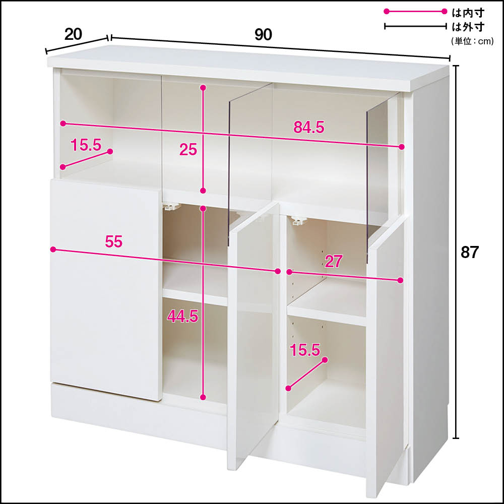 コーディネート例(ア)ホワイト 奥行20cmの薄型はカウンター下にぴったりのサイズです。食器やグラスを美しく飾ることができます。※左から幅90cm,幅60cmの奥行20cmタイプになります。