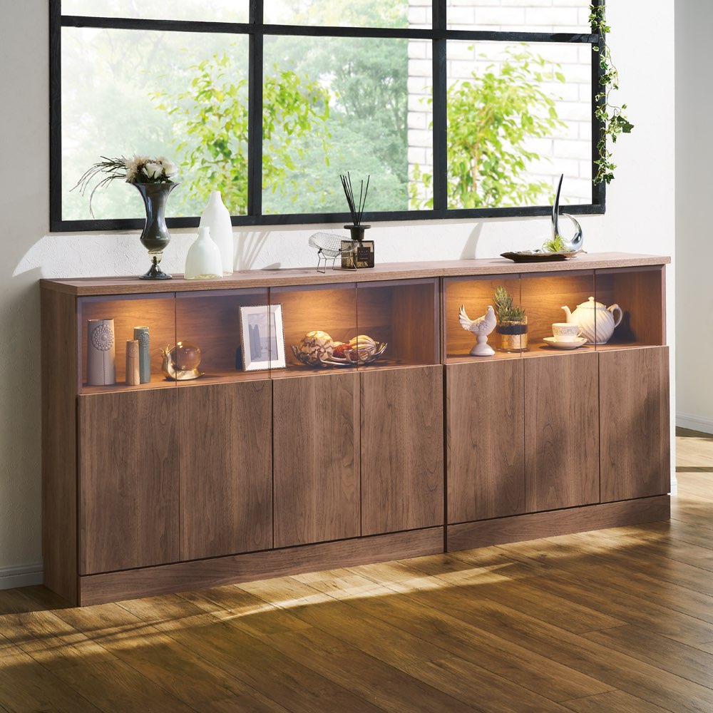 造り付けのようなディスプレイ収納が自宅でお手軽に実現できるおしゃれ本棚です。高級感のあるLEDライトは自慢のコレクションを美しく飾ります。造り付けのようなディスプレイ収納が自宅でお手軽に実現高級感あふれる光沢仕上げの前面扉と美しいLEDライトが、収納物を引き立て、部屋全体の雰囲気をグレードアップ。簡単に設置できるので、お手軽に自宅を格上げするインテリアとしておすすめです。ワンタッチで点灯するLEDライトでコレクションを美しく照らすスイッチひとつで点灯する暖色系ライトで、中身をほんのりおしゃれに照らし出します。安全性の高いクリア扉には、ガラスではなく厚みのある樹脂を使用しているため、安心してお使いいただけます。また、縦の仕切りがない設計で、様々なアイテムを思い通りにディスプレイできます。3cm間隔で高さ調節可能!自由自在に使える可動棚で効率収納3cm間隔で高さを調整できる可動棚板が1枚付いているので、収納物の大きさに合わせて効率よく配置ができます。収納の自由度が高く、どんなアイテムも無駄なく整理整頓することが可能です。また、プッシュ式扉は軽く押すだけで手前に開くため、収納物の取り出しもスムーズ。インテリアとの調和を保つ!実用的な台輪付き地板と幅木よけ背板台輪付きの地板を採用しているので、ラグやカーペットの上でも扉が滑らかに開閉できます。背板には1×8cmの幅木よけが付いているため、幅木のある壁にもきれいに設置できます。光沢感と木目の美しさで生活感をすっきり隠す板扉前面の板扉ホワイトは光沢感のある鏡面仕上げが高級感を演出。ウォルナットは天然木そのもののような美しい木目と色合いで、どんなインテリアにも調和します。これにより生活感をすっきりと隠し、上品で洗練された空間を作り出します。絶妙な高さでリビングや書斎にぴったり!便利サイズの本棚本棚の高さは87cmと低めに設定されており、リビングや書斎での圧迫感がありません。また、窓下やカウンター下にも収まる便利なサイズ感が特徴です。色はホワイトとウォルナットの2種類からお選びいただけます。安心安全の日本製!高機能F☆☆☆☆本棚この本棚は、ホルムアルデヒドの含有量が低いF☆☆☆☆(フォースター素材)を使用しており、お子様やペットがいるご家庭でも安心してお使いいただけます。日本製の高品質な完成品で組み立ての手間もなし!