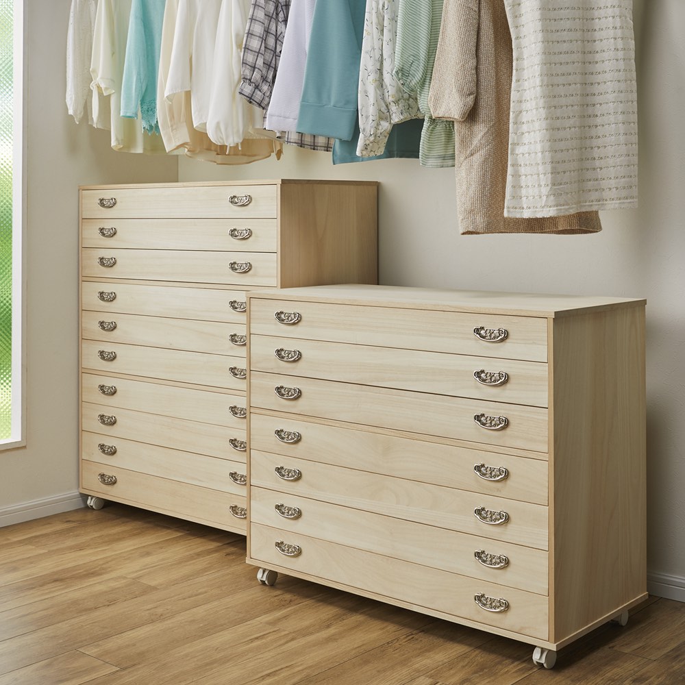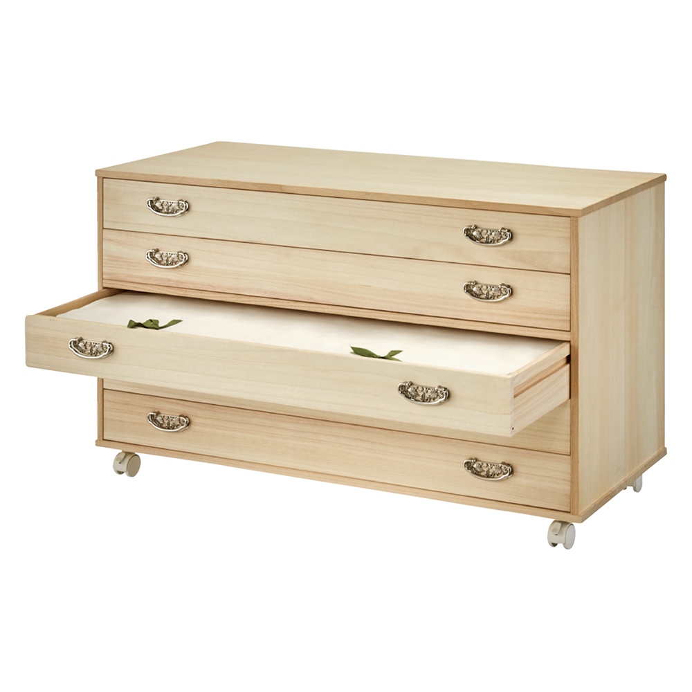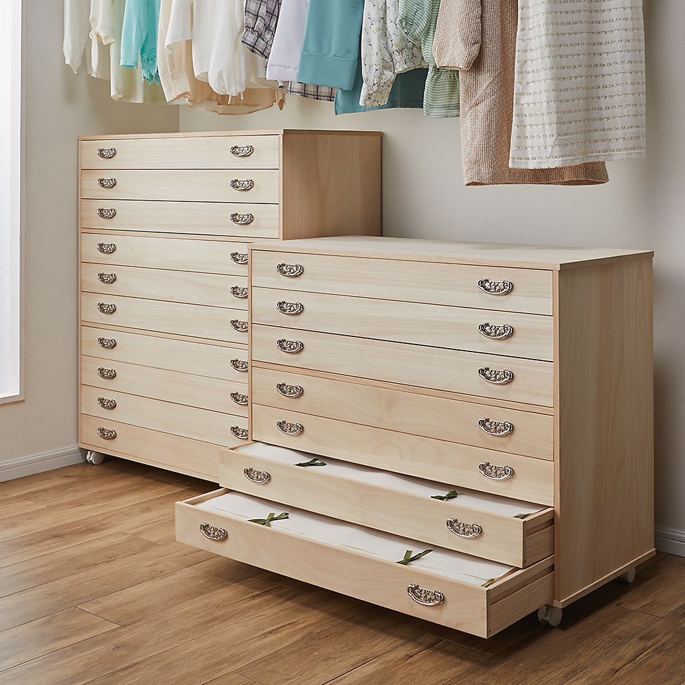 和室がない、大きい箪笥が置けない方にお勧めの着物収納。大切な着物を1枚1枚大切にしまいたい方にもぴったり。キャスター付きなので、ウォークインクローゼット内でも邪魔にならずにスマートに着物を収納できるの着物用タンスです。大切な着物を大切に保管できる総桐収納●大切な衣類や着物の収納に適した総桐仕様のキャスター付きワゴン●和室がないようなお家でも、手軽に着物収納空間を作れるのが魅力●着物を重ねず収納できるので、1枚づつ出し入れしやすく着物選びも華やぎます●側板や背面にも桐天然木を使用している本格派の商品です【桐材の特長】◇桐材は湿度が高くなると湿度を吸い、逆に外気が乾燥すると湿気を吐き出す調湿機能◇収縮率が少なく反りや歪みが起きにくいので、長い愛用にも応えてくれます。◇木材の中でも軽い素材なので、配置換えや引っ越し等の持ち運びの用意さも魅力の一つ◇桐にはタンニン等が多く含まれているため、害虫を寄せ付けにくい特長があります◇中に空気を多く含んで熱を伝えにくい性質のため、燃えにくい素材ですクローゼット内を有効活用できるキャスター付きのワゴンタイプ●簡単に動かすことができるので、ウォークインクローゼット内でもスペースを有効活用して着物収納を増やせます●引き出さなくても収納物が見える盆収納タイプと薄手の衣類も収納できる浅引きタイプの2型をご用意●どちらも幅100cmで大判のたとう紙も折らずに収納できます●収納量に応じて、5杯(段)・7杯(段)・10杯(段)からお選びいただけます熟練の職人による日本製●佐賀長崎地方のかつての総称《肥前》にちなんだ《肥前桐民芸》の商標を取得している商品です●日本の桐職人が桐材を厳選し、丹精込めて一点一点作り上げました●長く使うものなので拘り抜かれた高品質の商品をお楽しみください●素材はグレードの高い【F☆☆☆☆】材を使用しています※「F☆☆☆☆」材とは…JISにより定められている安全性の高い規格であり、人にも環境にもやさしい素材です