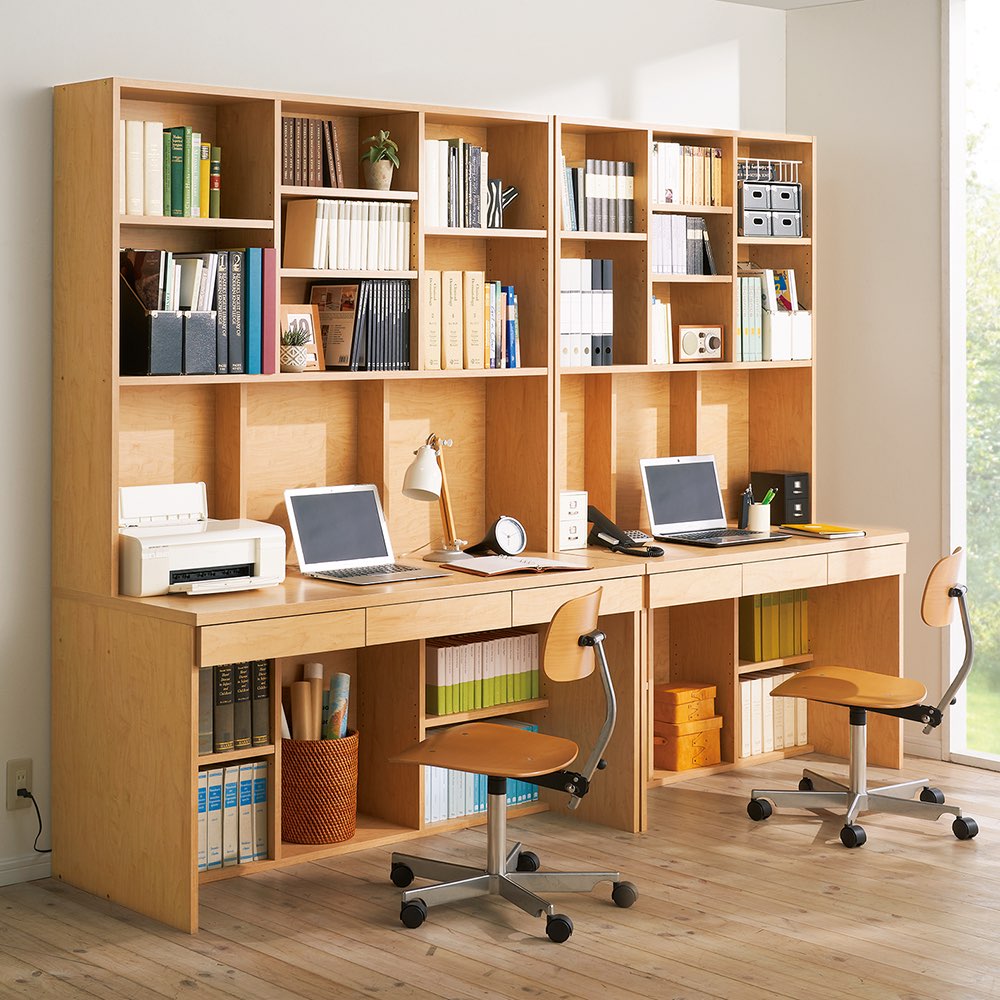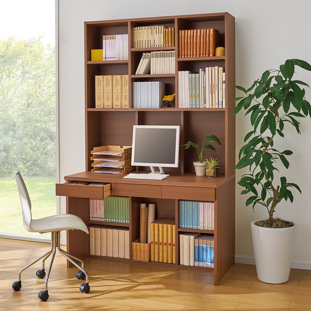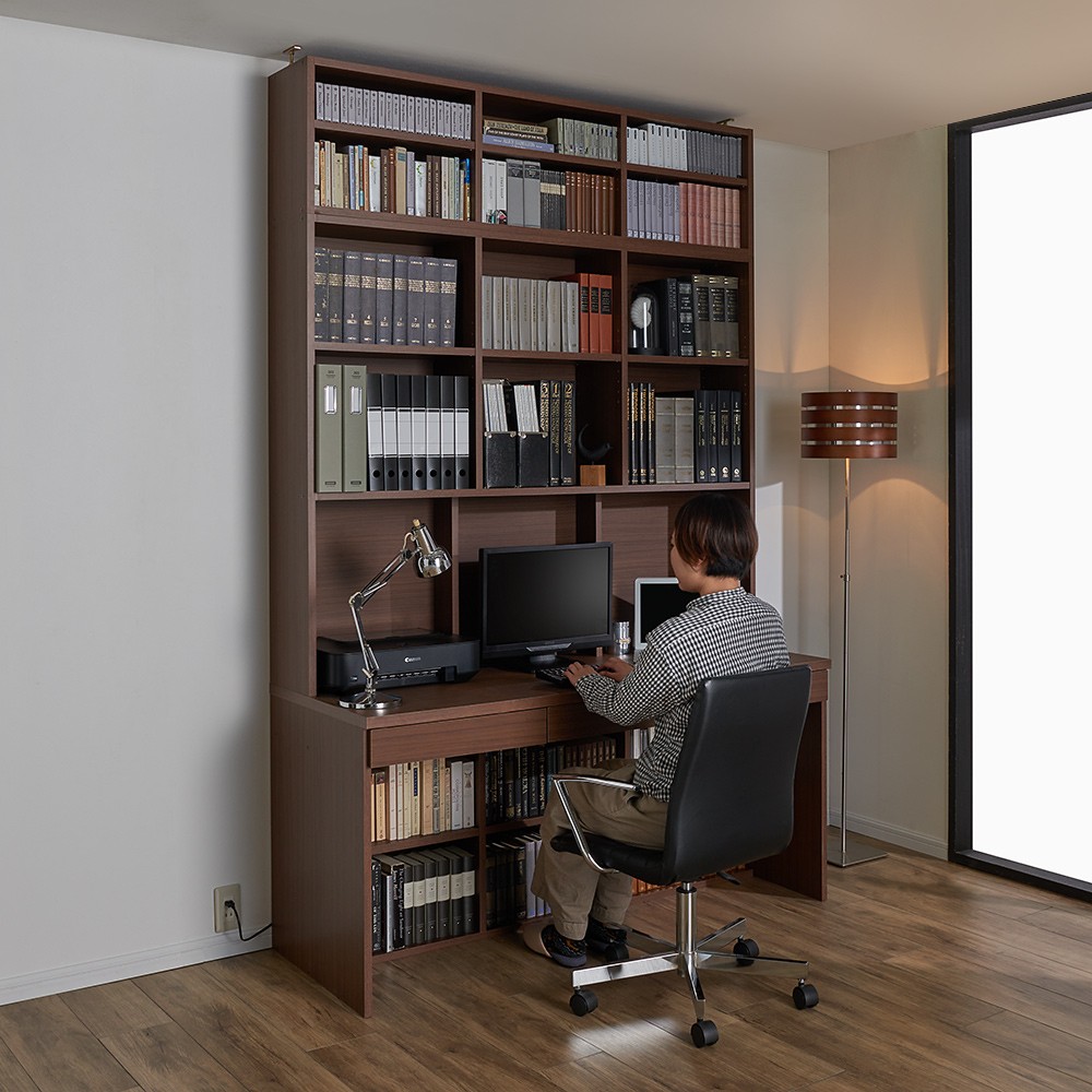 ファイルや資料を壁一面に大量収納!広いデスクトップとたっぷりの収納で、本格的なオフィス空間を自宅に実現。趣味も仕事もじっくりできる本棚一体型デスクです。テレワーク・リモートワークにもおすすめです。広いデスクトップデスク天板は深めの奥行58cm。幅は120cmと150cm・幅180cmのワイドサイズ。パソコンの作業や書き物などに、広々使えます。大量に収納できる書棚デスク下にもデスク上にも、たっぷり大量に収納できるブックシェルフ。3cmピッチで可動A4ファイル対応の奥行24cm。配線もすっきりデスクの上で乱雑になりがちなノートパソコン、ディスプレイ、デスクライトなどの電源ケーブル。天板奥両サイドの配線穴から、デスク裏を通して壁のコンセントに。デスクの背面には、電源タップ置き場も設備しました。引き出し付きデスク天板下には引き出し3杯付き。筆記用具や小物などをさっとしまえます。デスク2台を並べて、ツインデスクとしても使えます。●別売りの専用上置きを併用して収納力もアップ。天井突っ張り式の上置きを設置時で天井高さ238〜250cmに対応。