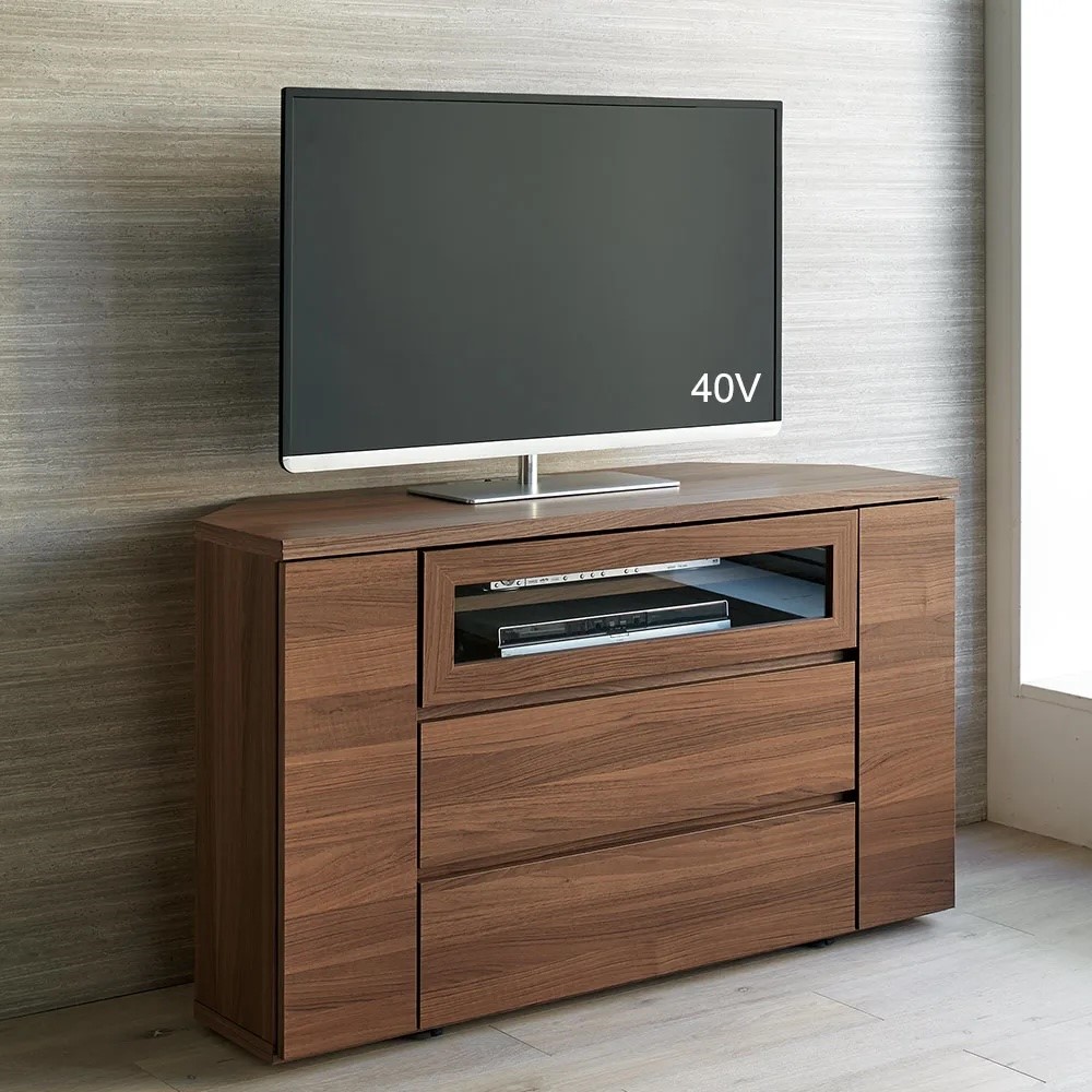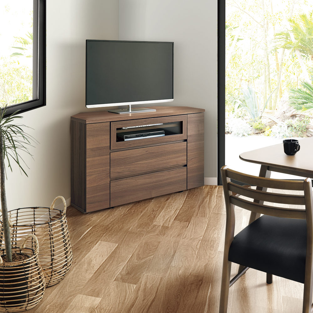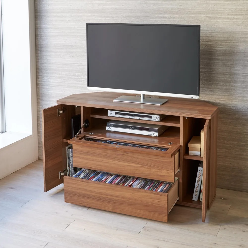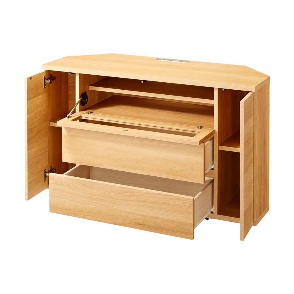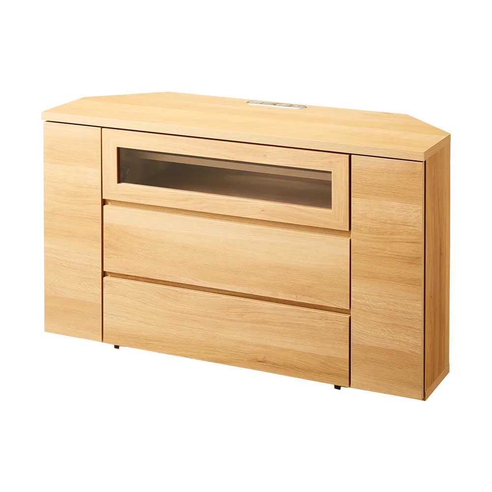 「テレビはコーナーに置きたい」というご要望から生まれたテレビ台(TVボード)。角のスペースが活かせて、お部屋のいろいろな場所からもテレビが観やすくなります。サッと移動させてラクラクお掃除。配線のしやすさとスッキリ感が人気ブルーレイレコーダーとテレビ端子との配線はもちろん、テレビ台内部にコードが通せるスペースがあります。ごちゃごちゃしがちな配線コードがスッキリまとめることができてテレビ台周りがきれいになります。温かみあふれる天然木調の仕上げで、こだわりのインテリアにもすっきりなじみます。サッと移動させてラクラクお掃除キャスター付きなので移動もラクラク。背面のお掃除も簡単にできます。動かしやすいので、配線作業も容易にこなせます。 CD・DVDもたっぷり収納引出しスライドレールなので開閉もスムーズで奥まで出し入れが簡単です。検索性の高い引き出し構造で、ストレスなくお気に入りのメディアを探せます。ゲーム機収納もおまかせ左右扉にはwii等のゲーム機本体を、中央オープン部にはwiiフィットを収納できます。左右収納部のゲームやルーター・モデムと、ハードディスクなどの機器との配線にも配慮した設計です。組み立て不要の完成品TV台完成品のためお届後すぐに使えます。【信頼と安心の国内工場での生産品】管理の行き届いた日本国内の工場で、加工から製造、梱包に至るまで丁寧に仕上げました。細部の丁寧な仕上がり、国産品ならではの品質は自信を持っておすすめします。