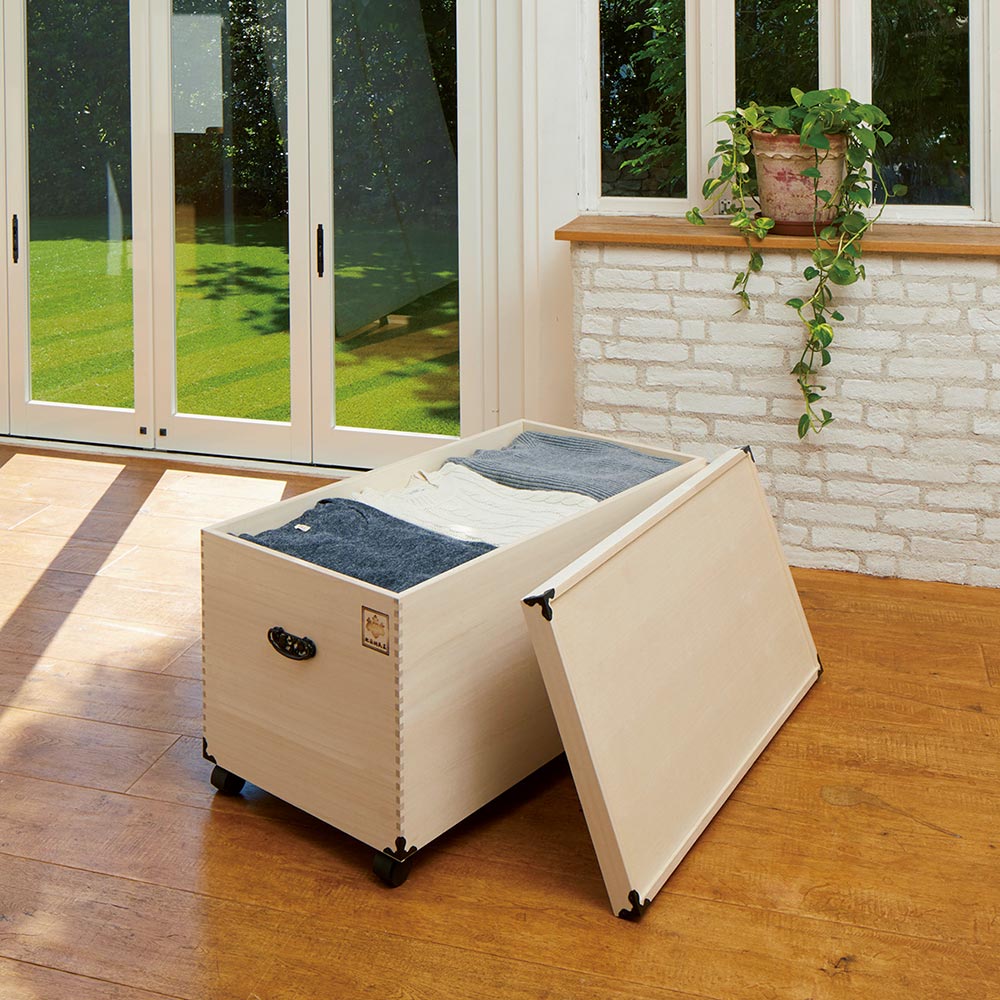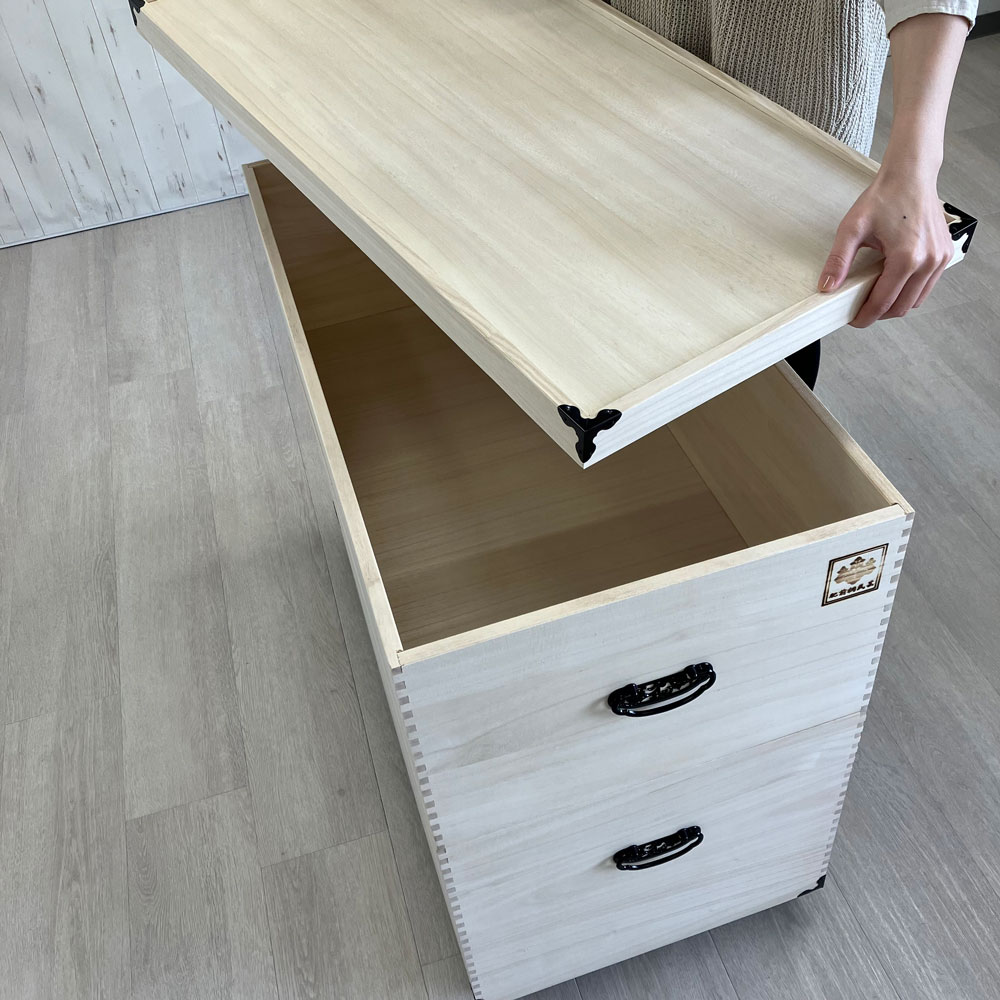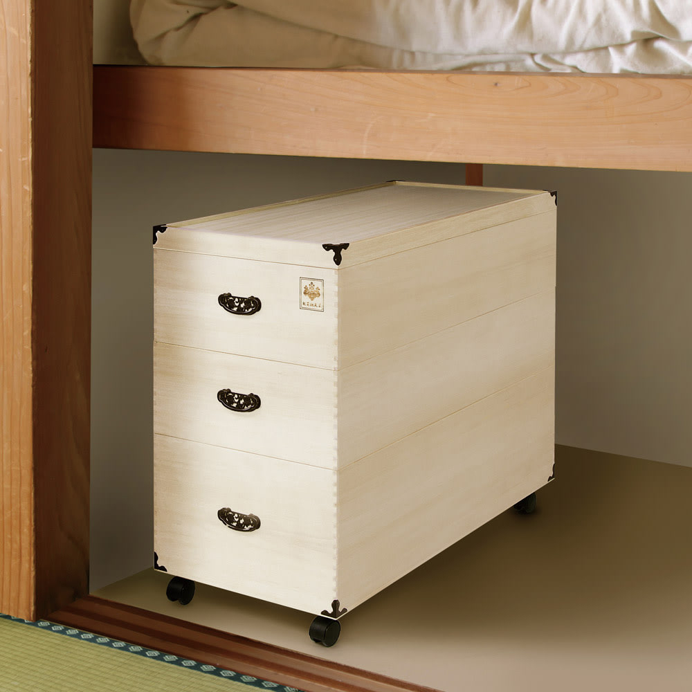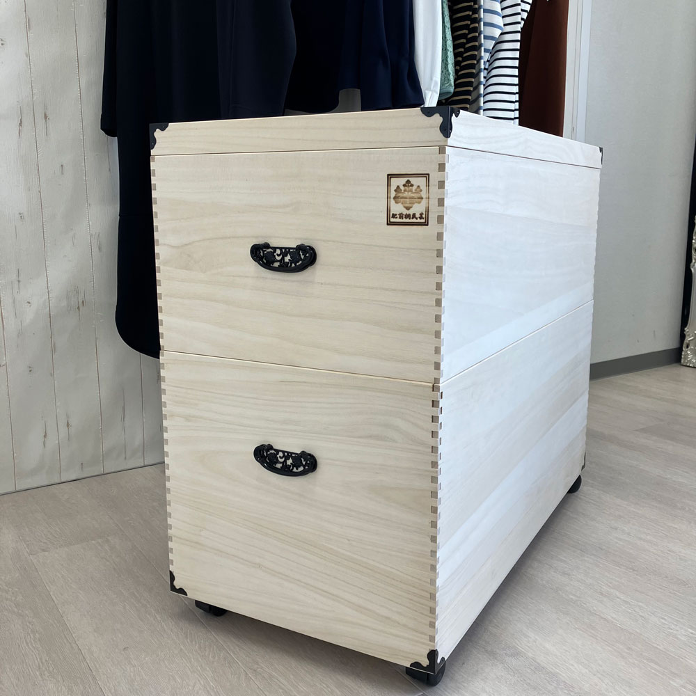 カシミヤやシルク等の大切な衣類や、お雛様を翌年のひな祭りまで安心して保管できる総桐製の専用ケース。押し入れやクローゼットにも収納しやすいサイズで、出し入れしやすいキャスター付きです。大切な雛人形をしっかり保管できる総桐製の収納庫●素材は湿度が高いと湿気を吸収し、乾燥すると湿気を放出して内部の湿度を一定に保つ、調湿性に優れるといわれる桐を使用。●長期保管も安心してできます。●押し入れやクローゼットにもしまえるサイズで、キャスター付きなので出し入れも簡単にできます。●雛人形だけではなく、和服や洋服、湿気を避けて保管したいフィギュアや模型などの収納にもおすすめです。調湿機能に優れた桐材は衣類や着物の収納に最適。着物やカシミヤ等、大切な衣類の保管には桐収納がおすすめ。桐は古くから日本の四季に適した材として、箪笥などによく使われている素材です。桐材は他の材と比べて調湿性が高いため、周りの湿度が高い時には湿気を吸収し、湿度が低い場合には、湿気をはき出してくれる効果があります。お手持ちの人形に合わせて選べる4タイプがラインナップ●本品は深2段タイプで大き目の人形や5飾りに収納に適したサイズです。●シリーズ商品には、1段タイプ(平飾り・親王飾りに)、2段タイプ(3段・5段飾りに)、3段タイプ(7段飾りに)もあります。※人形やセット内容により、大きさや形が異なりますので、必ず有効内寸をご確認ください。【有効内寸】◇1段タイプ:幅79cm奥行38.5cm高さ33.5cm◇2段タイプ:幅79cm奥行38.5cm高さ16cm(浅箱)・23.5cm(深箱)◇3段タイプ:幅79cm奥行38.5cm高さ16cm(浅箱×2杯)・23.5cm(深箱)◇深2段タイプ:幅79cm奥行38.5cm高さ24.5cm(浅箱)・33.5cm(深箱)