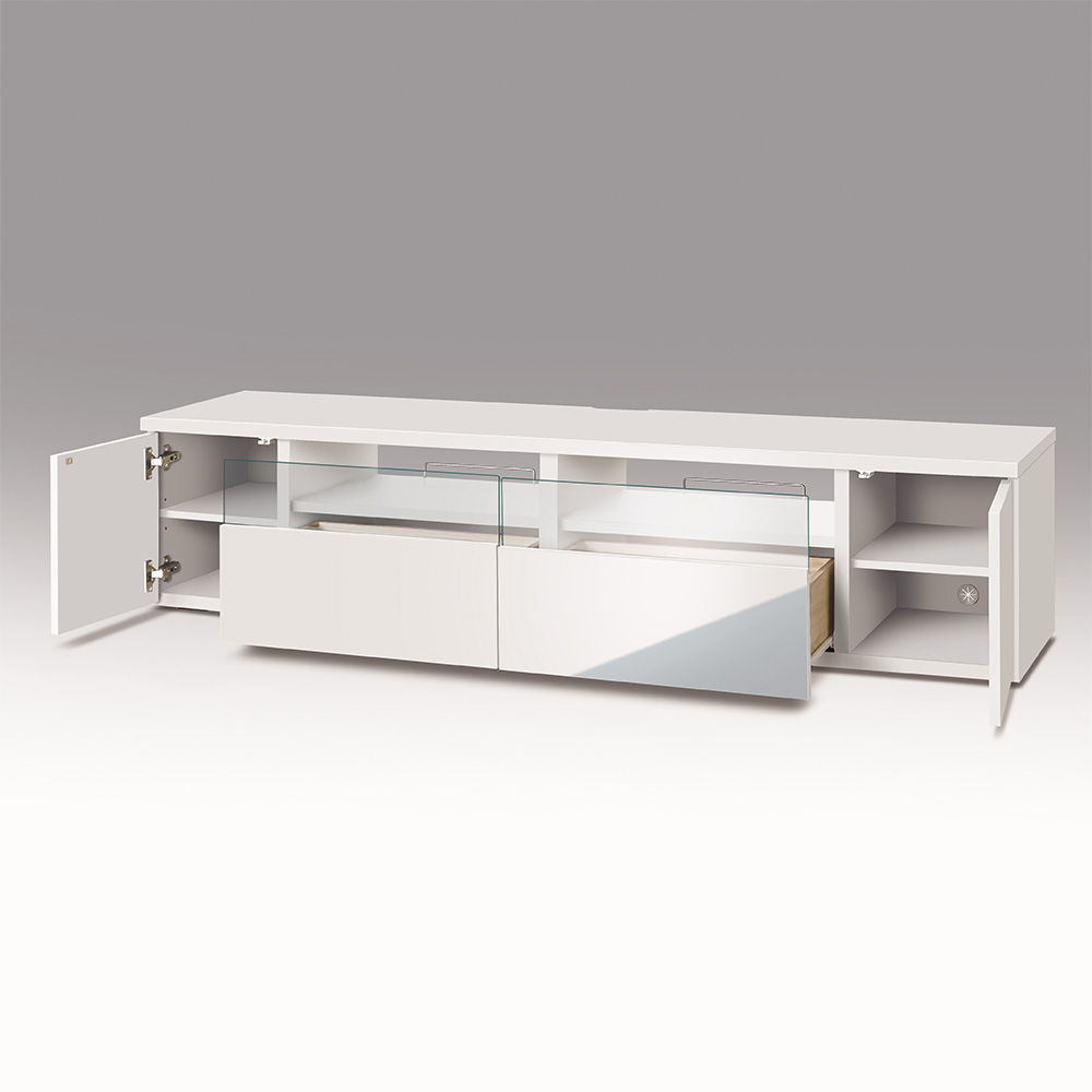 使用例:幅172cmタイプ (イ)ホワイト 引き出し2杯にはリビング小物を、さらに左右の扉にはルーターやモデムまで収納。