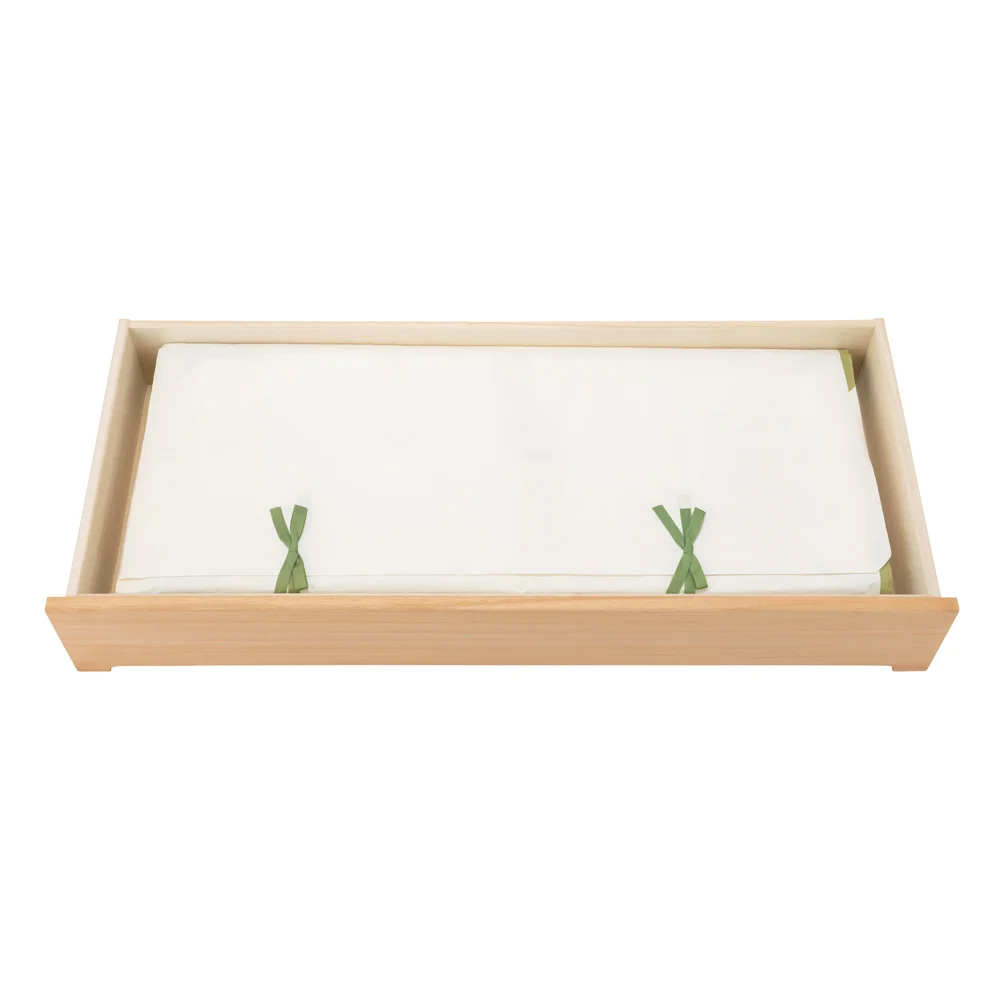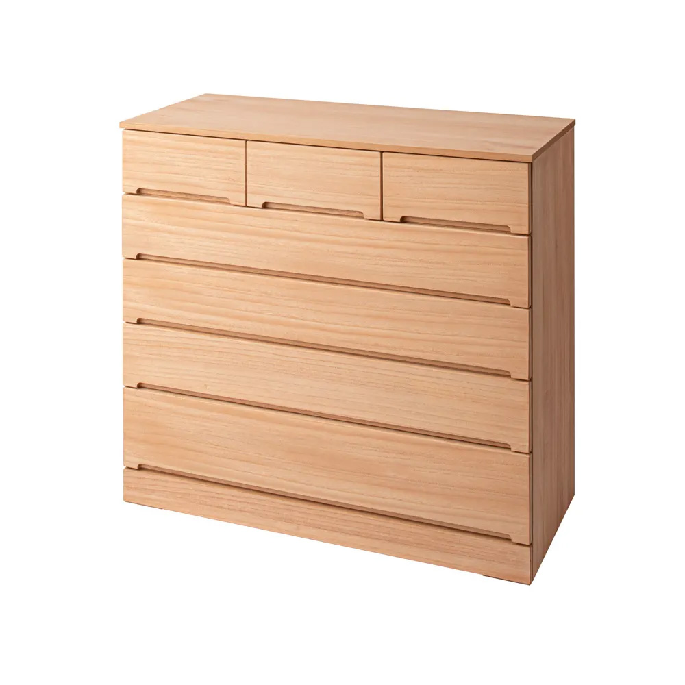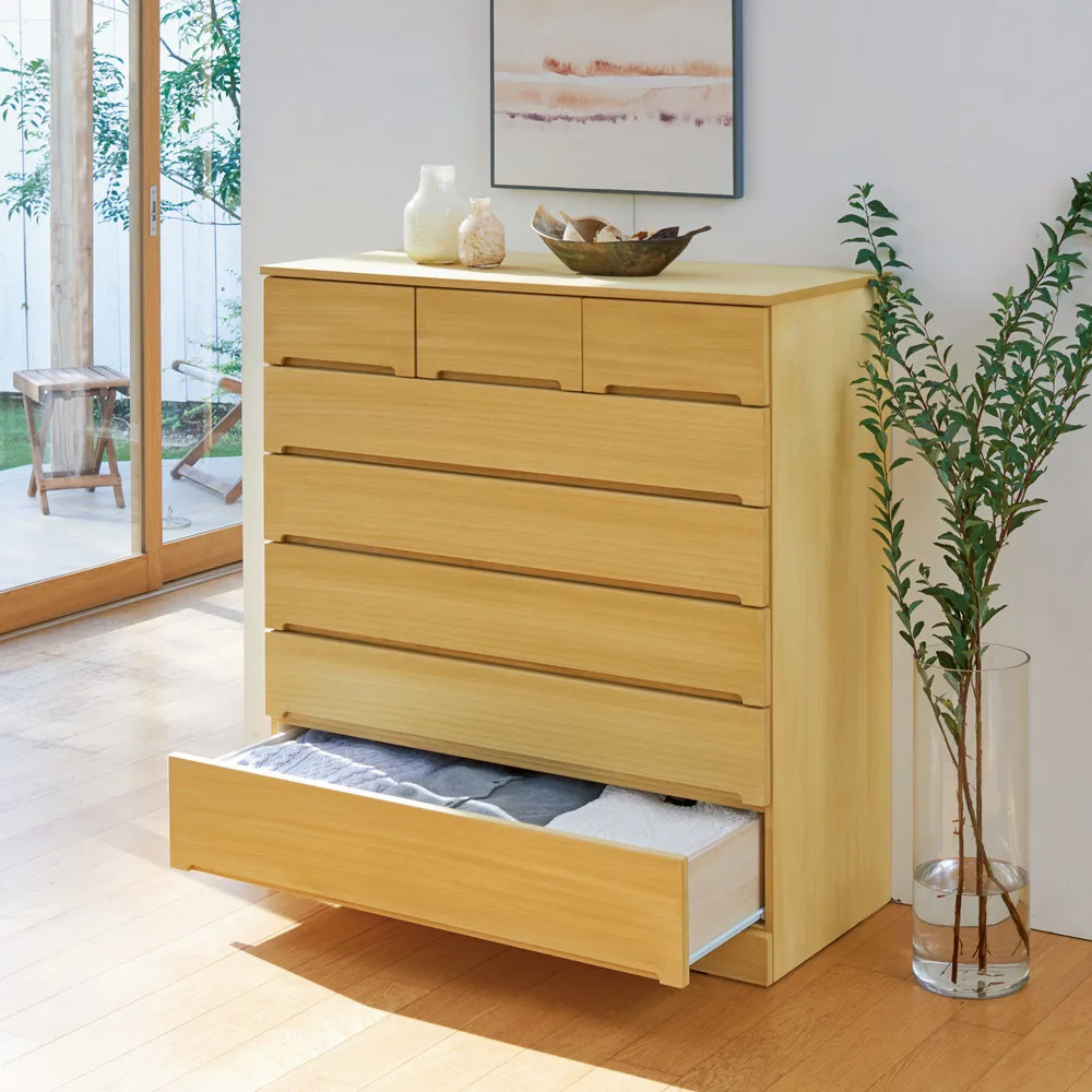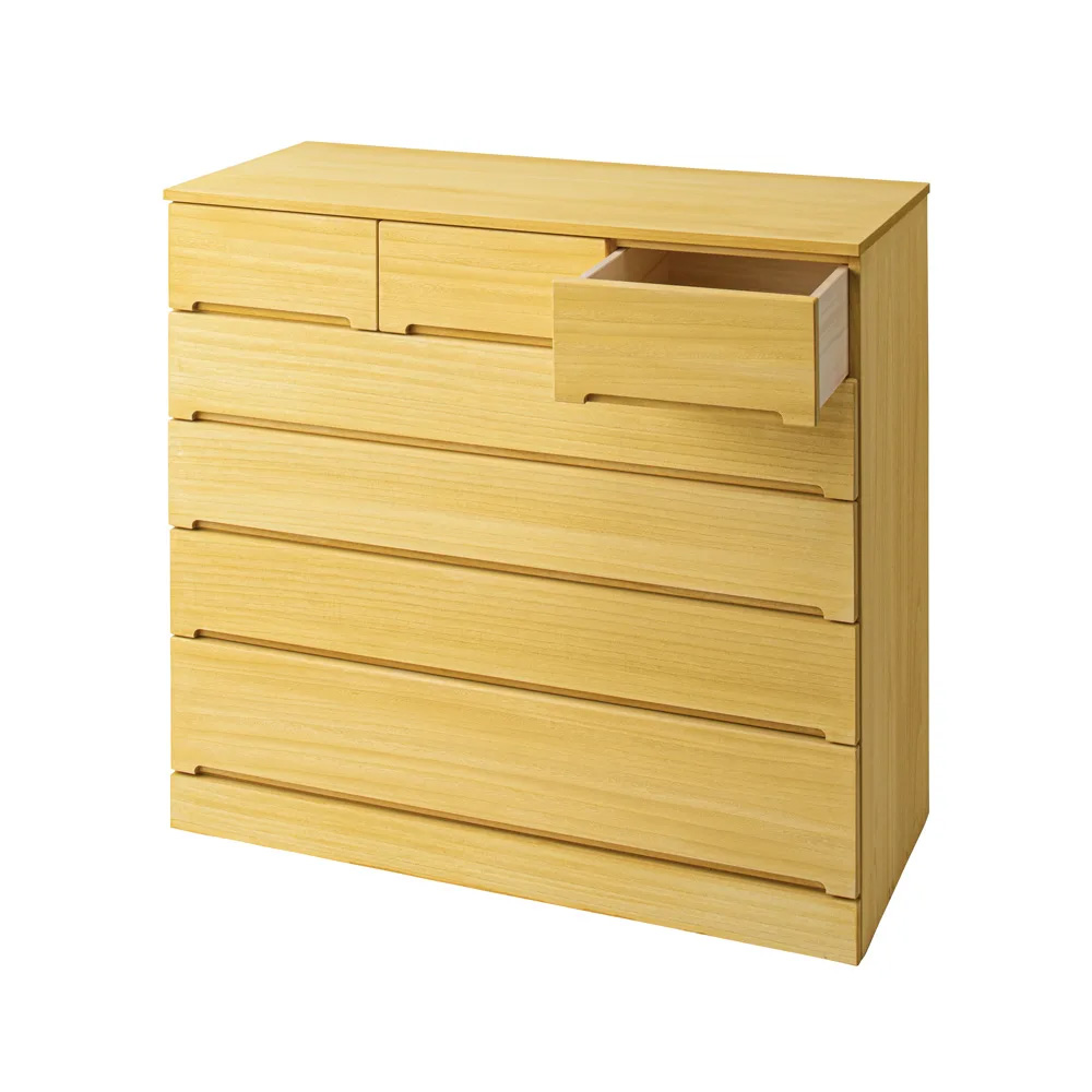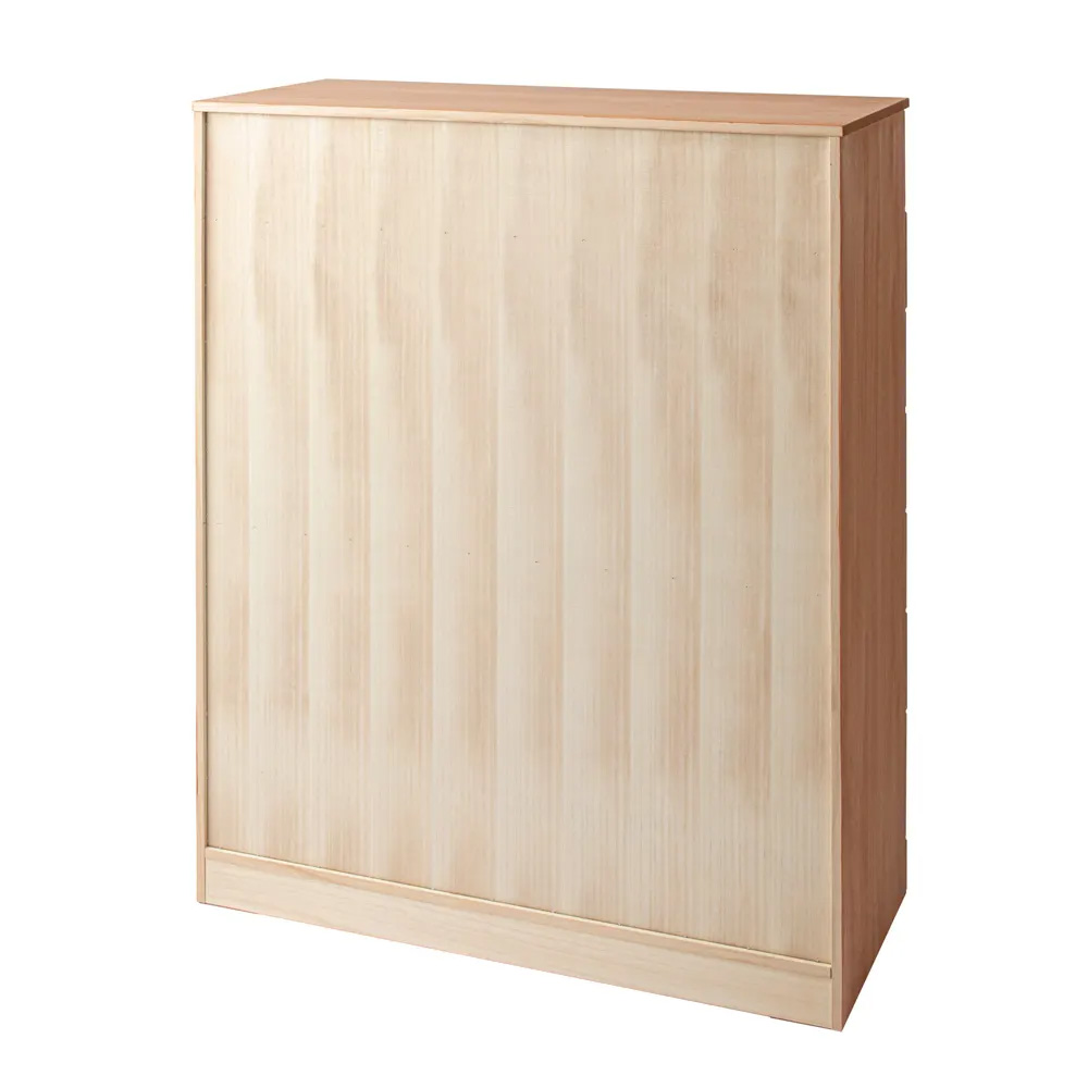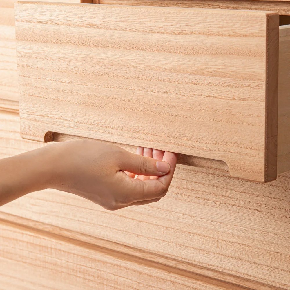 洋間やリビングに置いても映えるモダンな佇まいで、仕上げが「柿渋仕上げ」と「とのこ仕上げ」から選べます。引き出し最下段にはスライドレール付きで、スムーズに開閉できます。日本の伝統が生んだ衣類に優しい総桐チェスト●素材は細部にまでこだわった総桐仕様。大切な衣類をやさしく保管できます。●桐材は調湿効果があり、全体が呼吸しているので内部は一定の湿度に保つと言われています。●湿った外気に対しては膨張してからの湿気を防ぎ、空気が乾燥すると湿気を発散して収縮します。●気密性にも優れており、衣類を長期間にわたり保護します。また、防虫性にも優れています。●桐材は非常に軽量なため、配置換えや引越し時の移動も気軽に行えます。●引き出しは、箱状の引き出しを作り、更に前板を付けた箱組み構造。がたつきにくく、非常に強度があります。●引き出しの間は全段地板入りで強度をアップ。すき間をふさいでホコリの侵入も防ぎます。仕上げのタイプがお好みで選べます●(ア)柿渋仕上げ…柿渋の歴史は古く、平安時代末期から使用され、木材保護や染料など幅広い用途に用いられてきました。渋柿の液汁を発酵熟成させてつくられる柿渋は防腐防虫作用など、多くの優れた効能があるといわれています。塗装直後にはあまり色が出ませんが、お使いいただくにつれ色合いが変化していくのが大きな魅力。木自体の経年変化との相乗作用で、時とともに趣のある風合いを楽しむことができます。●(イ)とのこ仕上げ…「とのこ」と呼ばれる粉を水溶きしてを塗ることで高級感のある色になり、変色を目立たなくします。桐本来の白っぽい色よりは、少し黄色がかった色合いです。汚れや手垢が目立ちにくく、桐材そのままの呼吸を妨げない加工です。また浮造り仕上げにより木目をはっきり際立てます。最終加工で、ざらざらした表面を特殊技術によりなめらか且つ艶を出しています。使いやすく、着物も洋服も収納できるサイズ展開●幅は100cm、奥行は44cmで、和室にも洋間にも圧迫感なく置けるサイズ感です。●高さは5段(91cm)・6段(106cm)・7段(121.5cm)の3サイズから選べます。●最上段には3杯の小引き出し付き。和装小物や数珠・袱紗(ふくさ)、ハンカチやスカーフ、下着などが見やすく整理できます。●収納物が引き出しに巻き込まれるのを防ぐ地板付き。●最下段の引き出しはレール付きで、スムーズに開閉します。●2〜4段目は幅内寸93cm、高さ内寸12cmのワイドな引き出し。最下段は幅内寸90.5cm高さ内寸13.5cmの深引き出し。着物はもちろん、洋服も収納しやすいつくりです。●設置スペースや収納量に合わせて、ぴったりのサイズをお選びください。●このページでご購入できるのは「5段(高さ91cm)」タイプです。仕上げは(ア)柿渋仕上げ(イ)とのこ仕上げから選べます。熟練の職人による日本製●佐賀長崎地方のかつての総称《肥前》にちなんだ《肥前桐民芸》の商標を取得している商品です。●日本の桐職人が桐材を厳選し、丹精込めて一点一点作り上げました。●長く使うものなので、こだわり抜かれた高品質をお楽しみください。●組み立て不要の完成品。届いたらすぐにお使いいただけます。●素材はグレードの高い【F☆☆☆☆】材を使用しています。※「F☆☆☆☆」材とは…JISにより定められている安全性の高い規格であり、人にも環境にもやさしい素材です。