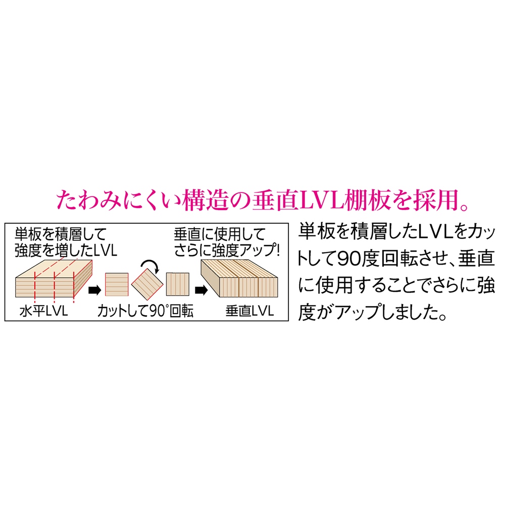 たわみにくい構造の垂直LVL棚板を採用。単板を積層したLVLをカットして90度回転させ、垂直に使用することでさらに強度がアップしました。(※写真はイメージ)