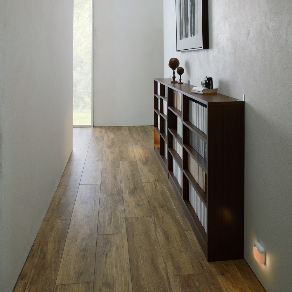 コーディネート例(イ)ウォルナット 奥行20cmなら狭い廊下でも圧迫感なし。脚元灯も生かせる! ※写真は幅90奥行20cmタイプ、幅120奥行20cmタイプ