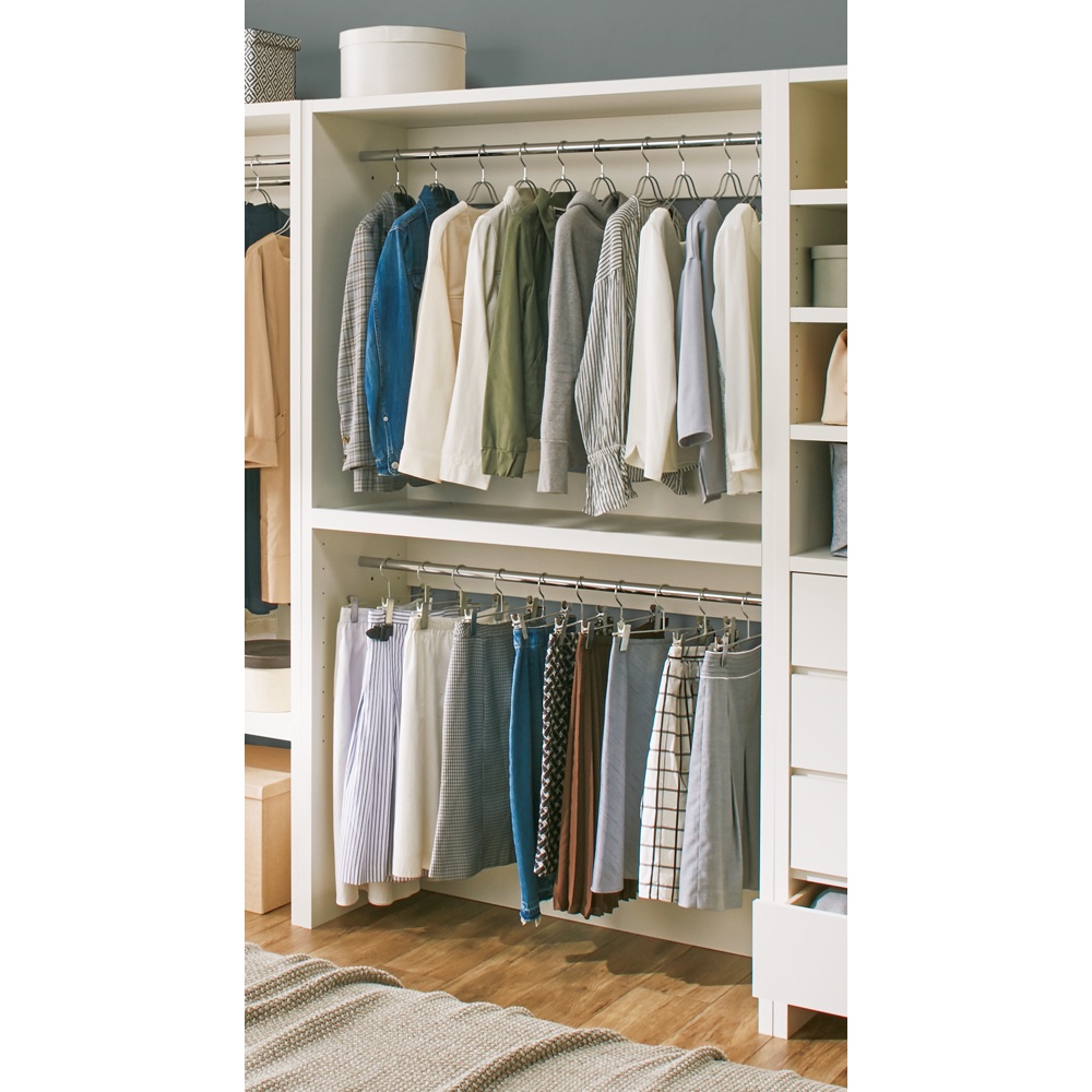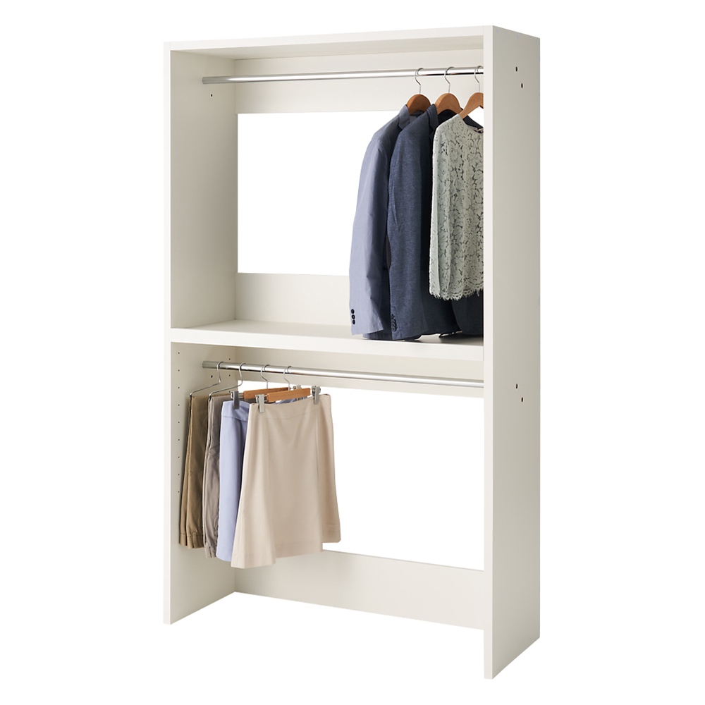 自宅にウォークインクローゼットが手軽に作れる収納シリーズ。空いた子供部屋や納戸を素敵な衣装部屋にリフォームできます。ハンガータイプと棚タイプを組み合わせればあなただけのクローゼットが完成。スペースに合わせて幅や奥行をお選びください。空き部屋が憧れのウォークインクローゼットに●備え付けのようなウォークインクローゼットが自宅で手軽に実現できる衣類収納シリーズです。●収納タイプとサイズを豊富にそろえているので設置スペースにぴったり合った、 自分だけの衣類収納をつくることができます。●ハンガータイプの幅は90cm、120cm、150cmの3タイプより、 棚タイプの幅は30cm、45cmの2タイプからお選びいただけます。●奥行は44cm、55cmの2タイプをご用意しました。 お部屋のスペースや使い勝手に応じてお選びください。●本体高さは200cmあるので天井までの空間を生かしてたっぷり収納できます。多彩な収納でかなう大量収納●ハンガータイプはお好みの方法で使うことができます。●【前後でダブル掛け】 上のハンガーバーを前後に1本ずつ付ければ手前と奥に服を2列掛けられます。 着丈の長い服をシワなくきれいにしまいたい方へおすすめです。 棚板下にも荷物を収納することが出来ます。●【上下で2段掛け】 ハンガーバーを上段・下段にそれぞれ1本ずつ付ける方法です。 着丈の短い服やパンツ、スラックス、スカートをたくさんお持ちの方へおすすめです。 上段は大人用、下段は子供用などファミリークローゼットとしてもおすすめです。たたみのアイテムやバッグなどは棚タイプを組み合わせて●幅が選べる棚タイプを組み合わせれば、収納のバリエーションはさらに広がります。●下段の引き出しは全段スライドレール付きで、衣類の出し入れもスムーズ。●セーターやニット、カーディガンなどたたむ衣類の収納に便利です。●棚タイプは完成品でお届けするので、届いたらすぐにお使いいただけます。●細かい点までこだわりぬいた安心・安全の国産家具です。