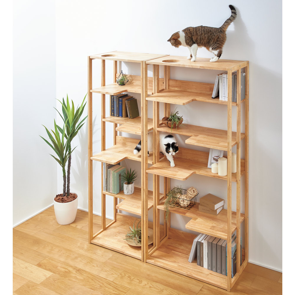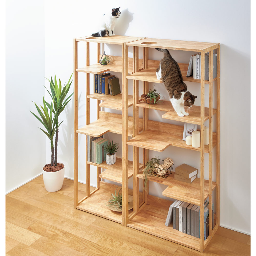 「収納のディノス」が本気で作った、ネコと暮らす愛書家のための本棚です。本をたっぷりしまえる収納力を保ったまま、猫が遊べる工夫を随所に。ヒトには本棚、ネコには遊び場として一台二役で活躍します。ネコを飼っている人が快適に暮らすための家具をつくりました◆お部屋の限られたスペースに収納家具を置いて、ネコ用タワーも置いて…となると必然的に生活スペースが削られてしまいます。◆「一つの家具を、人とネコがそれぞれ別の目的で使えたら」スペースを無駄遣いすることなく、お互いが幸せに暮らせるのではと企画しました。◆本棚とキャットタワーの両方を置くと部屋が狭くなってしまいますが、このラックなら、1台2役!◆たとえネコが気に入って使ってくれなくても、人が使う家具として満足する収納力を備えています。本棚としての収納力を保ちながら、猫の導線をしっかり確保◆棚板奥行は広い部分が40cm、細い部分でも23cm。雑誌などの大型本から文庫本まであらゆる本を収納できます。◆棚板の出っ張り部分を互い違いになるようにセットすれば、ネコ用ステップになります。◆最上段(天板)部分は丸い穴がくり抜いてあり、ここから天板部分へ登ることができます。◆ラックを複数使いすれば、ネコちゃんのジャングルジムのようにお使いいただけます。ねこにも人にも優しい天然木を贅沢に使用◆丈夫なラバーウッドを使用し、汚れに強いウレタン塗装で仕上げました。◆ホルムアルデヒド含有量の少ない接着剤を使用しています。◆天然の節目を活かした木肌は、長く使うほどに風合いが深まります。◆猫がスムーズに昇り降りできるように、角は丸く滑らかに仕上げています。◆可動棚は本のサイズに合わせて各2段階で調節できます。◆転倒防止金具付き。担当者からのメッセージ◆猫が大好きなので、ネコと人の両方が幸せに暮らせるよう願いを込めて企画しました。◆収納家具としての完成度にこだわったので、将来ねこを飼う予定の方にもご満足いただけると思います。◆高価な施工工事をしなくても、通販で手軽にネコと暮らす家づくりを実現できます。◆「ネコと暮らす家を作るにはリノベーション工事が必須では?」と思っている方にこそご検討いただきたいシリーズです。
