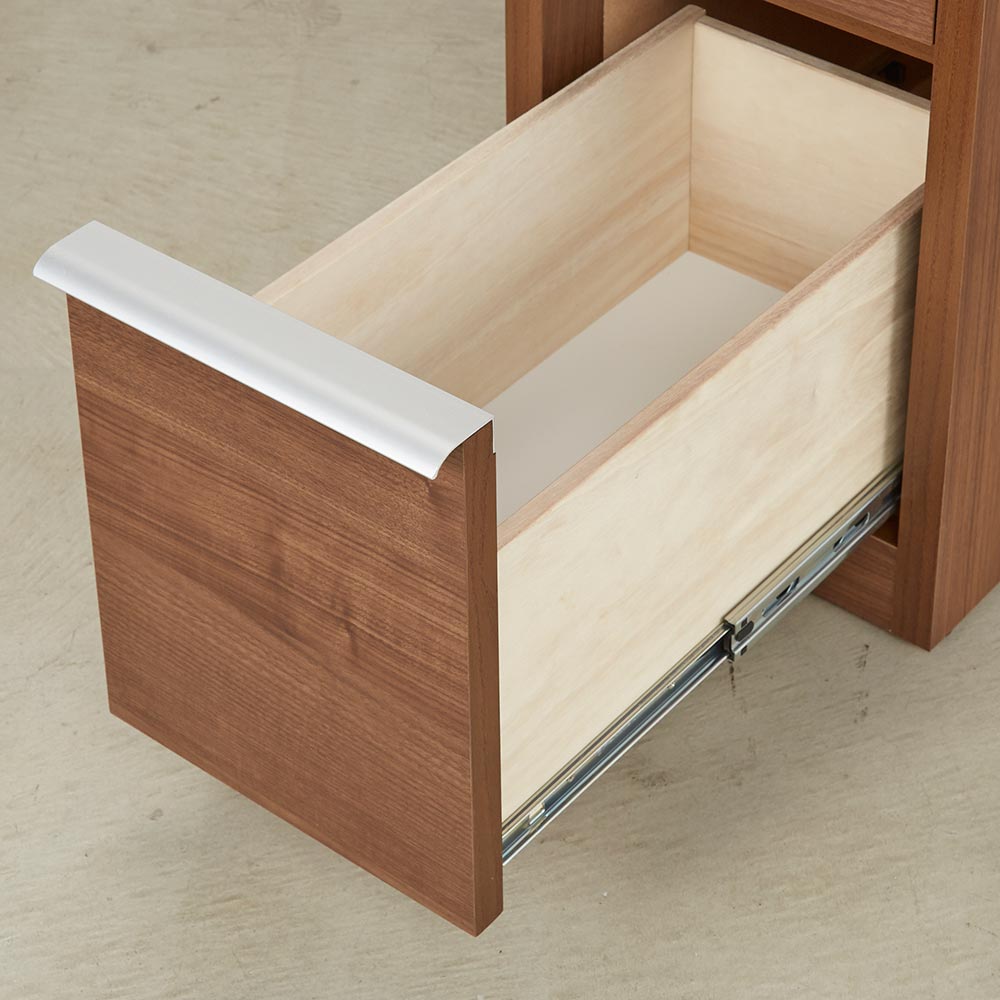 マットなアルミ仕上げの取っ手は座ったままで引出やすく、開閉もスムーズ
