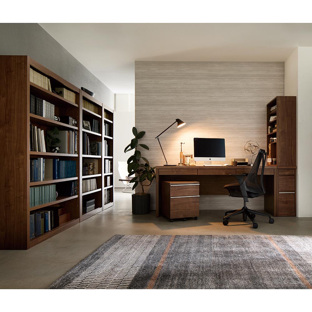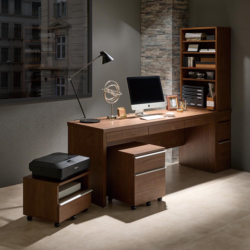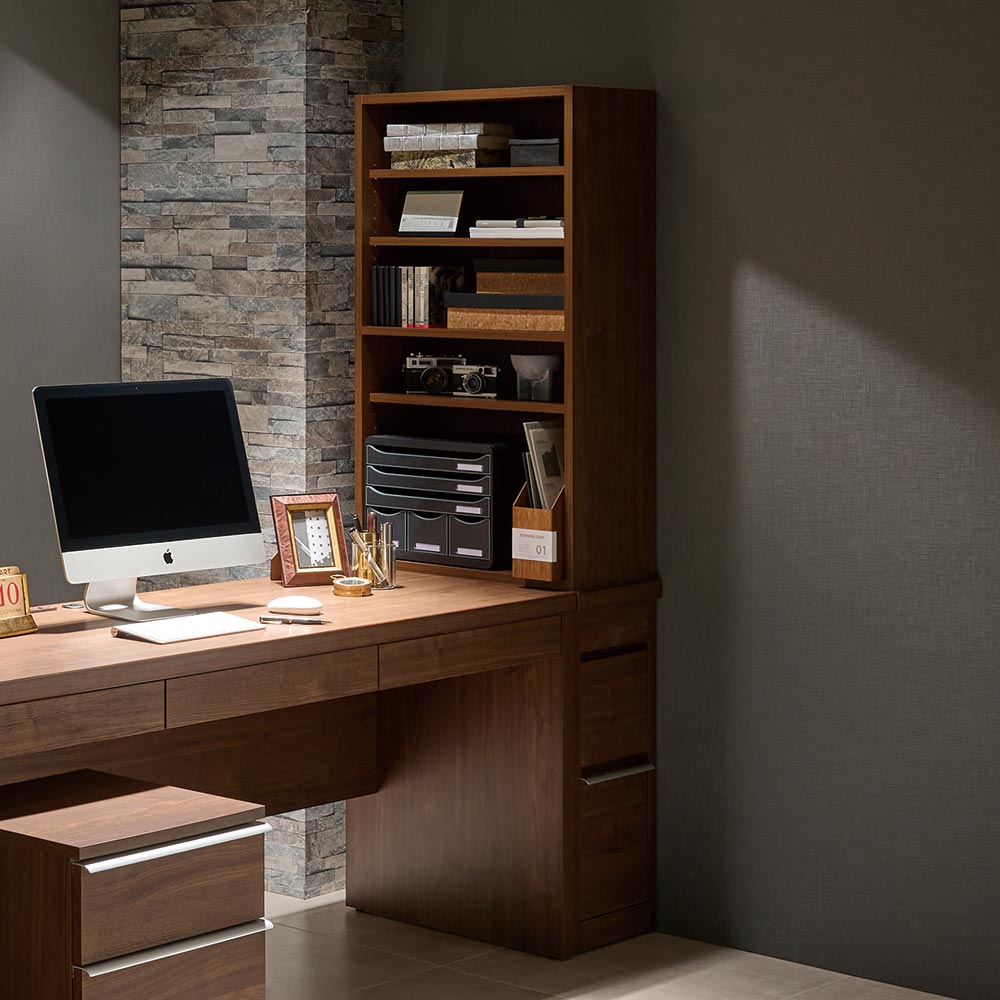 シンプルだからこそ際立つ端正で重厚な存在感のオープンラック(デスクサイドラック)。天然木調にアルミラインがクールな印象を放つ、文房具や書類が分類できる日本製(九州・大川市)引き出し付き収納です。高級感と重厚感を醸し出す天然木調オープンラック(デスクサイドラック)●ウォルナット柄・オーク柄の厚みあるフレームにする事で、 ヨーロッパのモダン家具のようなデザインに仕上げています。●書斎や趣味部屋、ホームオフィスのデスクサイドラックとして スタイリッシュに空間を演出するおしゃれなデザイン家具です。●アルミ取っ手が存在感を放つ、シンプルモダンデザイン。 単体でもおしゃれな多目的収納として使用できます。●デスク作業を効率化するサポート収納として リビングを整理するマルチな収納として大活躍です。●デスクと合わせて設置すれば使い勝手が広がる。●シリーズ品のデスクと組み合わせれば より充実したワークスペースが実現します。毎日の使いやすさを考えた機能性●座ったままでも取り出しやすい。引き出しはレール仕様で簡単に引き出せます。●同シリーズの机と高さが合うので見た目もすっきり。●座ったままでも開閉しやすいアルミの引き手付き。安心して使える日本製国内の匠が丁寧に仕上げた国産家具です。スタイリッシュなデザインと使い易い機能性はメイドインジャパンならでは。