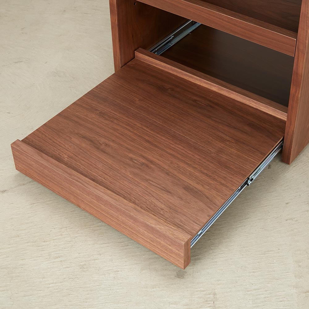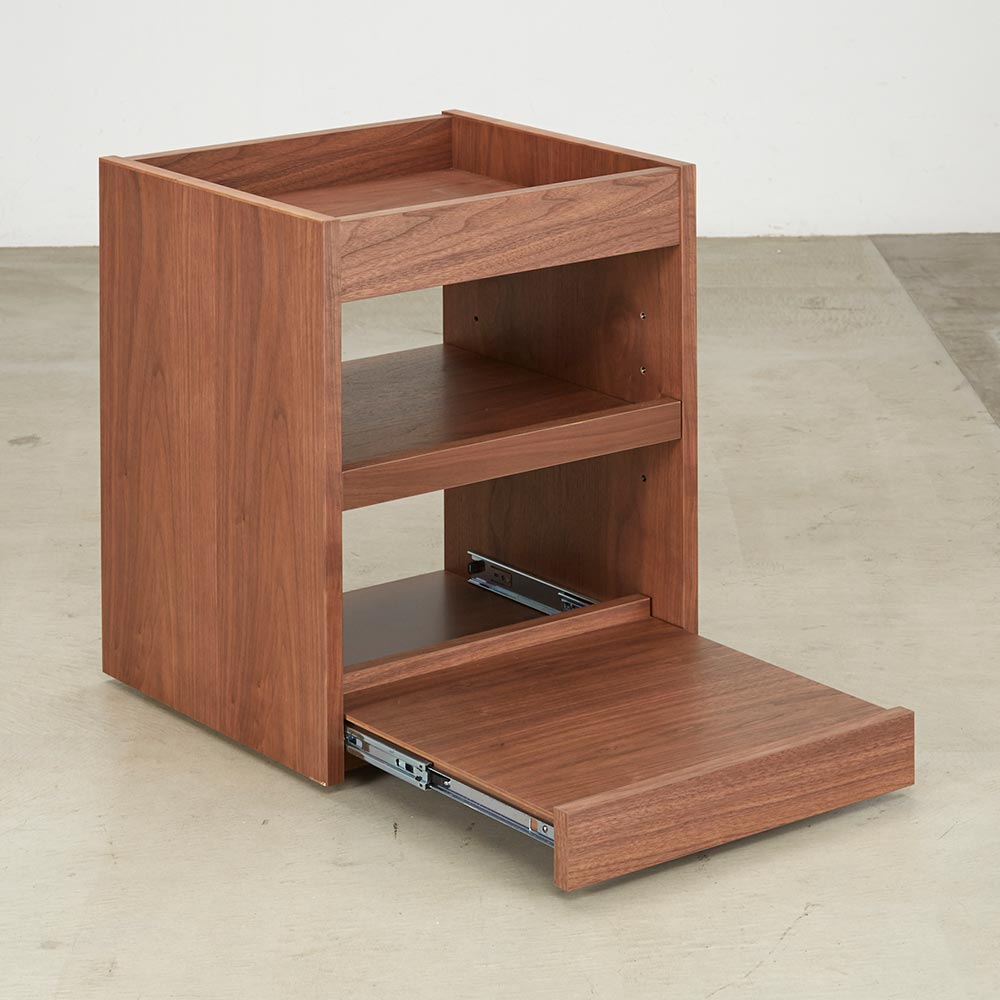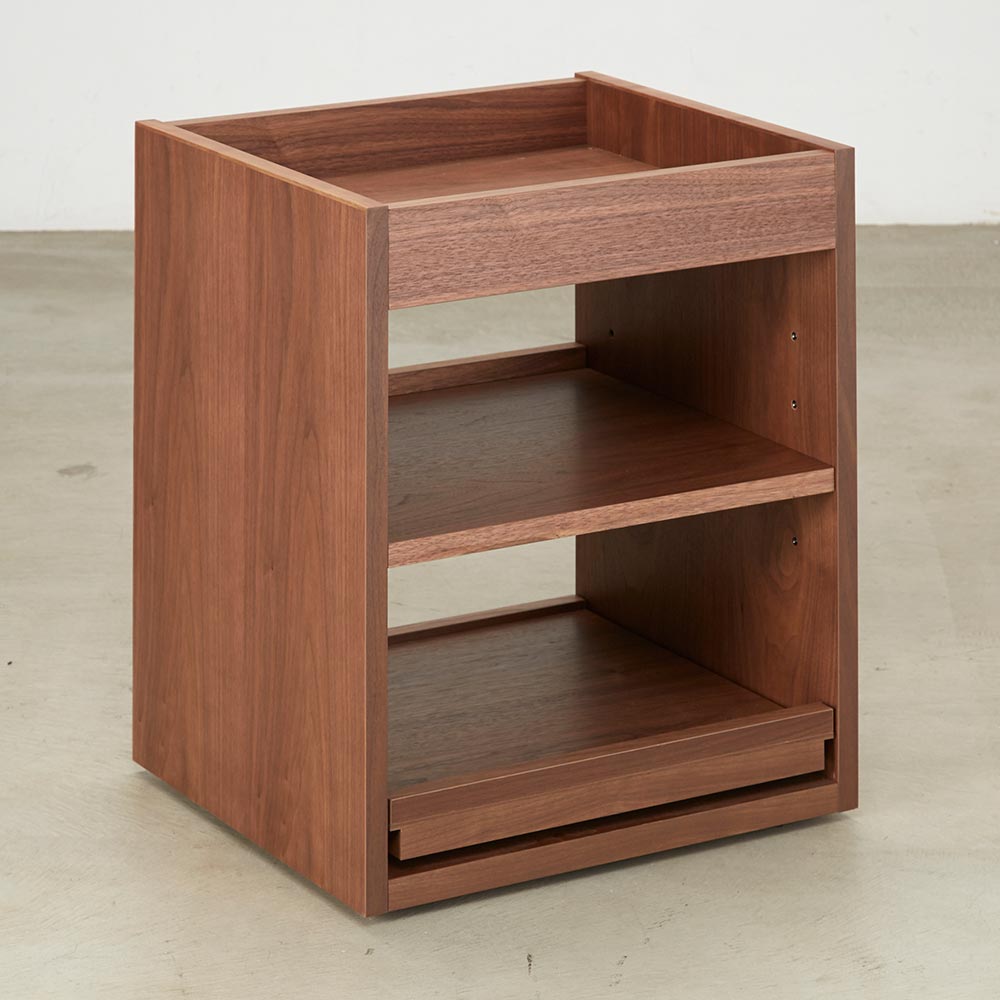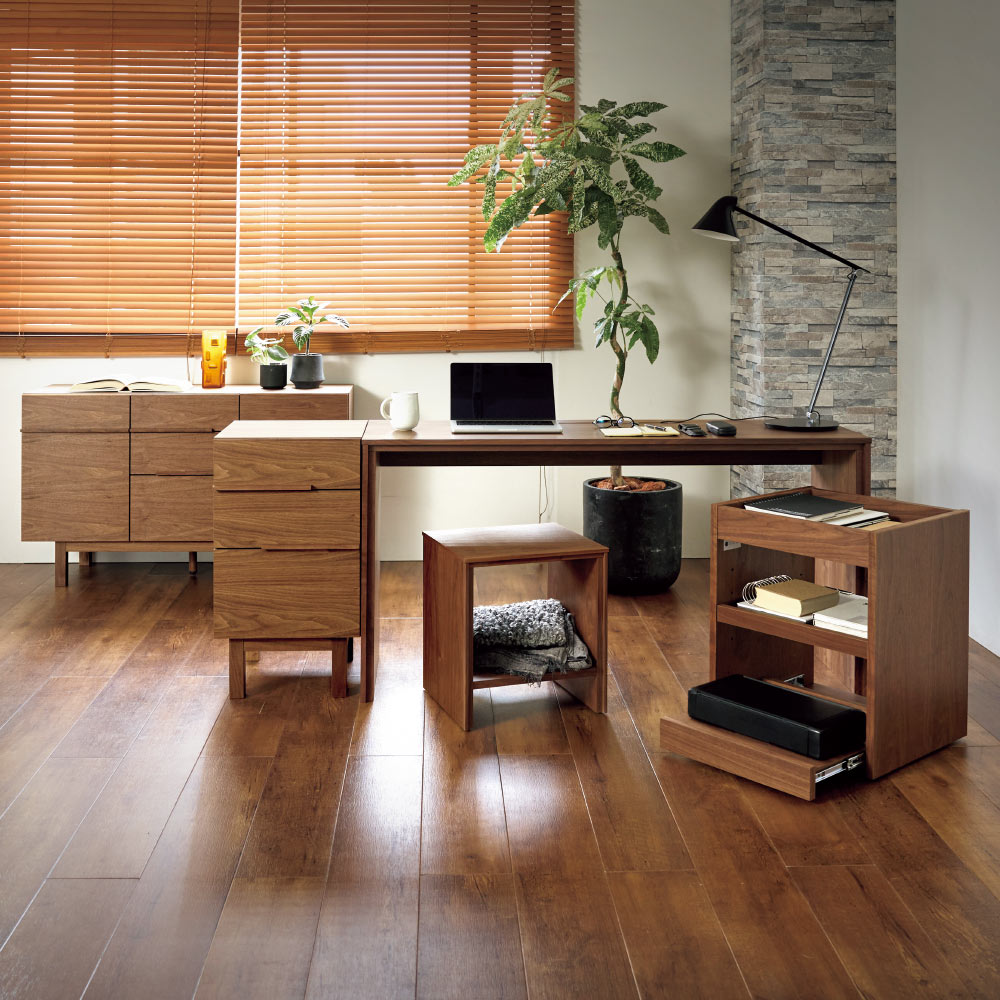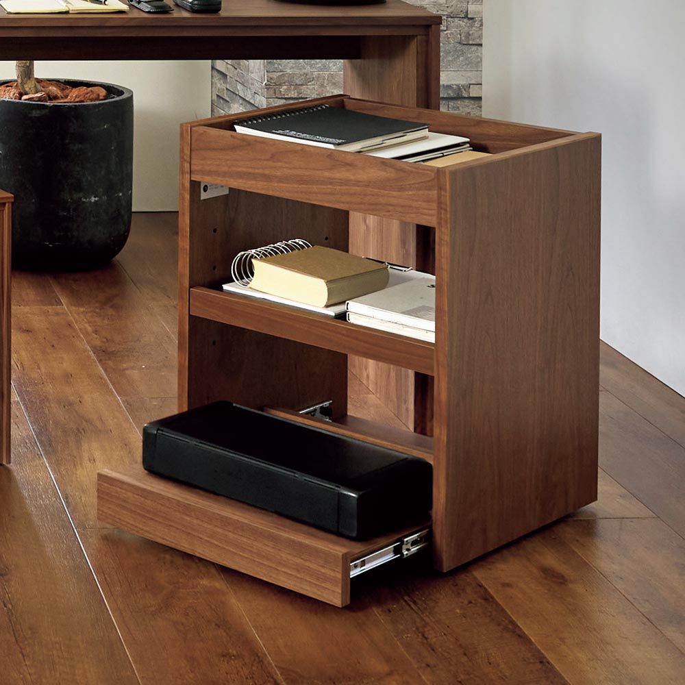 テイストを選ばず空間に馴染む、ミニマルで凛と美しい佇まい。デスクと合わせて使いたいキャスター付の便利なワゴン美しい洗練されたデザイン日本の「違い棚」から着想を得てデザインされたシリーズ。角部分は伝統技法・留め加工で丁寧に仕上げられています。留め加工とは45度に切り落としたパーツ同士を接合する加工のことを言います。留め加工にすることで接合部の溝が目立たなくなり、すっきりとした美しい見た目にすることができます。留め加工がもたらすメリットは大きい一方で、その加工には大変な技術を要します。アリニートシリーズは家具職人が1本1本丁寧に手仕事で仕上げています。別売りのデスクとセットで使うのがおすすめデスクの下に入るようにシリーズ設計されています。サイドワゴンの機能について360度回転する隠しキャスターがついており、スムーズに動かすことができます。下段の引き出しはスライドレールで開閉はスムーズ。プリンターなど設置しても便利に使えます。プリンターは機種ごとに本体サイズ、配線位置や給紙トレイ、排紙トレイの位置等も違いますが、このデスクワゴンなら多くの機種に対応可能です。デザインストーリー貴族から武士の時代へと移り変わっていった室町時代に、"新しい"住宅様式として"書院造"が登場しました。現代の和室や和風住宅にも多くの要素が受け継がれている"書院造"には、重要な構成要素として、床の間、違い棚、付書院、帳台構といったものがあります。これらの要素は、それまでスタンダードだった豪華絢爛な寝殿造から、情勢や暮らしの変化に合わせ、より実用的なものへとアップデートされたものばかりです。他にも雨戸、縁側、玄関といった今でも馴染み深い要素も書院造が発祥となっています。そんな書院造の"違い棚"という要素から着想を得て、時代に合わせて変化してきた用途やデザインを"現代の暮らし"に落とし込むことで、日本の伝統的な文化を感じ、伝えていくことができる"インテリア"として生まれました。