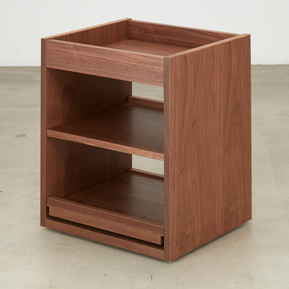 テイストを選ばず空間に馴染む、ミニマルで凛と美しい佇まい。デスクと合わせて使いたいキャスター付の便利なワゴン美しい洗練されたデザイン日本の「違い棚」から着想を得てデザインされたシリーズ。角部分は伝統技法・留め加工で丁寧に仕上げられています。留め加工とは45度に切り落としたパーツ同士を接合する加工のことを言います。留め加工にすることで接合部の溝が目立たなくなり、すっきりとした美しい見た目にすることができます。留め加工がもたらすメリットは大きい一方で、その加工には大変な技術を要します。アリニートシリーズは家具職人が1本1本丁寧に手仕事で仕上げています。別売りのデスクとセットで使うのがおすすめデスクの下に入るようにシリーズ設計されています。サイドワゴンの機能について360度回転する隠しキャスターがついており、スムーズに動かすことができます。下段の引き出しはスライドレールで開閉はスムーズ。プリンターなど設置しても便利に使えます。プリンターは機種ごとに本体サイズ、配線位置や給紙トレイ、排紙トレイの位置等も違いますが、このデスクワゴンなら多くの機種に対応可能です。デザインストーリー貴族から武士の時代へと移り変わっていった室町時代に、"新しい"住宅様式として"書院造"が登場しました。現代の和室や和風住宅にも多くの要素が受け継がれている"書院造"には、重要な構成要素として、床の間、違い棚、付書院、帳台構といったものがあります。これらの要素は、それまでスタンダードだった豪華絢爛な寝殿造から、情勢や暮らしの変化に合わせ、より実用的なものへとアップデートされたものばかりです。他にも雨戸、縁側、玄関といった今でも馴染み深い要素も書院造が発祥となっています。そんな書院造の"違い棚"という要素から着想を得て、時代に合わせて変化してきた用途やデザインを"現代の暮らし"に落とし込むことで、日本の伝統的な文化を感じ、伝えていくことができる"インテリア"として生まれました。