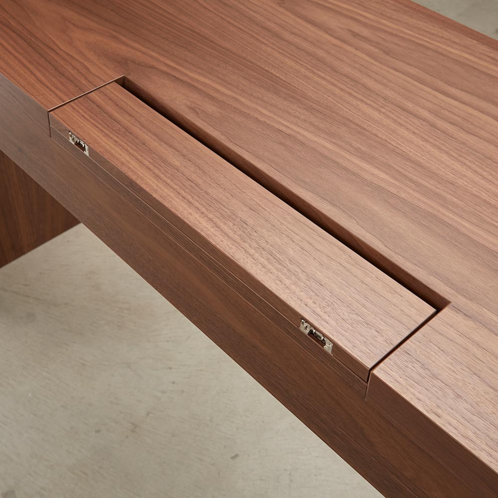 テイストを選ばず空間に馴染む、ミニマルで凛と美しい佇まい。シンプルながら美しいデザインのデスク美しい洗練されたデザイン日本の「違い棚」から着想を得てデザインされたシリーズ。角部分は伝統技法・留め加工で丁寧に仕上げられています。留め加工とは45度に切り落としたパーツ同士を接合する加工のことを言います。留め加工にすることで接合部の溝が目立たなくなり、すっきりとした美しい見た目にすることができます。留め加工がもたらすメリットは大きい一方で、その加工には大変な技術を要します。アリニートシリーズは家具職人が1本1本丁寧に手仕事で仕上げています。別売りのサイドチェストやデスクチェストとセットで使うのがおすすめデスクチェストは下に入るようにシリーズ設計されています。またサイドチェストやサイドボードは高さが揃うように設計されています。デスクの機能について背面にコードタップ収納を確保。上部より開閉できるので見た目もすっきり。デザインストーリー貴族から武士の時代へと移り変わっていった室町時代に、"新しい"住宅様式として"書院造"が登場しました。現代の和室や和風住宅にも多くの要素が受け継がれている"書院造"には、重要な構成要素として、床の間、違い棚、付書院、帳台構といったものがあります。これらの要素は、それまでスタンダードだった豪華絢爛な寝殿造から、情勢や暮らしの変化に合わせ、より実用的なものへとアップデートされたものばかりです。他にも雨戸、縁側、玄関といった今でも馴染み深い要素も書院造が発祥となっています。そんな書院造の"違い棚"という要素から着想を得て、時代に合わせて変化してきた用途やデザインを"現代の暮らし"に落とし込むことで、日本の伝統的な文化を感じ、伝えていくことができる"インテリア"として生まれました。