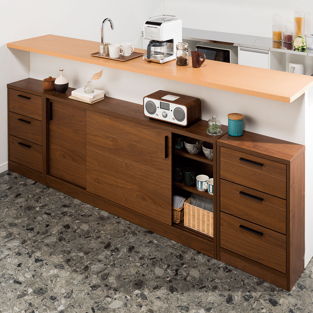 薄型の収納庫ながらたっぷりの収納ボリュームで、リビングダイニングがすっきり。食卓やソファから見える場所だからこそ、本物のウォルナットの木目とシャープなシルエットで美しさにもこだわりました。キッチンカウンター下のデッドスペースを収納に。インテリアを損なわない、こだわりの素材選びとデザイン性が魅力。何かとものが集まってしまうリビングダイニング。収納を増やしたいと思っても、なかなかスペースがない。そんな時に使えるデッドスペースがキッチンカウンターの下部分。薄型の収納庫ながらたっぷりの収納ボリュームで、リビングダイニングがすっきり。食卓やソファから見える場所だからこそ、本物のウォルナットの木目とシャープなシルエットで美しさにもこだわりました。木目の美しいウォルナット材を贅沢に使用したおしゃれな収納庫◆ウォルナット材には水・汚れに強いウレタン塗装を施しています。汚れもサッとひと拭き。◆ダイニングだけでなく、汚れのつきやすいキッチンでの使用も安心です。◆景観をそこねる食器やグラス、食品などを隠して収納できます。インテリアの一部としてこだわり開発・デザインしました。◆ナチュラルな空間が好きな方に、北欧風のお部屋コーディネートにもおすすめです。使う人の事を考え、細部にまでこだわった充実の機能性◆高さ70cmと87cm、100cmの3種類を用意しました。◆高さ70cmは、一般的なダイニングテーブルの高さに合わせており、テーブルの延長上でフラットにお使いいただけます。◆幅木よけカット(高さ9.5cm×奥行1cm)で壁面にピッタリ設置できます。◆天板耐荷重は10kgです。◆可動収納棚板の耐荷重は5kgです。キッチンカウンター下にピッタリな奥行で空間を有効活用できるアイデア収納。◆薄型収納で、キッチンカウンター下のデッドスペースにもピッタリ収まります。◆薄型でも収納力たっぷり。中皿や小鉢、買い置きの缶詰や瓶詰をまとめて、食器棚・キッチンストッカーとしてもお勧めの隙間収納です。奥行浅めの薄型収納は、設置場所を選ばずリビング収納・書棚としても。◆薄型収納は窓下や廊下・リビングの空きスペースなど、カウンター下以外のデッドスペースも有効活用できます。◆廊下や寝室などの窓下に設置して書斎・本棚に収まりきらない雑誌収納やCD収納、DVD収納としても。◆リビングの窓下などに設置すれば、FAX台や電話台、ローボード・窓下収納としても活躍。リビングに散らばりがちな小物、生活雑貨をまとめて。面倒な組み立てのいらない完成商品◆完成品でのお届けになります。届いたその日からお使い頂けます。◆取っ手の取付のみでご使用前の準備は簡単。安心と信頼の職人技が光る国産のキッチン収納◆熟練の家具職人がひとつずつ丁寧に仕上げたワンランク上のダイニングボード・食器棚です。◆細部の丁寧な仕上がりなど日本製ならではの高品質なキッチンボード・カップボードをお楽しみください。