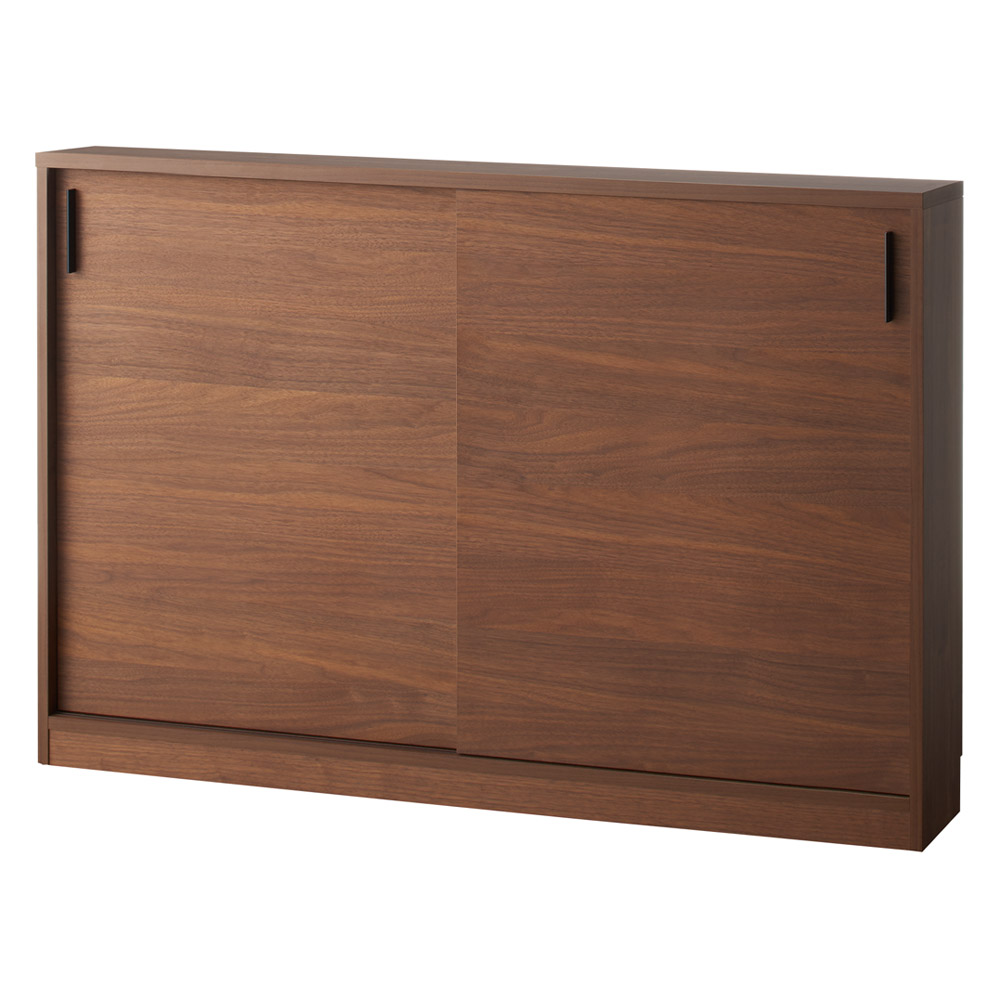 コーディネート例【シリーズ商品使用イメージ】 本物のウォルナットの木目が美しい、重厚感のある薄型収納庫。