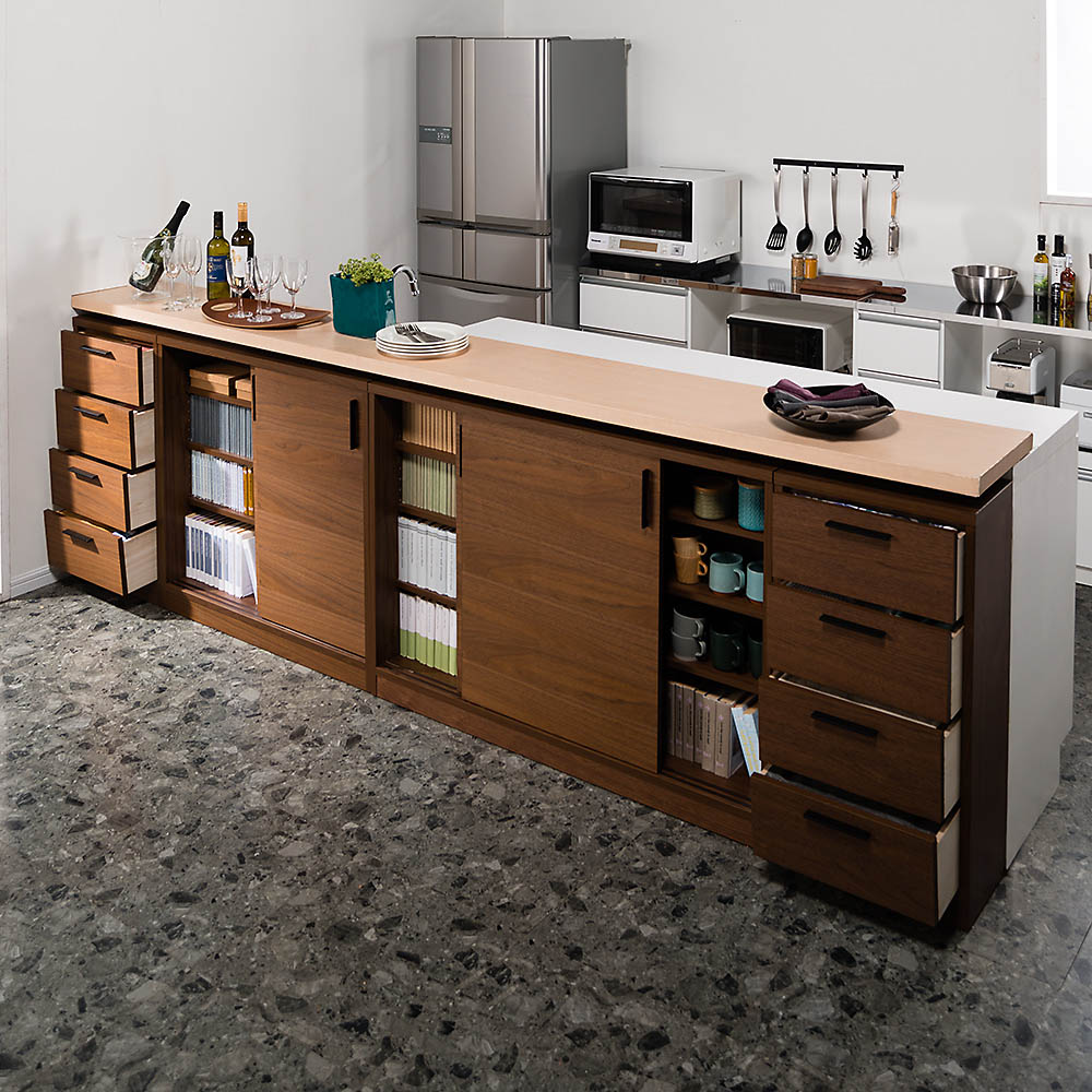 薄型の収納庫ながらたっぷりの収納ボリュームで、リビングダイニングがすっきり。食卓やソファから見える場所だからこそ、本物のウォルナットの木目とシャープなシルエットで美しさにもこだわりました。キッチンカウンター下のデッドスペースを収納に。インテリアを損なわない、こだわりの素材選びとデザイン性が魅力。何かとものが集まってしまうリビングダイニング。収納を増やしたいと思っても、なかなかスペースがない。そんな時に使えるデッドスペースがキッチンカウンターの下部分。薄型の収納庫ながらたっぷりの収納ボリュームで、リビングダイニングがすっきり。食卓やソファから見える場所だからこそ、本物のウォルナットの木目とシャープなシルエットで美しさにもこだわりました。木目の美しいウォルナット材を贅沢に使用したおしゃれな収納庫◆ウォルナット材には水・汚れに強いウレタン塗装を施しています。汚れもサッとひと拭き。◆ダイニングだけでなく、汚れのつきやすいキッチンでの使用も安心です。◆景観をそこねる食器やグラス、食品などを隠して収納できます。インテリアの一部としてこだわり開発・デザインしました。◆ナチュラルな空間が好きな方に、北欧風のお部屋コーディネートにもおすすめです。使う人の事を考え、細部にまでこだわった充実の機能性◆高さ70cmと87cm、100cmの3種類を用意しました。◆高さ70cmは、一般的なダイニングテーブルの高さに合わせており、テーブルの延長上でフラットにお使いいただけます。◆幅木よけカット(高さ9.5cm×奥行1cm)で壁面にピッタリ設置できます。◆天板耐荷重は10kgです。◆可動収納棚板の耐荷重は5kgです。キッチンカウンター下にピッタリな奥行で空間を有効活用できるアイデア収納。◆薄型収納で、キッチンカウンター下のデッドスペースにもピッタリ収まります。◆薄型でも収納力たっぷり。中皿や小鉢、買い置きの缶詰や瓶詰をまとめて、食器棚・キッチンストッカーとしてもお勧めの隙間収納です。奥行浅めの薄型収納は、設置場所を選ばずリビング収納・書棚としても。◆薄型収納は窓下や廊下・リビングの空きスペースなど、カウンター下以外のデッドスペースも有効活用できます。◆廊下や寝室などの窓下に設置して書斎・本棚に収まりきらない雑誌収納やCD収納、DVD収納としても。◆リビングの窓下などに設置すれば、FAX台や電話台、ローボード・窓下収納としても活躍。リビングに散らばりがちな小物、生活雑貨をまとめて。面倒な組み立てのいらない完成商品◆完成品でのお届けになります。届いたその日からお使い頂けます。◆取っ手の取付のみでご使用前の準備は簡単。安心と信頼の職人技が光る国産のキッチン収納◆熟練の家具職人がひとつずつ丁寧に仕上げたワンランク上のダイニングボード・食器棚です。◆細部の丁寧な仕上がりなど日本製ならではの高品質なキッチンボード・カップボードをお楽しみください。
