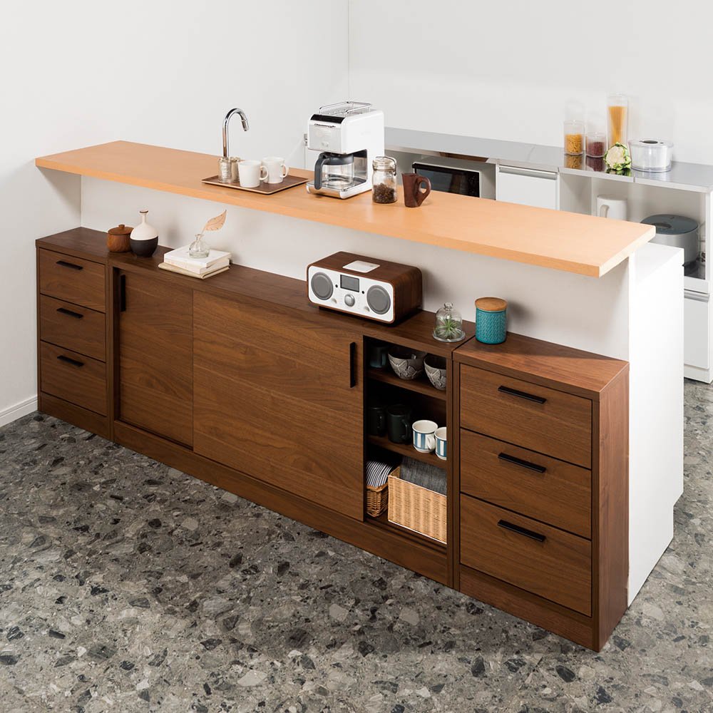 薄型の収納庫ながらたっぷりの収納ボリュームで、リビングダイニングがすっきり。食卓やソファから見える場所だからこそ、本物のウォルナットの木目とシャープなシルエットで美しさにもこだわりました。キッチンカウンター下のデッドスペースを収納に。インテリアを損なわない、こだわりの素材選びとデザイン性が魅力。何かとものが集まってしまうリビングダイニング。収納を増やしたいと思っても、なかなかスペースがない。そんな時に使えるデッドスペースがキッチンカウンターの下部分。薄型の収納庫ながらたっぷりの収納ボリュームで、リビングダイニングがすっきり。食卓やソファから見える場所だからこそ、本物のウォルナットの木目とシャープなシルエットで美しさにもこだわりました。木目の美しいウォルナット材を贅沢に使用したおしゃれな収納庫◆ウォルナット材には水・汚れに強いウレタン塗装を施しています。汚れもサッとひと拭き。◆ダイニングだけでなく、汚れのつきやすいキッチンでの使用も安心です。◆景観をそこねる食器やグラス、食品などを隠して収納できます。インテリアの一部としてこだわり開発・デザインしました。◆ナチュラルな空間が好きな方に、北欧風のお部屋コーディネートにもおすすめです。使う人の事を考え、細部にまでこだわった充実の機能性◆高さ70cmと87cm、100cmの3種類を用意しました。◆高さ70cmは、一般的なダイニングテーブルの高さに合わせており、テーブルの延長上でフラットにお使いいただけます。◆幅木よけカット(高さ9.5cm×奥行1cm)で壁面にピッタリ設置できます。◆天板耐荷重は10kgです。◆可動収納棚板の耐荷重は5kgです。キッチンカウンター下にピッタリな奥行で空間を有効活用できるアイデア収納。◆薄型収納で、キッチンカウンター下のデッドスペースにもピッタリ収まります。◆薄型でも収納力たっぷり。中皿や小鉢、買い置きの缶詰や瓶詰をまとめて、食器棚・キッチンストッカーとしてもお勧めの隙間収納です。奥行浅めの薄型収納は、設置場所を選ばずリビング収納・書棚としても。◆薄型収納は窓下や廊下・リビングの空きスペースなど、カウンター下以外のデッドスペースも有効活用できます。◆廊下や寝室などの窓下に設置して書斎・本棚に収まりきらない雑誌収納やCD収納、DVD収納としても。◆リビングの窓下などに設置すれば、FAX台や電話台、ローボード・窓下収納としても活躍。リビングに散らばりがちな小物、生活雑貨をまとめて。面倒な組み立てのいらない完成商品◆完成品でのお届けになります。届いたその日からお使い頂けます。◆取っ手の取付のみでご使用前の準備は簡単。安心と信頼の職人技が光る国産のキッチン収納◆熟練の家具職人がひとつずつ丁寧に仕上げたワンランク上のダイニングボード・食器棚です。◆細部の丁寧な仕上がりなど日本製ならではの高品質なキッチンボード・カップボードをお楽しみください。