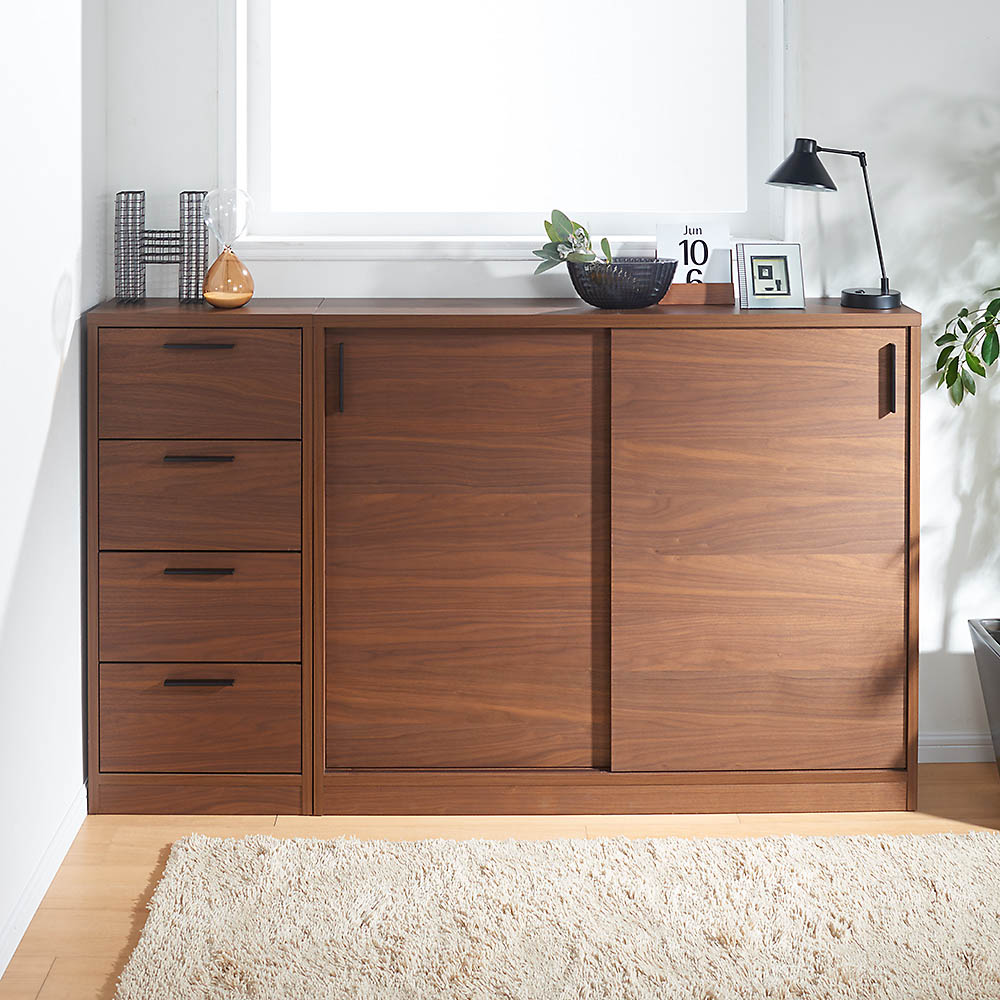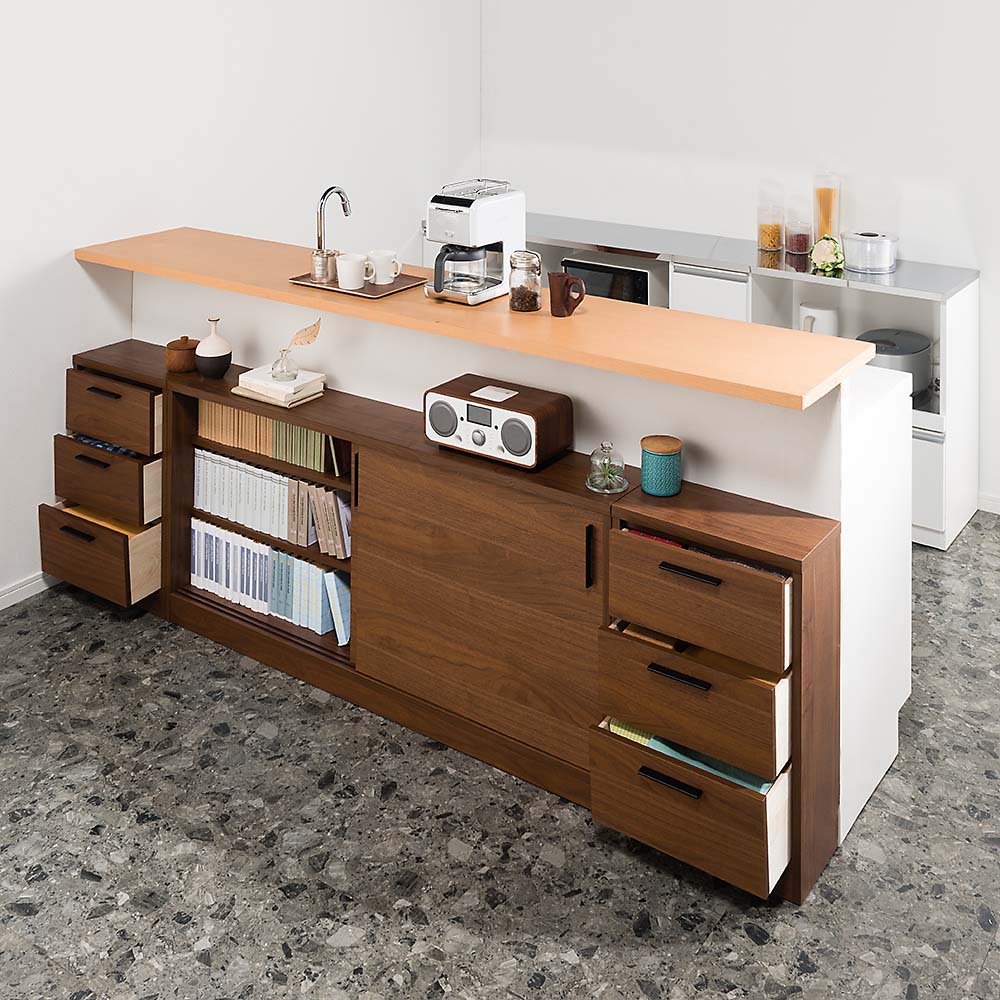薄型の収納庫ながらたっぷりの収納ボリュームで、リビングダイニングがすっきり。食卓やソファから見える場所だからこそ、本物のウォルナットの木目とシャープなシルエットで美しさにもこだわりました。キッチンカウンター下のデッドスペースを収納に。インテリアを損なわない、こだわりの素材選びとデザイン性が魅力。何かとものが集まってしまうリビングダイニング。収納を増やしたいと思っても、なかなかスペースがない。そんな時に使えるデッドスペースがキッチンカウンターの下部分。薄型の収納庫ながらたっぷりの収納ボリュームで、リビングダイニングがすっきり。食卓やソファから見える場所だからこそ、本物のウォルナットの木目とシャープなシルエットで美しさにもこだわりました。木目の美しいウォルナット材を贅沢に使用したおしゃれな収納庫◆ウォルナット材には水・汚れに強いウレタン塗装を施しています。汚れもサッとひと拭き。◆ダイニングだけでなく、汚れのつきやすいキッチンでの使用も安心です。◆景観をそこねる食器やグラス、食品などを隠して収納できます。インテリアの一部としてこだわり開発・デザインしました。◆ナチュラルな空間が好きな方に、北欧風のお部屋コーディネートにもおすすめです。使う人の事を考え、細部にまでこだわった充実の機能性◆高さ70cmと87cm、100cmの3種類を用意しました。◆高さ70cmは、一般的なダイニングテーブルの高さに合わせており、テーブルの延長上でフラットにお使いいただけます。◆幅木よけカット(高さ9.5cm×奥行1cm)で壁面にピッタリ設置できます。◆天板耐荷重は10kgです。◆可動収納棚板の耐荷重は5kgです。キッチンカウンター下にピッタリな奥行で空間を有効活用できるアイデア収納。◆薄型収納で、キッチンカウンター下のデッドスペースにもピッタリ収まります。◆薄型でも収納力たっぷり。中皿や小鉢、買い置きの缶詰や瓶詰をまとめて、食器棚・キッチンストッカーとしてもお勧めの隙間収納です。奥行浅めの薄型収納は、設置場所を選ばずリビング収納・書棚としても。◆薄型収納は窓下や廊下・リビングの空きスペースなど、カウンター下以外のデッドスペースも有効活用できます。◆廊下や寝室などの窓下に設置して書斎・本棚に収まりきらない雑誌収納やCD収納、DVD収納としても。◆リビングの窓下などに設置すれば、FAX台や電話台、ローボード・窓下収納としても活躍。リビングに散らばりがちな小物、生活雑貨をまとめて。面倒な組み立てのいらない完成商品◆完成品でのお届けになります。届いたその日からお使い頂けます。◆取っ手の取付のみでご使用前の準備は簡単。安心と信頼の職人技が光る国産のキッチン収納◆熟練の家具職人がひとつずつ丁寧に仕上げたワンランク上のダイニングボード・食器棚です。◆細部の丁寧な仕上がりなど日本製ならではの高品質なキッチンボード・カップボードをお楽しみください。