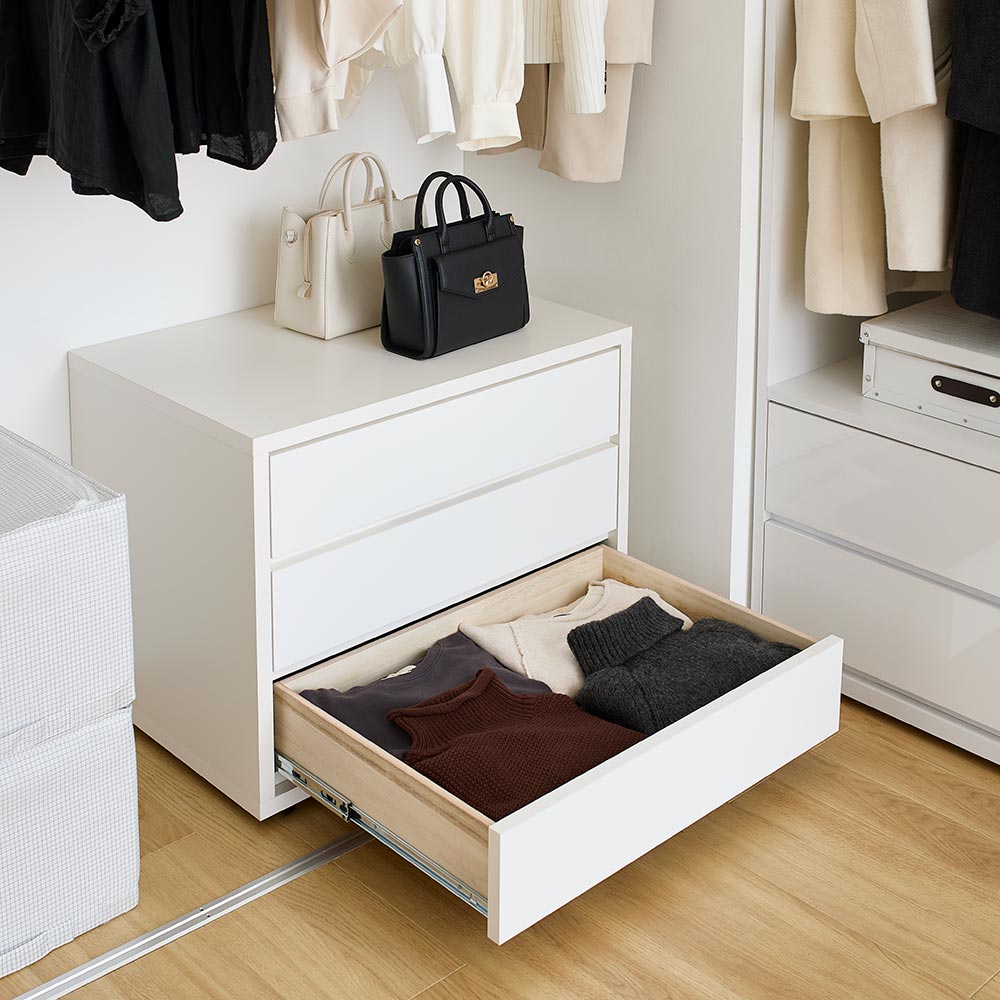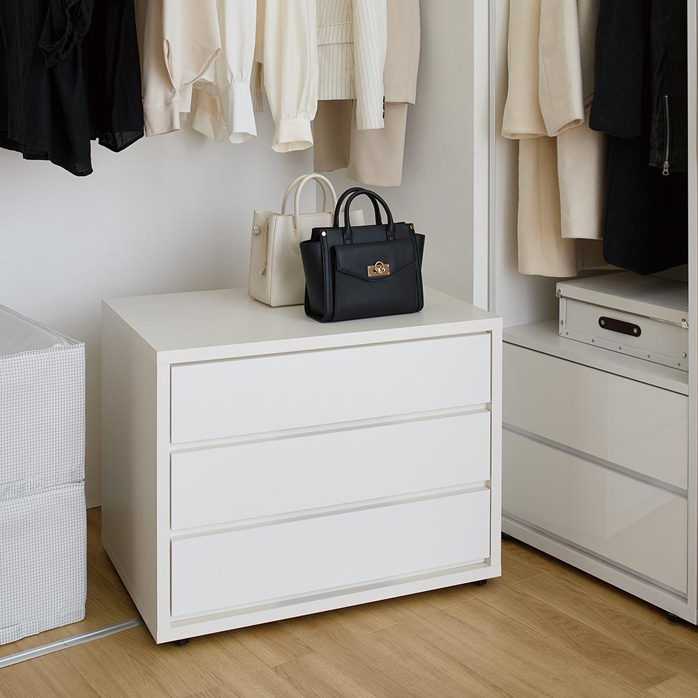 シンプルスタイリッシュなルックスと裏面化粧仕上げでリビングでも見映え。●幅は75・90cm、奥行は40・50cm、高さは57cm(引き出し3段)・73.5cm(引き出し4段)から選べるキャスター付きクローゼットチェストです。●隠しキャスター前2ヶ所ストッパー付きで、安心です。●引き出し全段フルスライドレール仕様で、スムーズに開閉できます。●シンプルなデザインで裏面も化粧仕上げなのでリビングチェストとしても活躍します。●引き出し内寸:幅64.5、高さ9.5、奥行33.5cm●引き出しを最大に引き出した際の本体を含めた全体奥行は奥行40タイプで約75cm、奥行50タイプで約95cmとなります